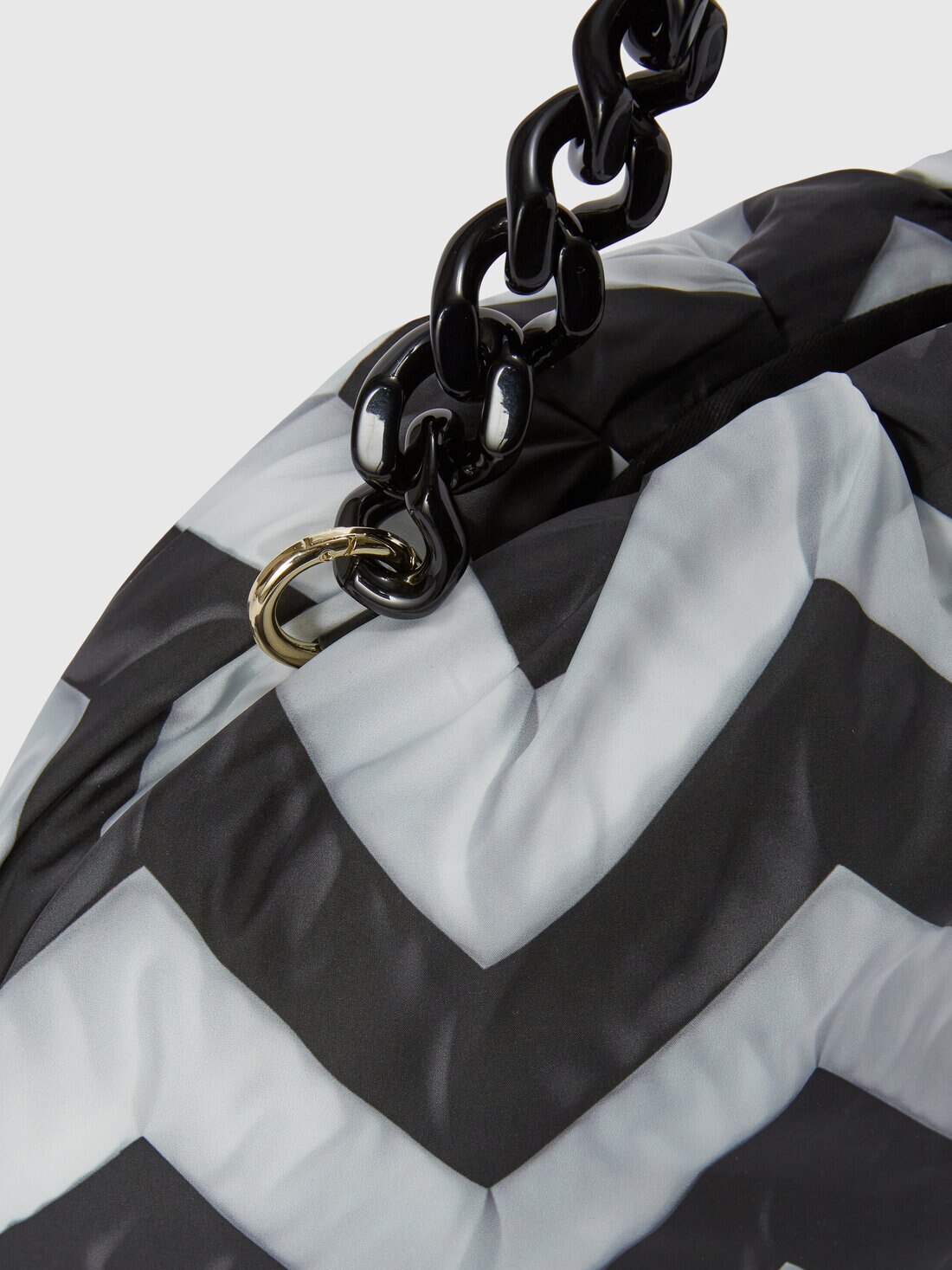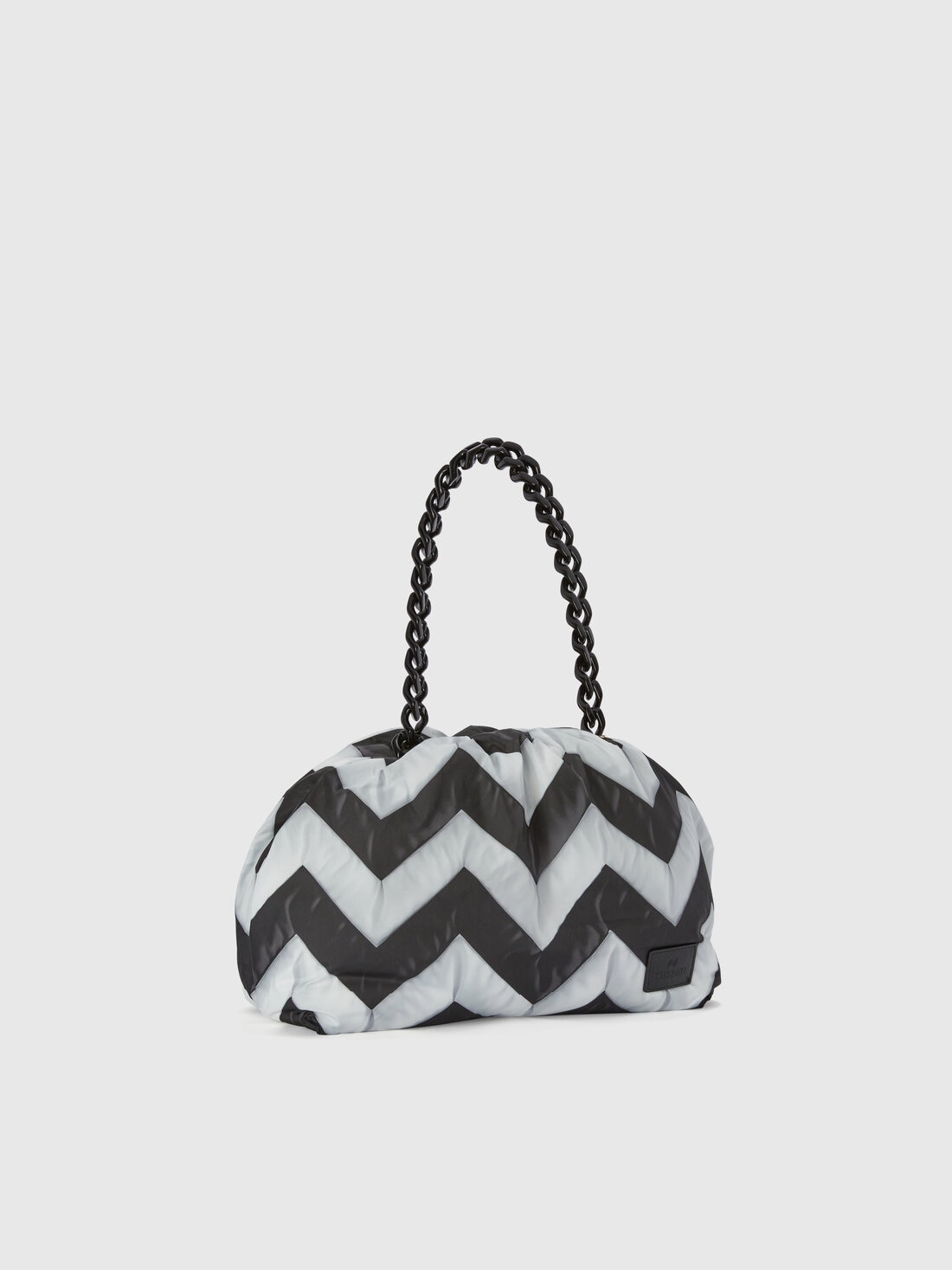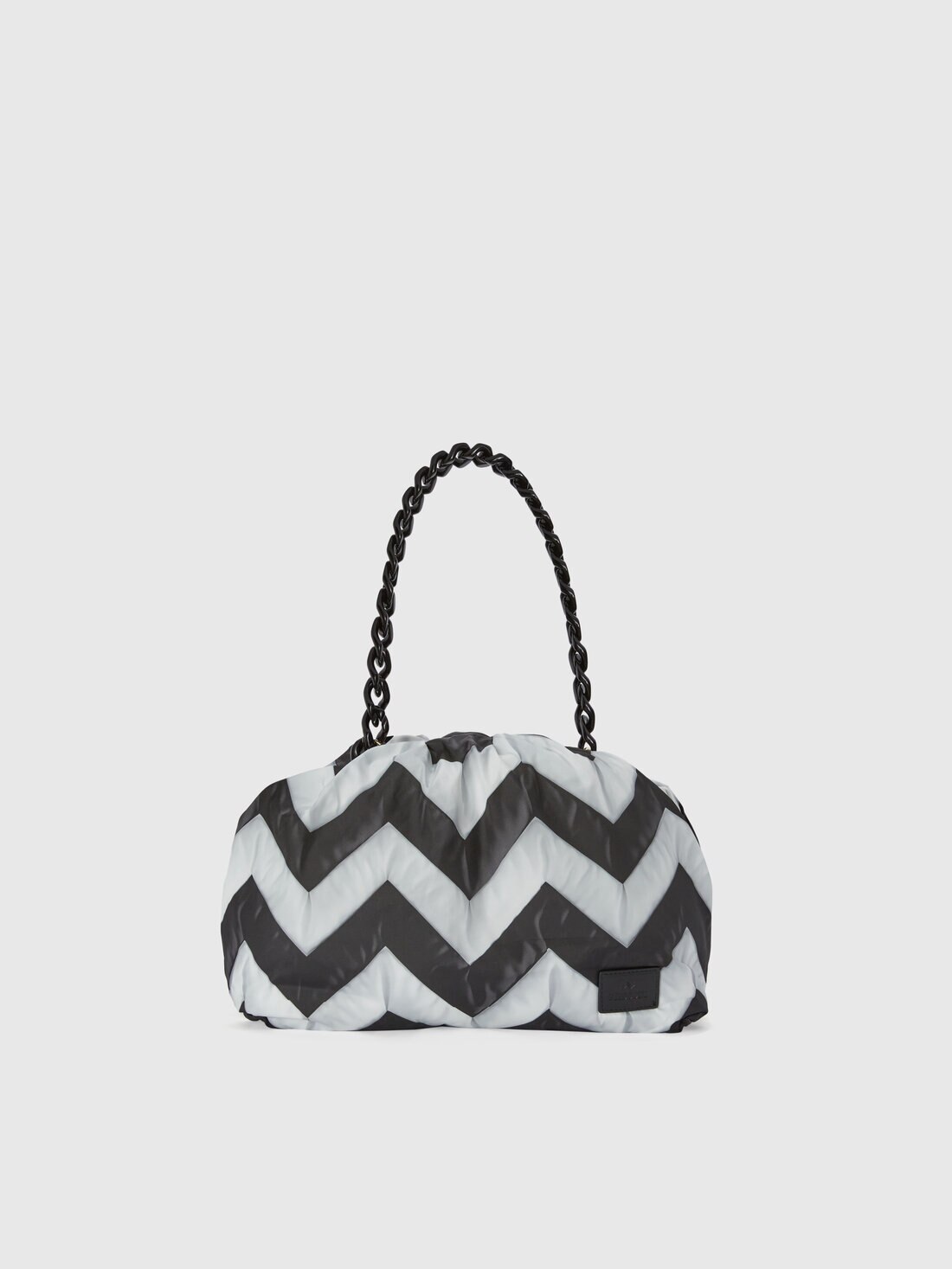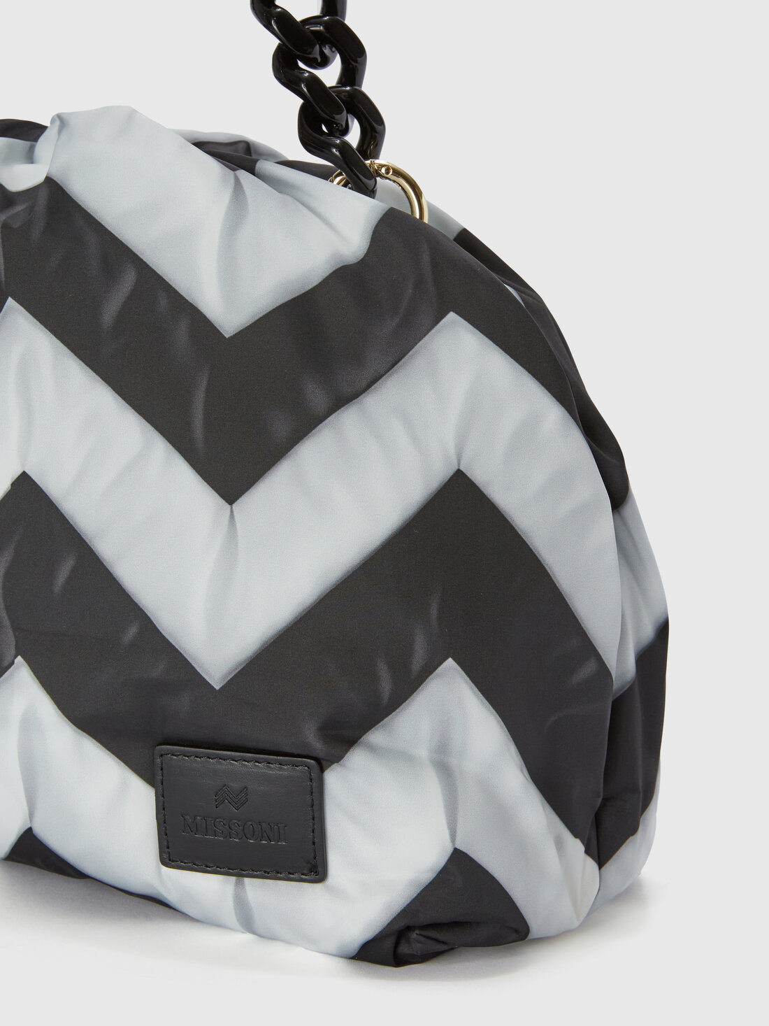 A rounded and soft shape, as versatile as it is iconic, for this women's clutch in zig zag fabric. The accessory, customized with the leather logo patch, is enriched by the removable resin chain shoulder strap.