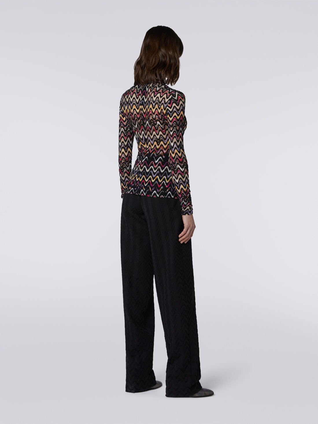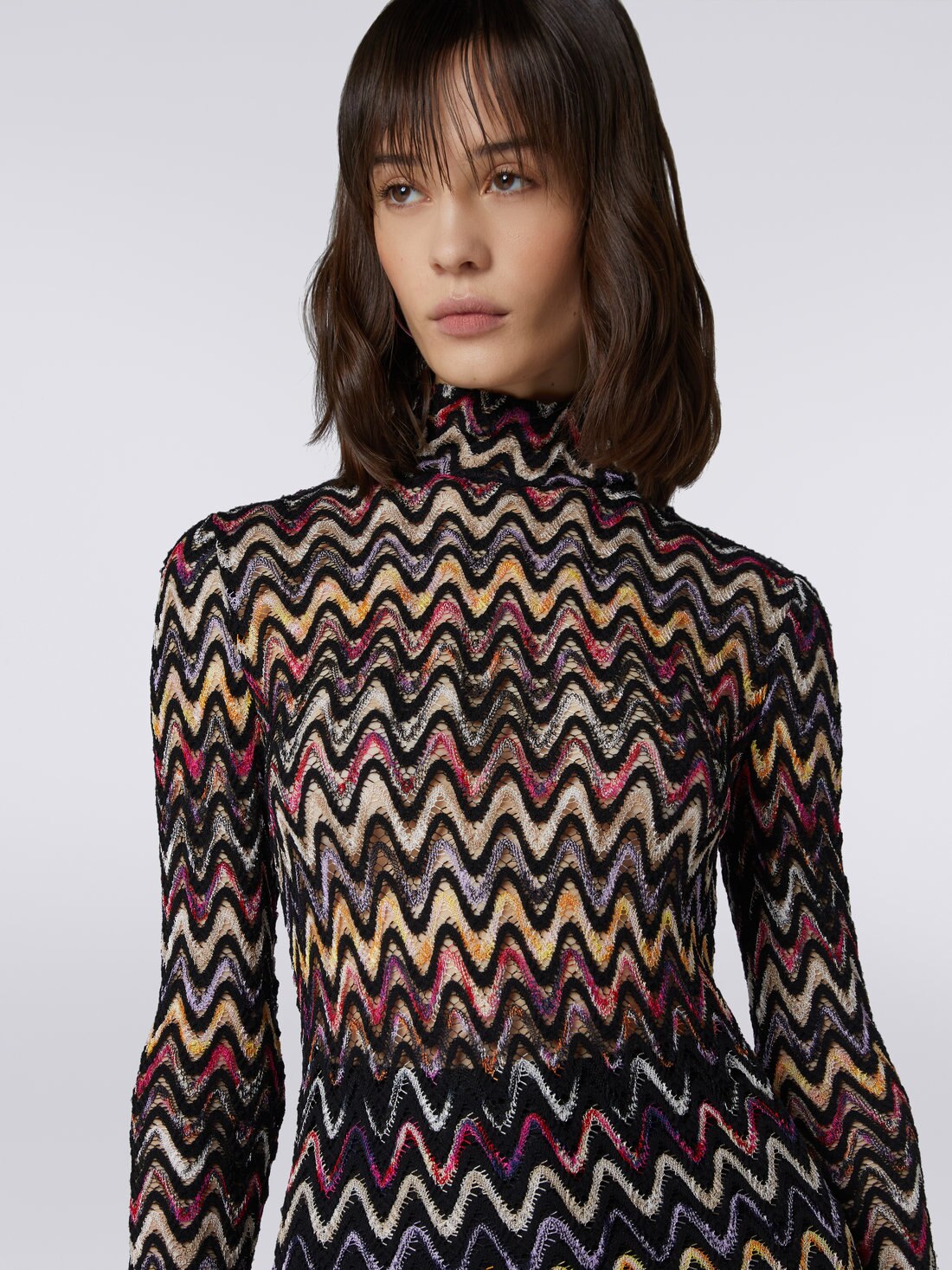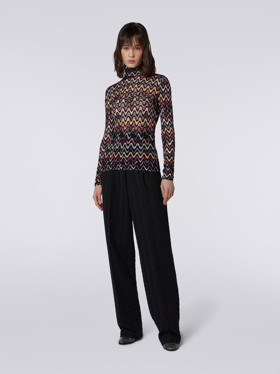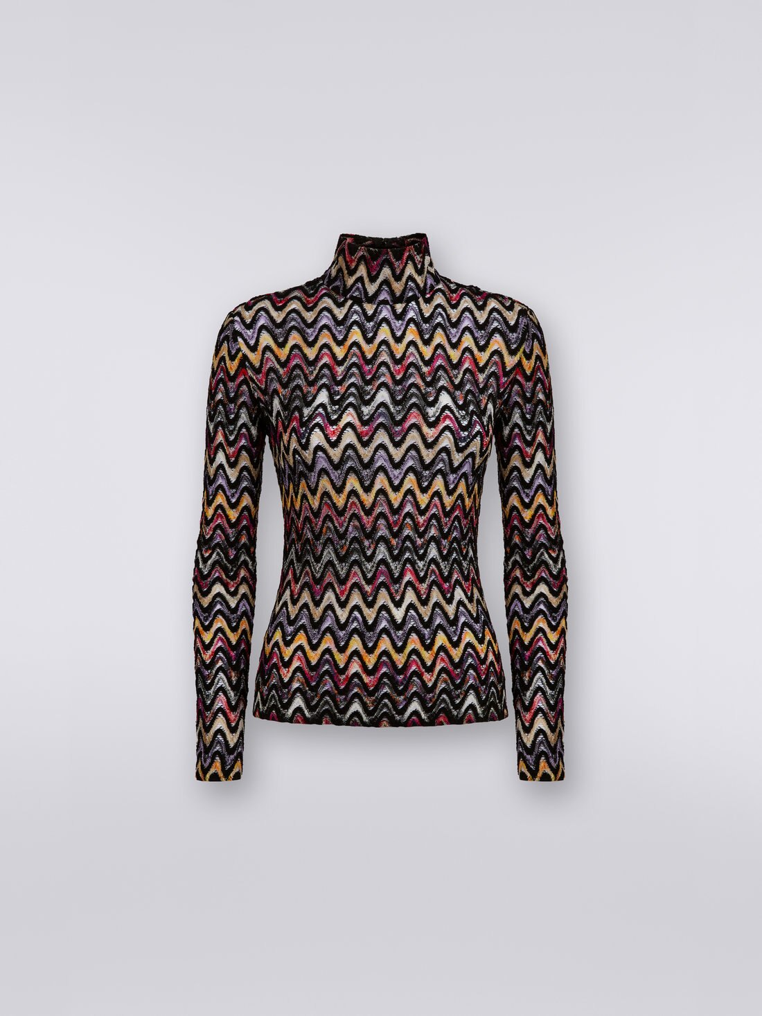 The Missoni women’s viscose and wool turtleneck jumper is a fusion of elegance and originality. The garment sports an eye-catchingly vivid and intricate multicoloured zigzag pattern. The lace-effect raschel knit gives the jumper a touch of sophistication that makes it suitable for both special occasions and a distinctive everyday look.