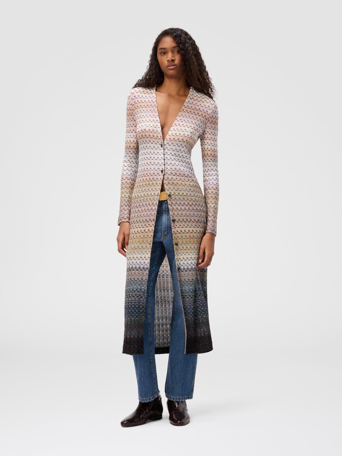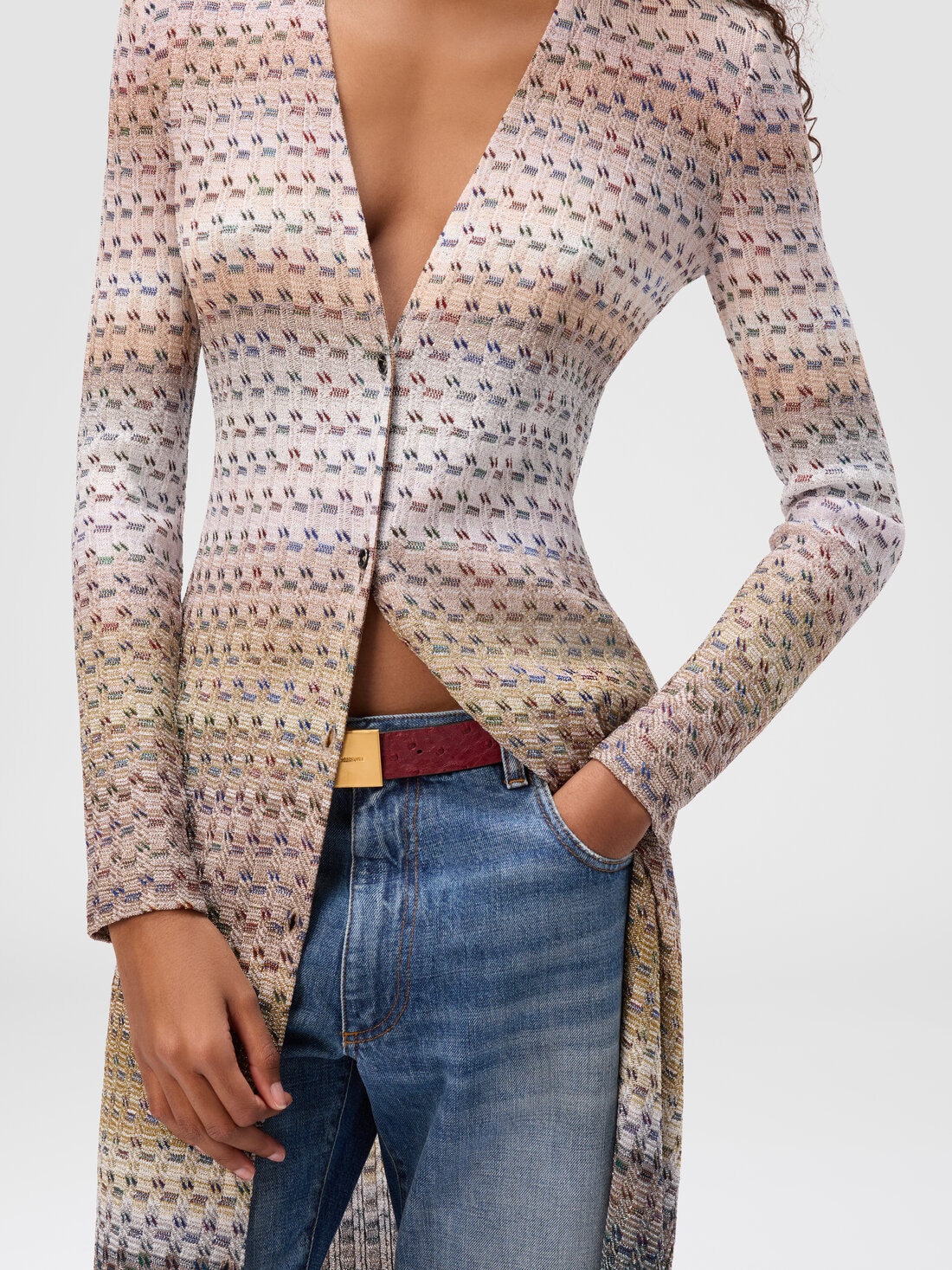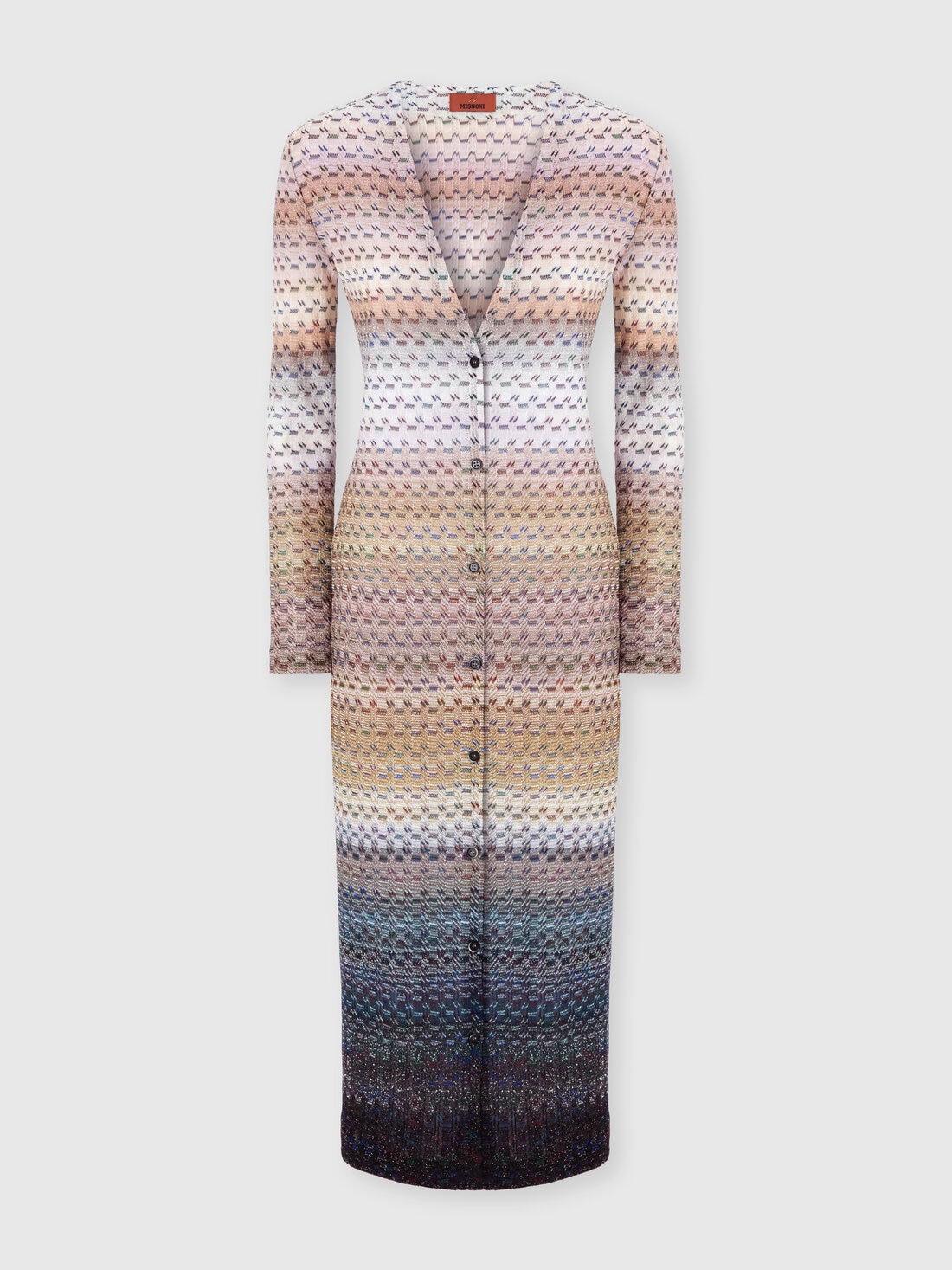 Long women’s cardigan with V-neck and buttons, made in a refined offset raschel knit that creates a dynamic, sophisticated texture. The viscose blend with lamé threads lends subtle shine, while the flowing cut and deep V-neck enhance the silhouette with elegance.