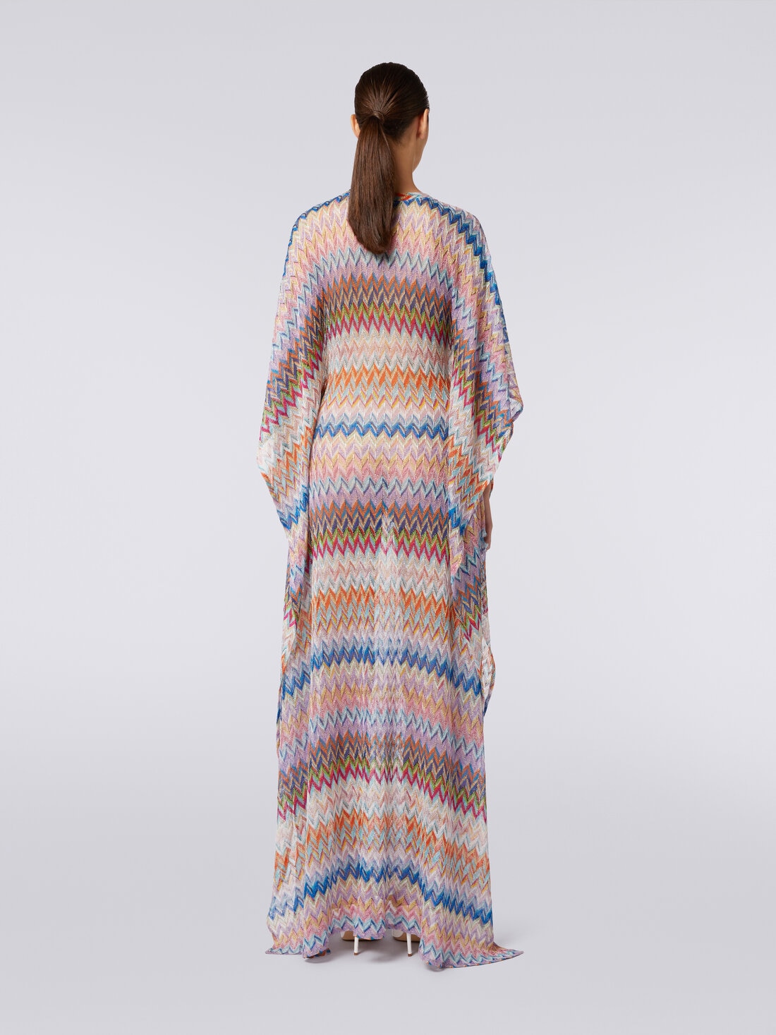 A floaty viscose-blend knit, decorated with bright lurex threads, characterises the women's cover-up. The loose, foot-length Kaftan model is outlined by the deep V-neckline.