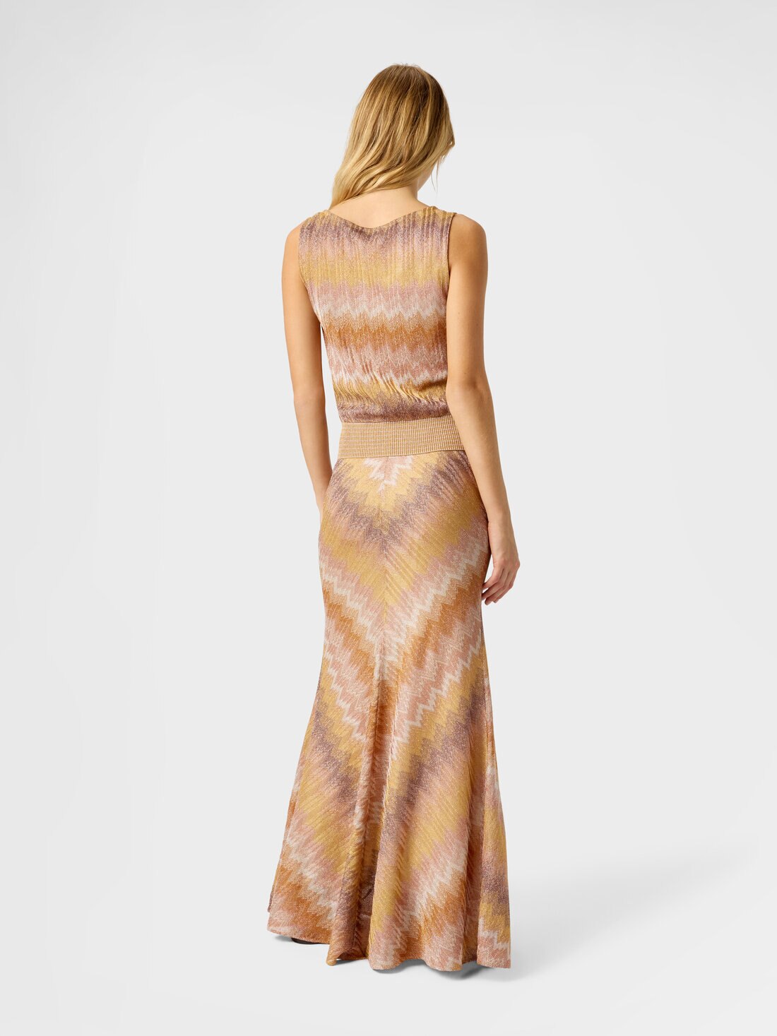 Women’s tank top in lamé viscose with raschel knit and snake pattern, finished with a ribbed trim. A model that expresses Missoni’s artisanal mastery through a refined balance of light and texture.