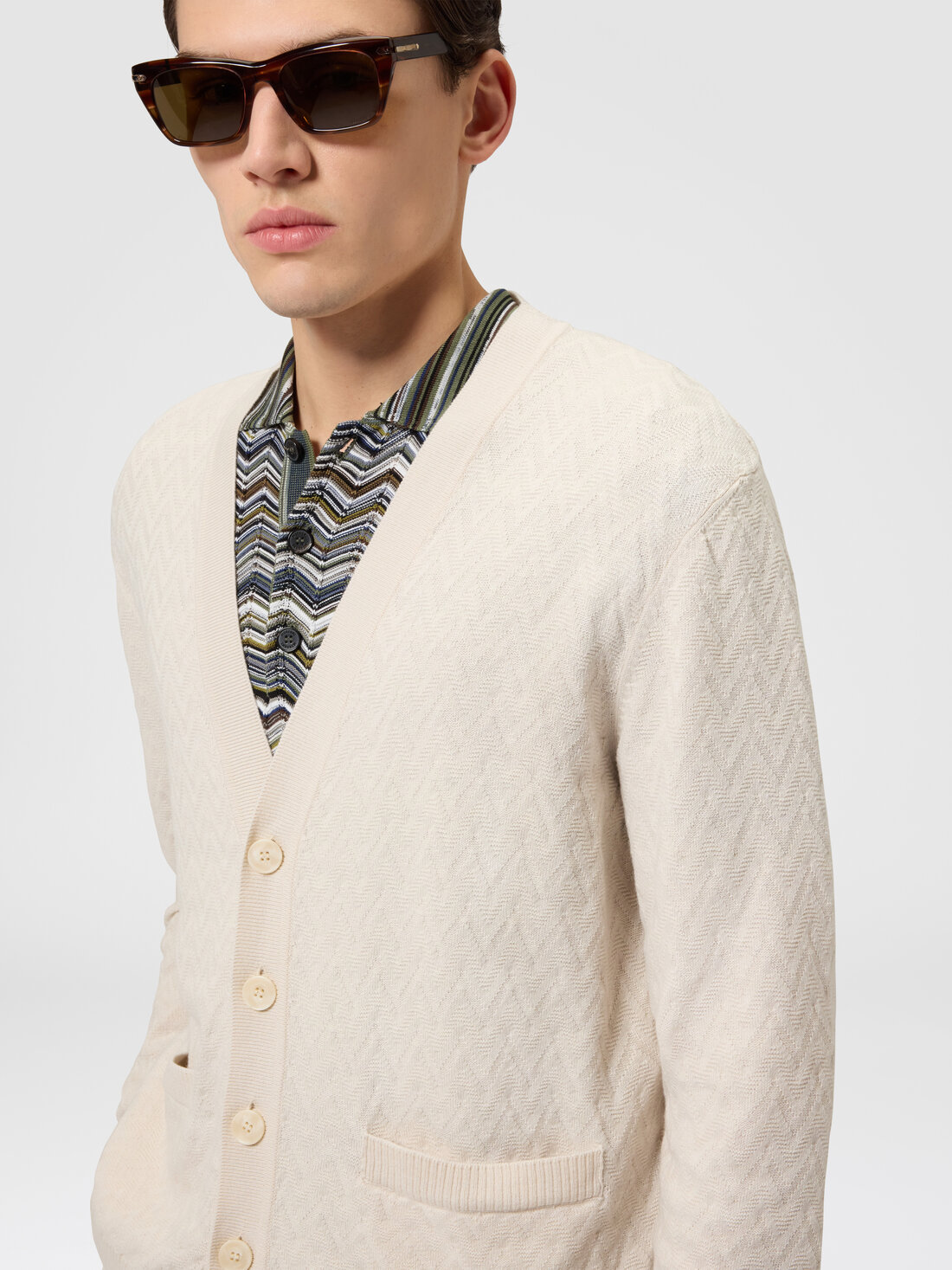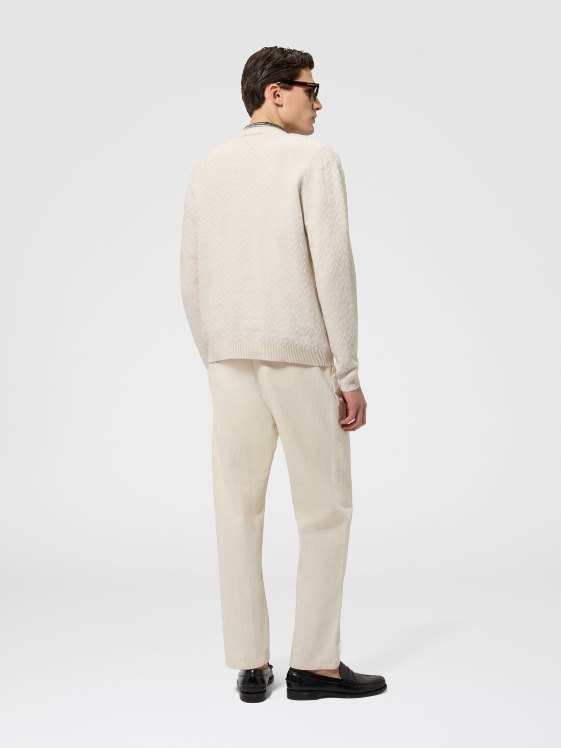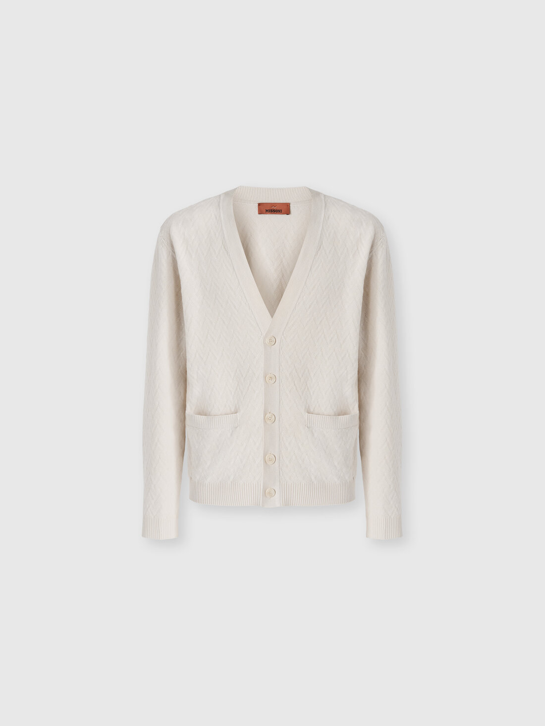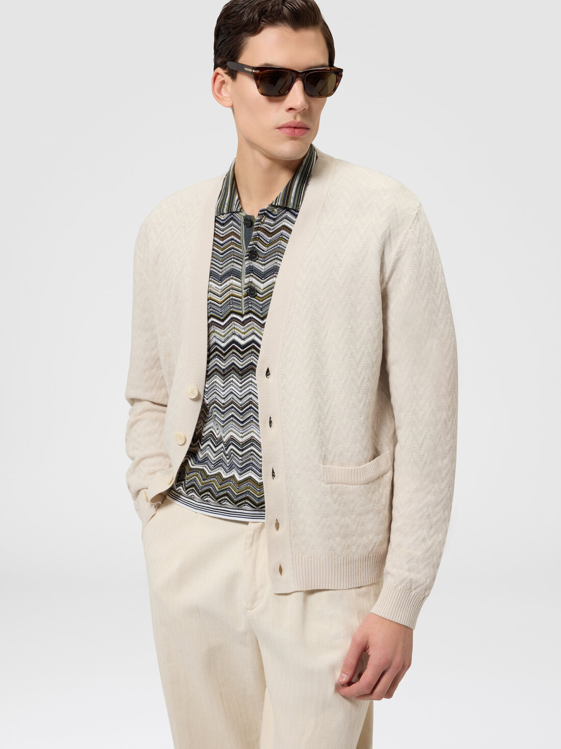 Made from a soft blend of wool and cotton, this men’s cardigan is characterized by a chevron pattern that highlights its identity. The front pockets complete the design, expressing the refined elegance of the maison.