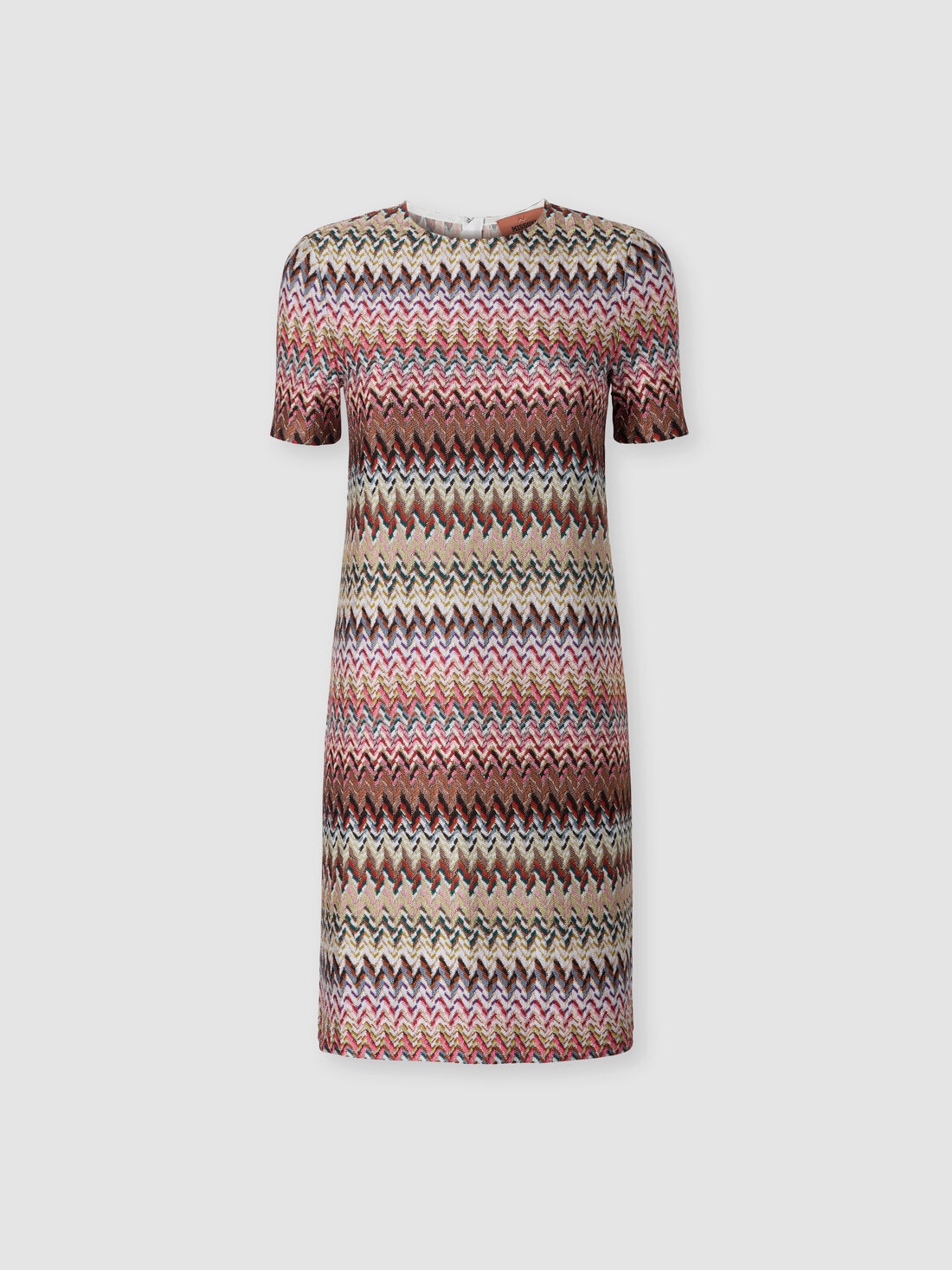 This women's viscose blend dress with lamé filaments stands out for its raschel weave with a zigzag pattern, an icon of Missoni style. The half-sleeved, straight-cut design is a classic reinterpreted with a distinctive touch, combining elegance and personality for any occasion.
