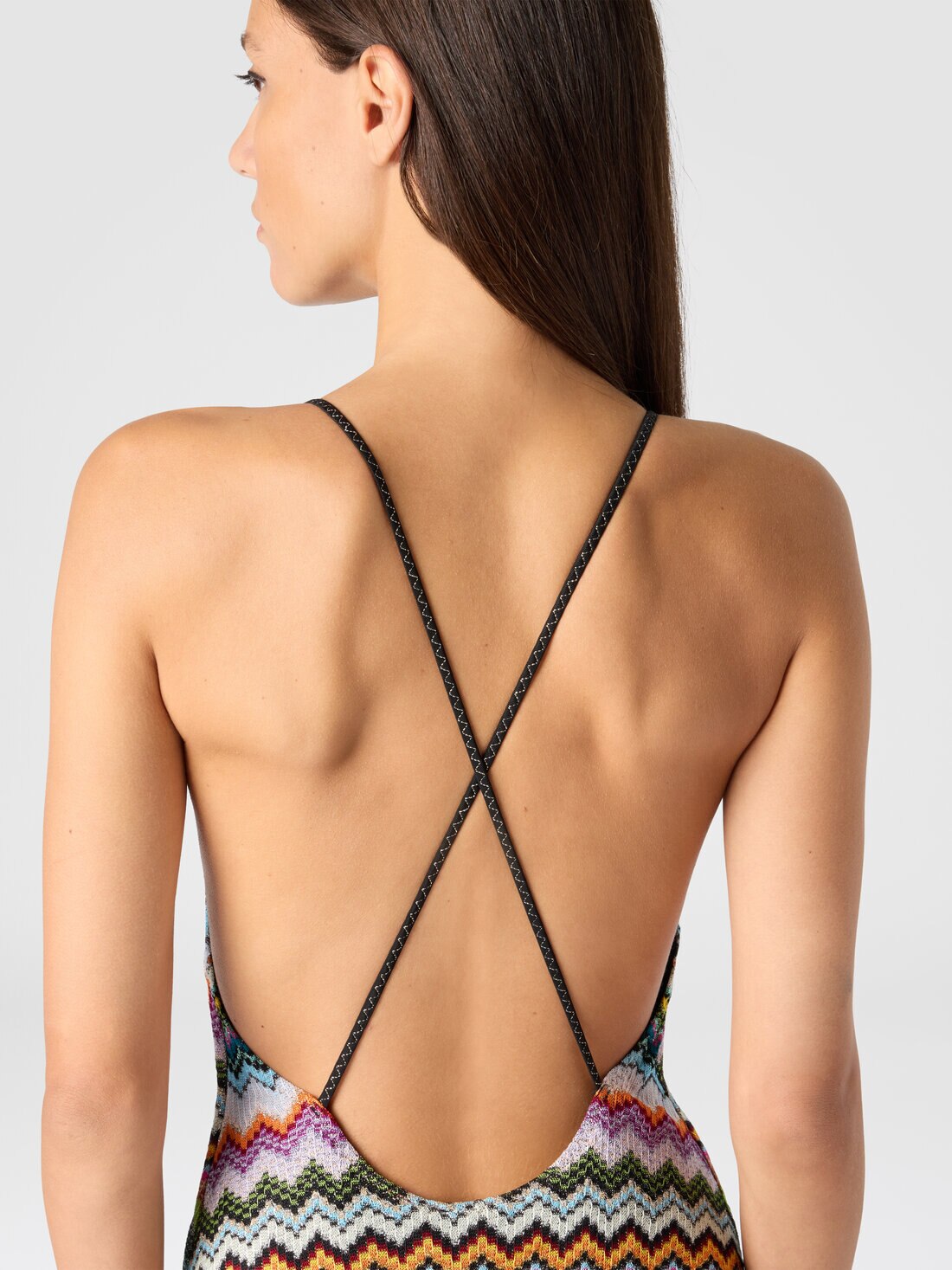 Missoni’s micro zigzag motif is reinvented in a contemporary way with a refined pixel effect. This women’s one-piece swimsuit in viscose lamé, featuring a V-neckline and a twisted back detail, fuses craftsmanship and modern allure in a perfect balance of light and movement.