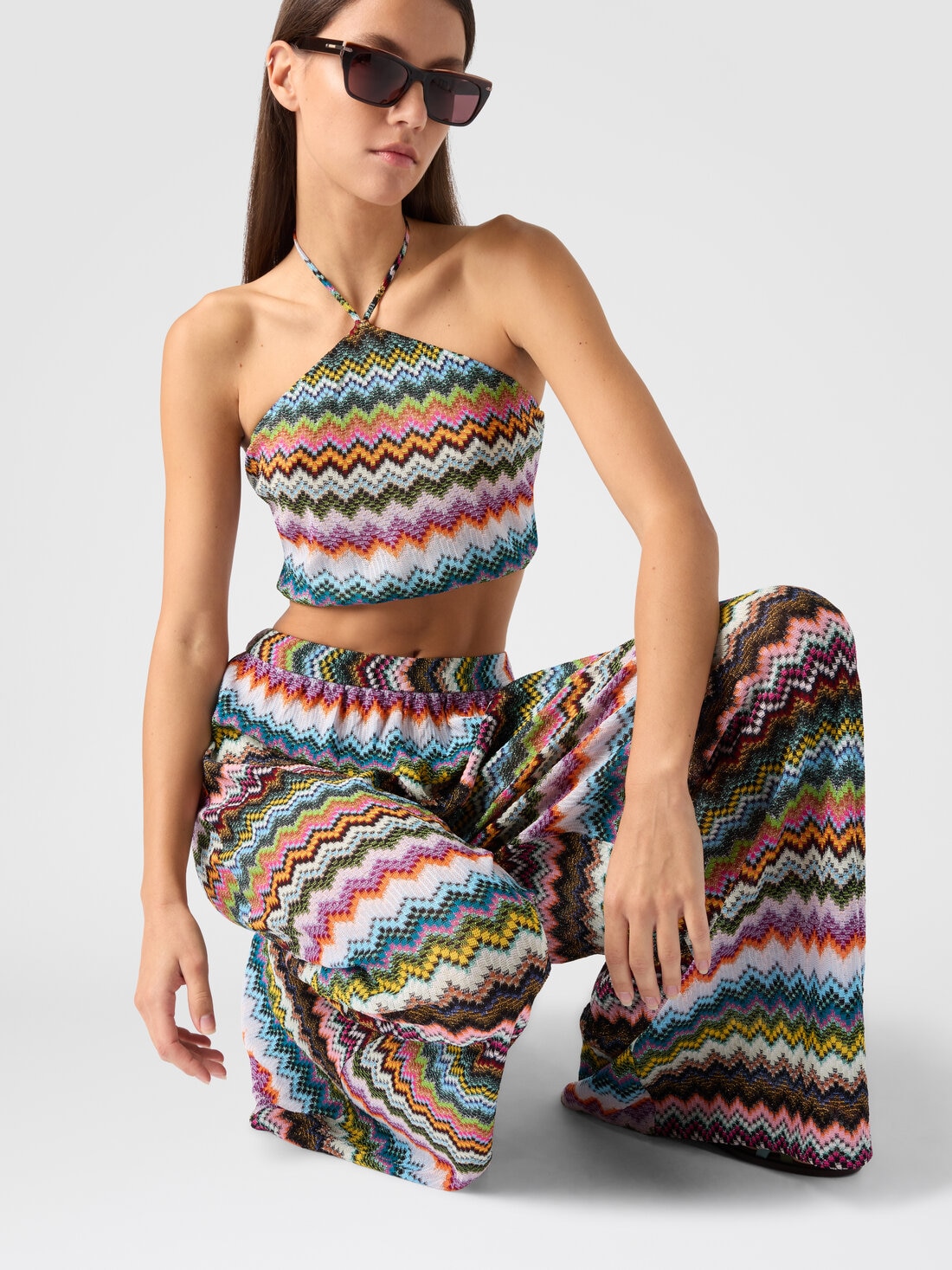 The Missoni zigzag motif is reimagined with a refined pixel effect in this women’s viscose lamé top. The halter neckline enhances the silhouette, while the brilliance of the yarn and the refined texture elegantly express the maison’s modernity.