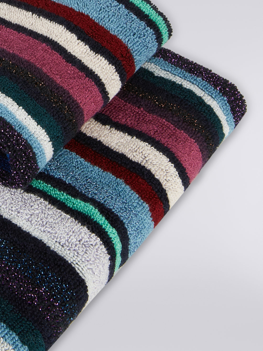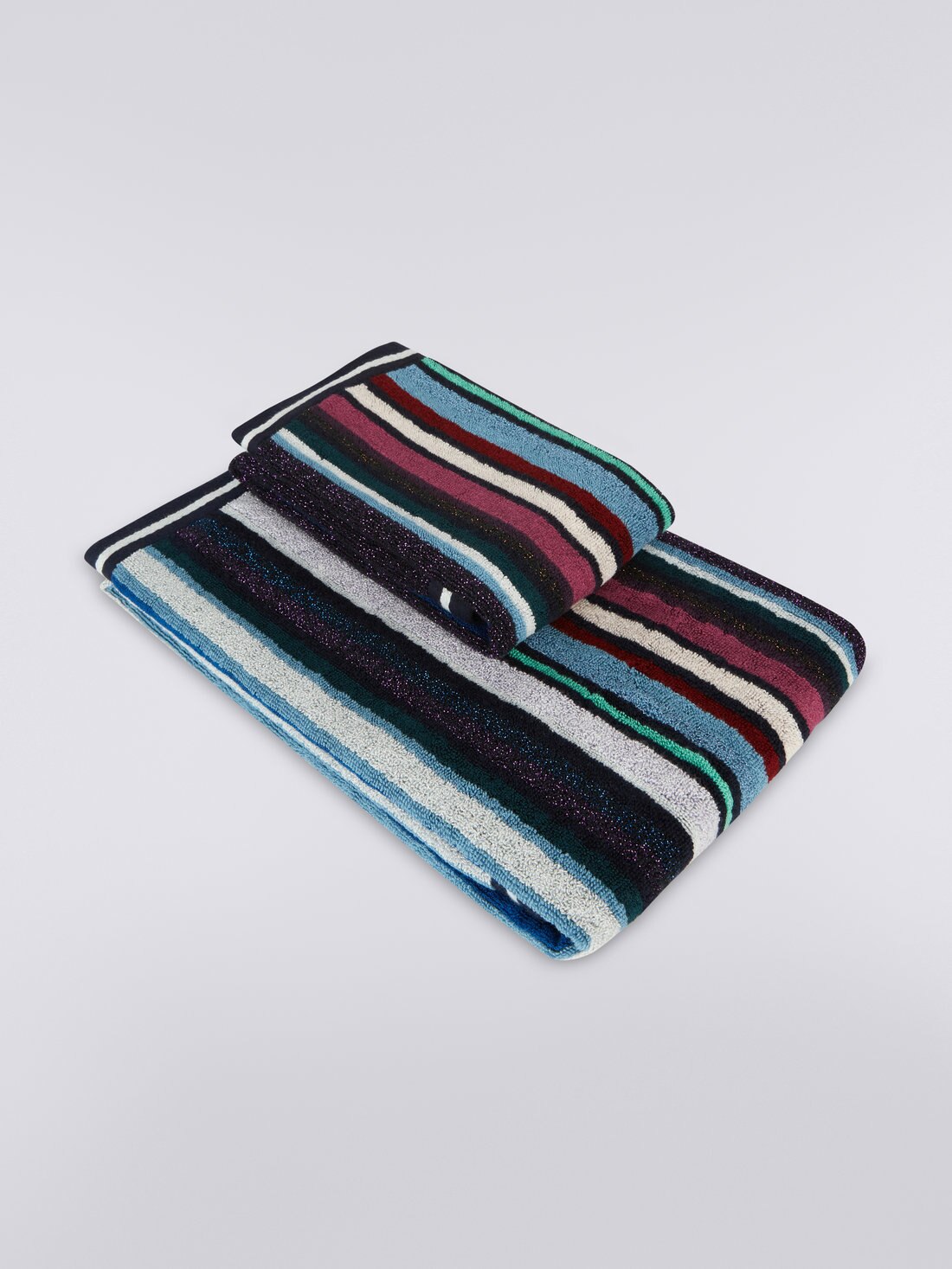 The refined glow of lurex lights up the 2-piece Chandler towel set with metallic reflections. Made of cotton-viscose terry cloth, this pair of face and guest towels will add a precious touch to the most intimate rooms of your home.