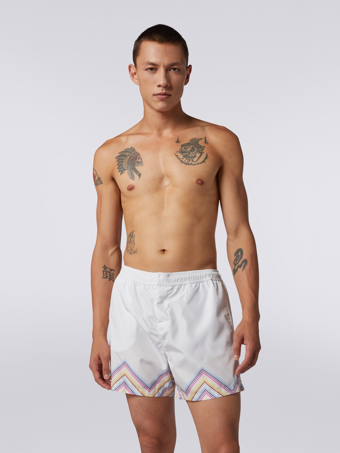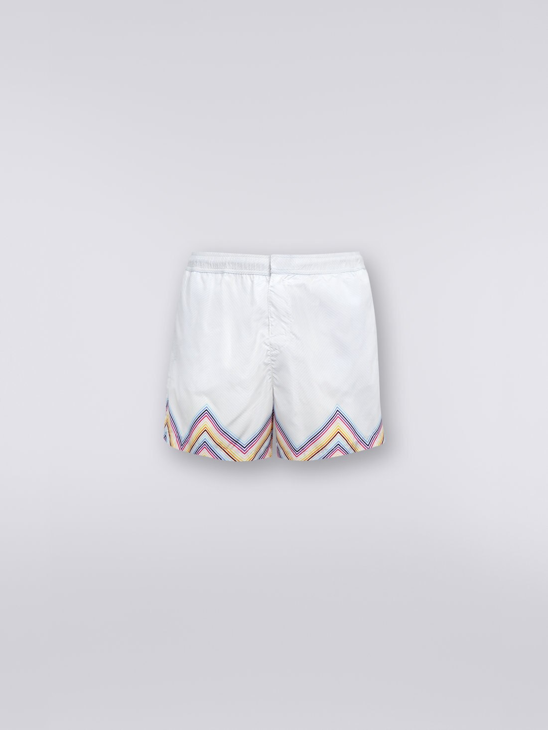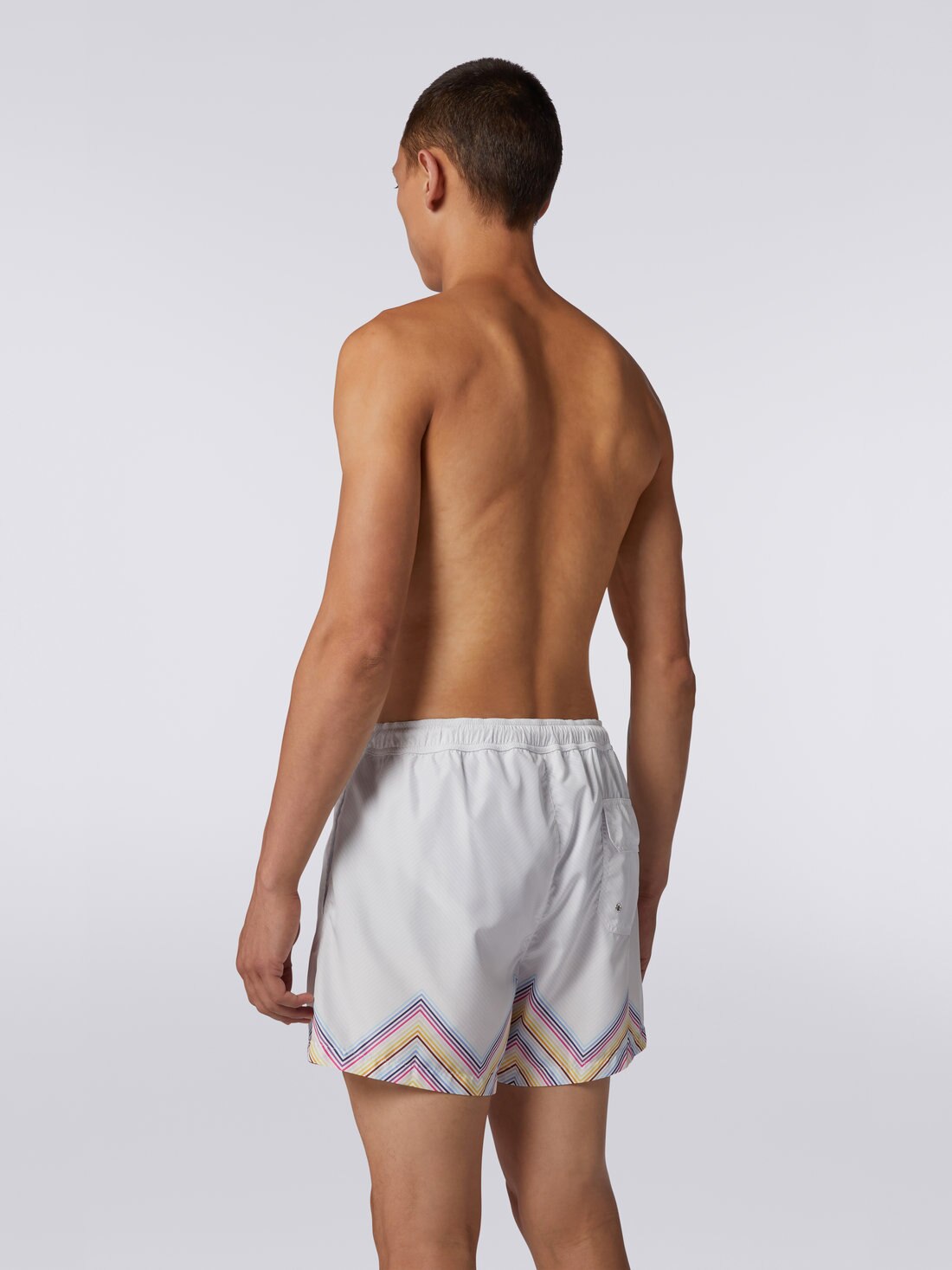 The ever-present protagonists of summer wear, the nylon-blend men’s swimming trunks, are brought to life by the dégradé zigzag print. The medium-length piece has an elasticated waistband and Velcro fastening. Side and back pockets with flap and logo label complete the garment.