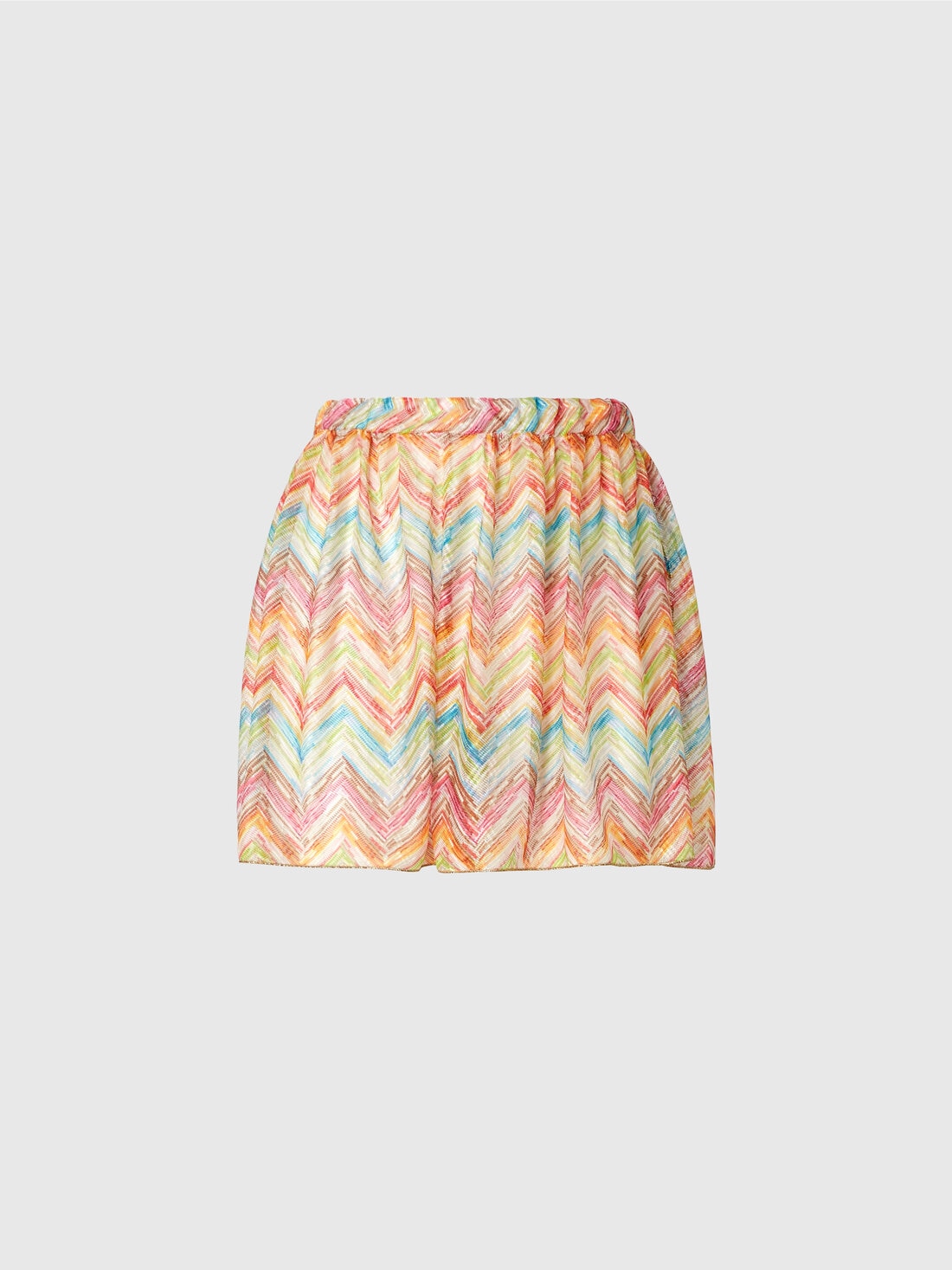 A vibrant zigzag pattern animates these raschel tulle cover-up shorts. The loose cut and elastic waistband ensure a comfortable fit, while the print adds a touch of elegant panache to any summer look. A lightweight and versatile garment, perfect for completing the beach wardrobe in style.