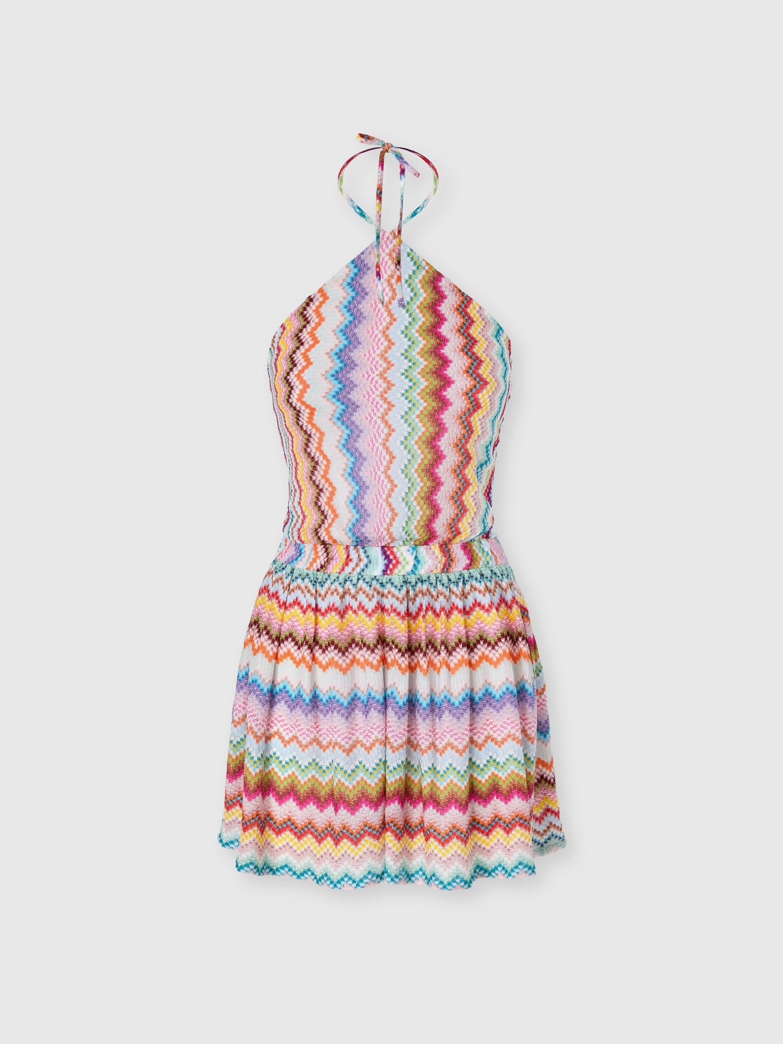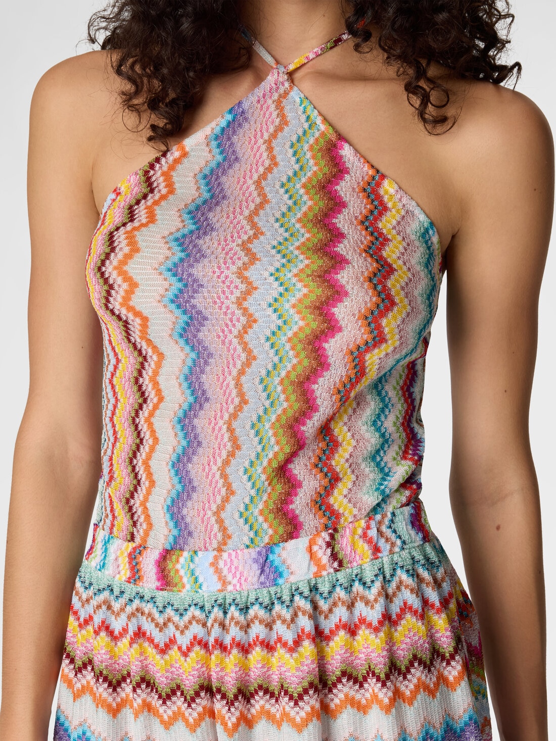 Amid reflections and geometric patterns, the short jumpsuit in viscose lamé with a pixel-effect zigzag motif and halter neckline outlines a luminous and feminine silhouette.