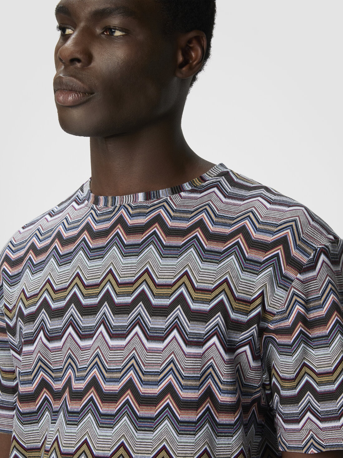 Men's short-sleeve T-shirt made of 100% cotton, with refined raschel workmanship and Missoni’s signature geometric zigzag motif. A piece that expresses the maison’s unmistakable graphic identity, combining refined texture and contemporary style.