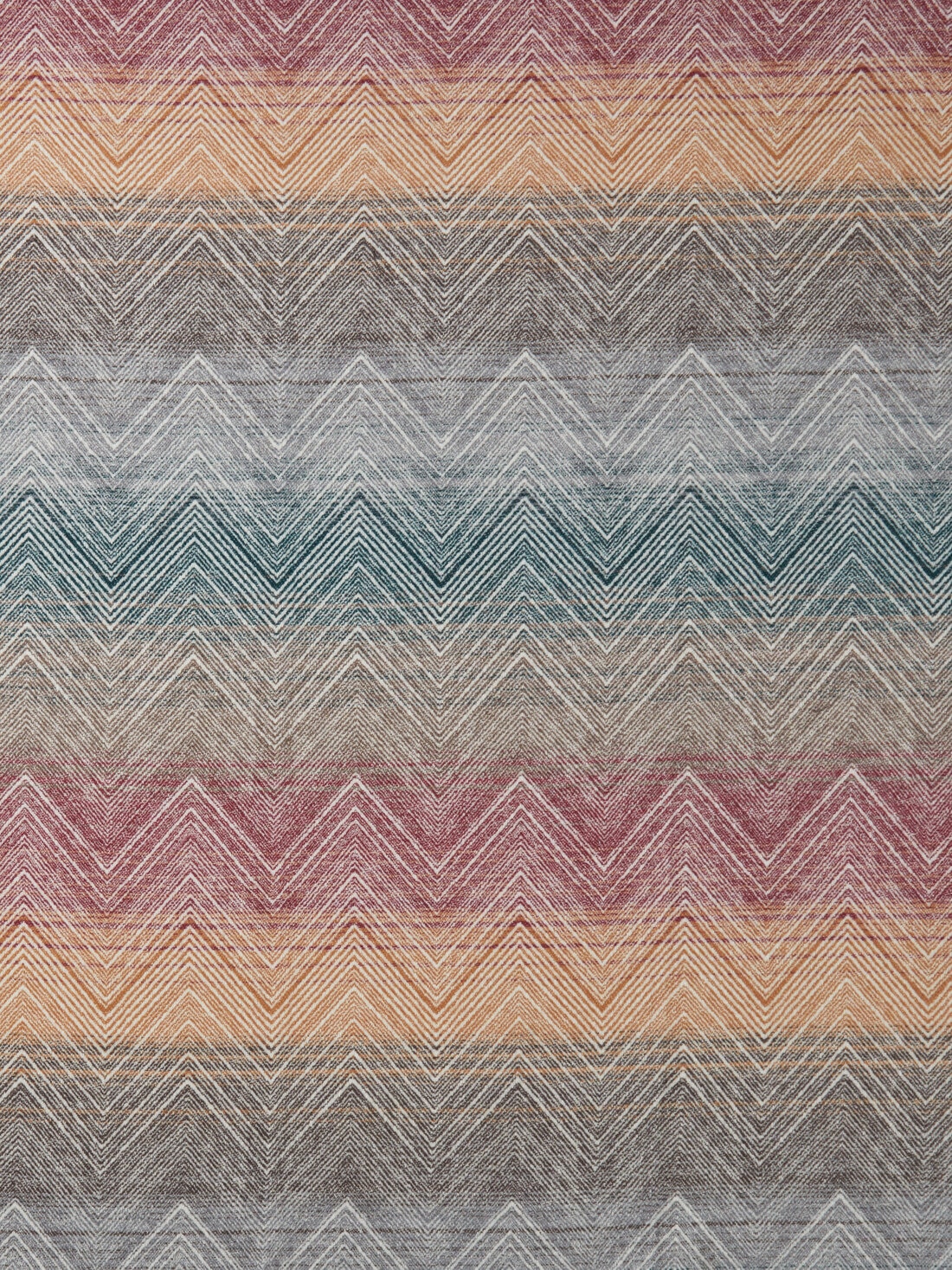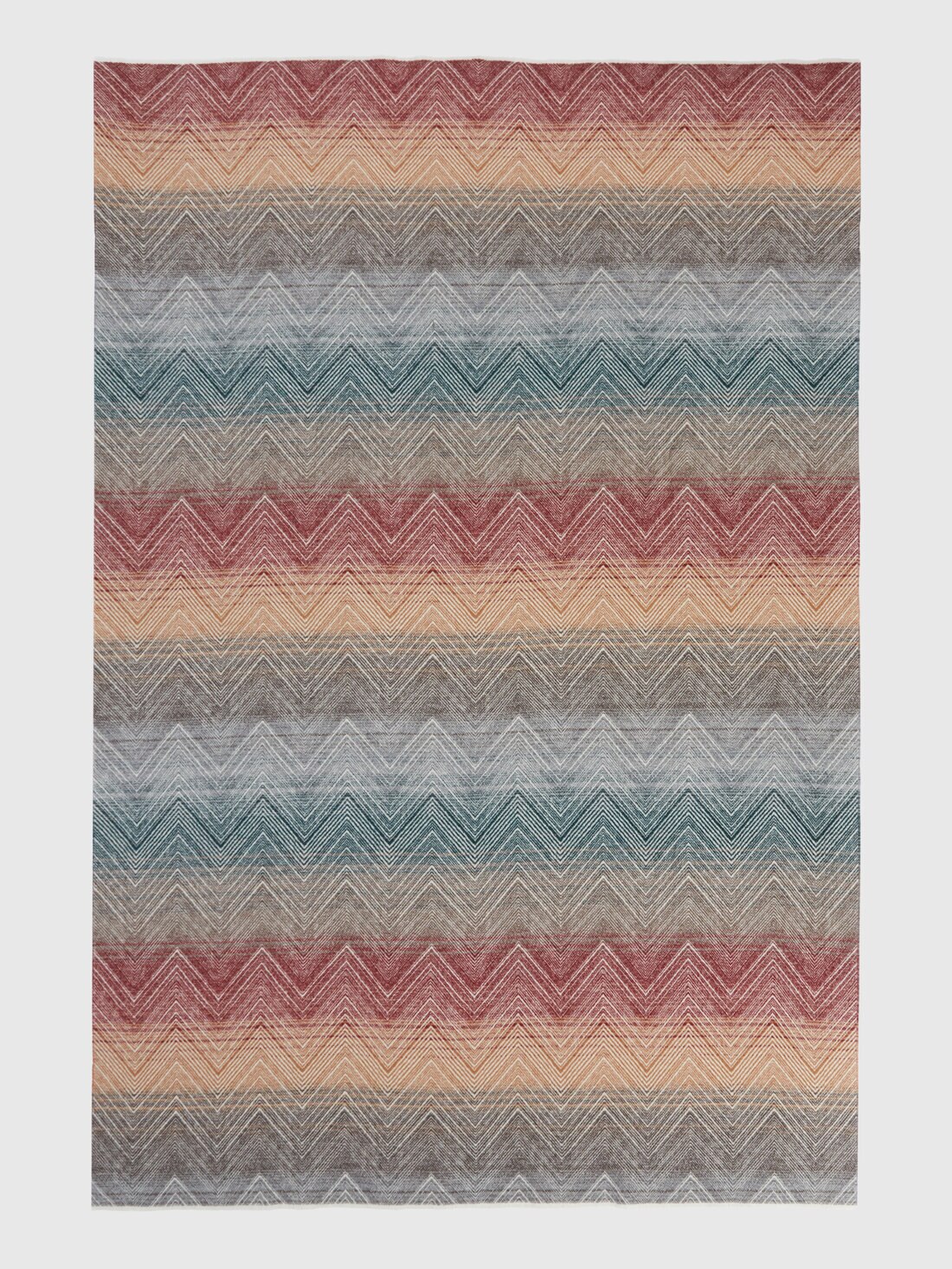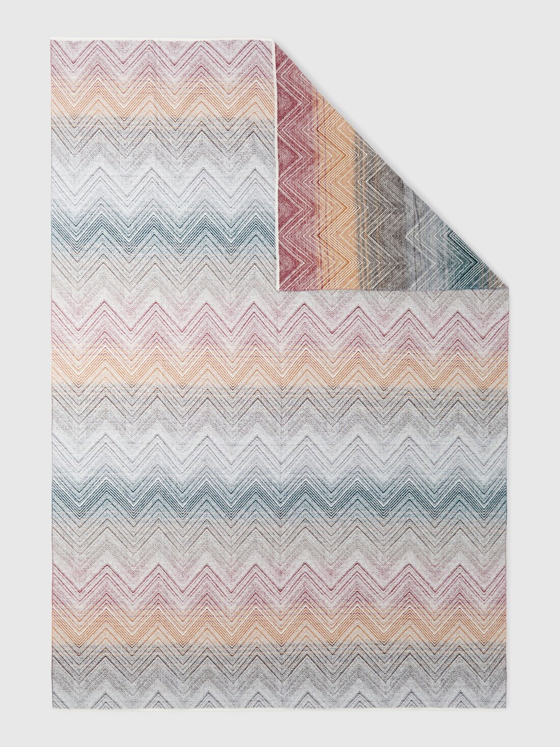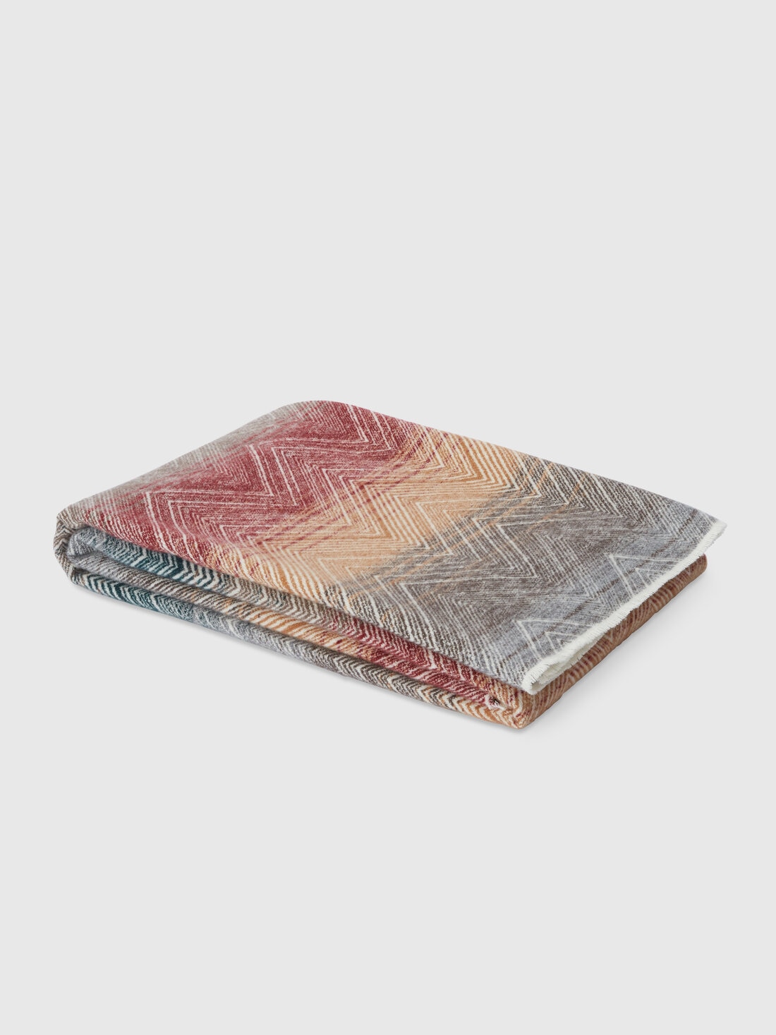 The Marea plaid, measuring 130x190 cm, shows MissoniHome's creative approach through an interplay of undefined nuances that enliven its surface. Featuring short fringes, the plaid has a shaded striped background embellished with linear chevrons that emerge with character. Made of a fine wool and cashmere blend, the plaid combines comfort and style in a harmonious combination.