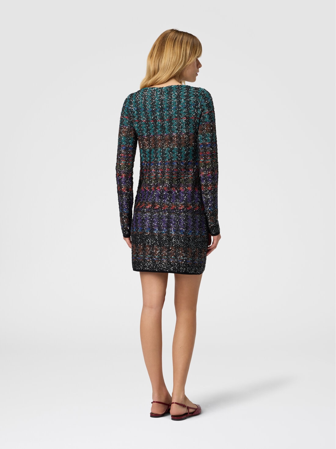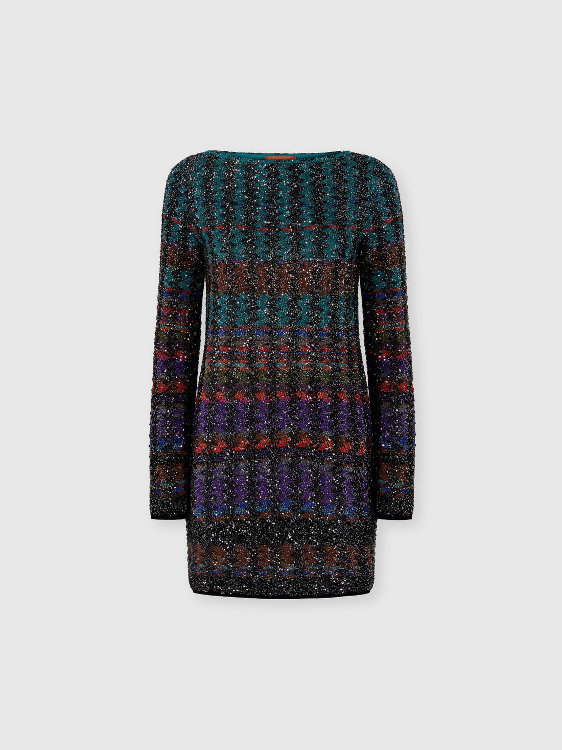 A women’s mini dress that plays with transparency and motion. The boat neckline and Missoni’s signature chevron-striped pattern create a unique graphic effect, while lamé threads and sequins give the fabric a brilliant shimmer. A bold, elegant statement piece.