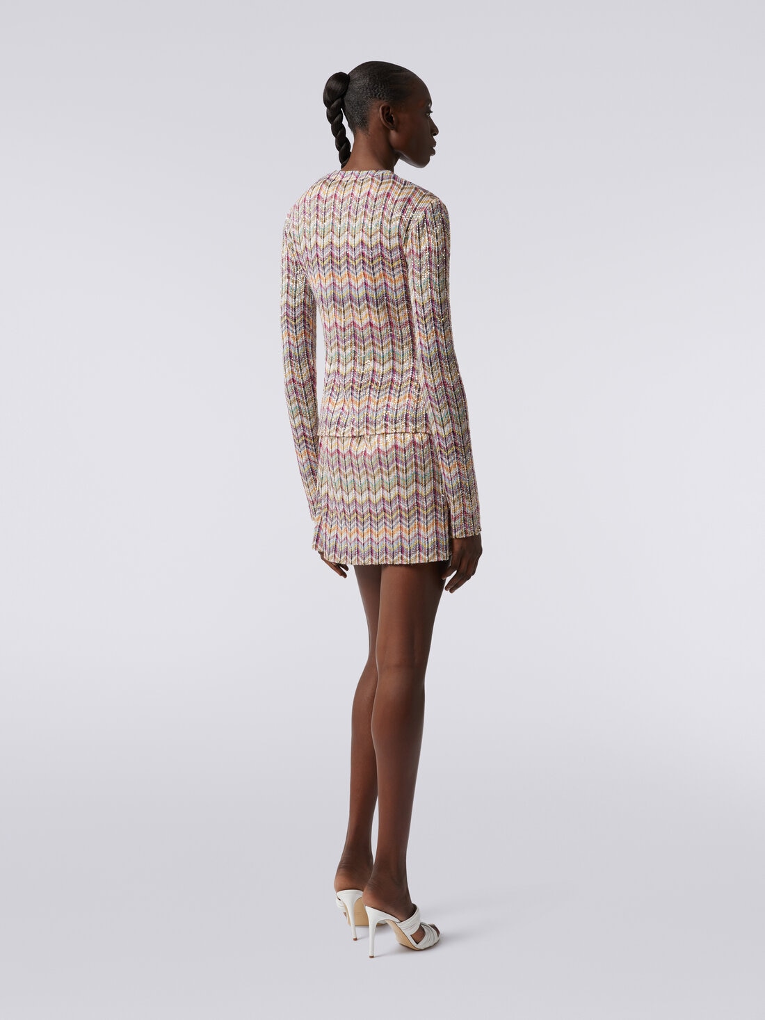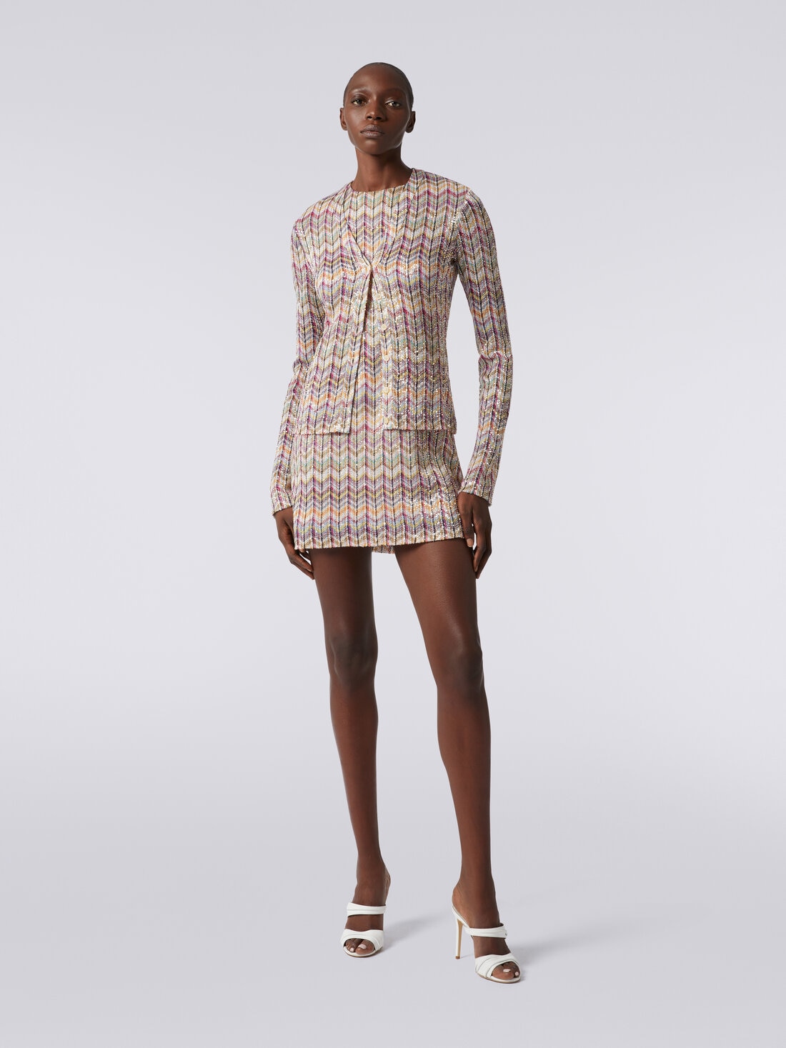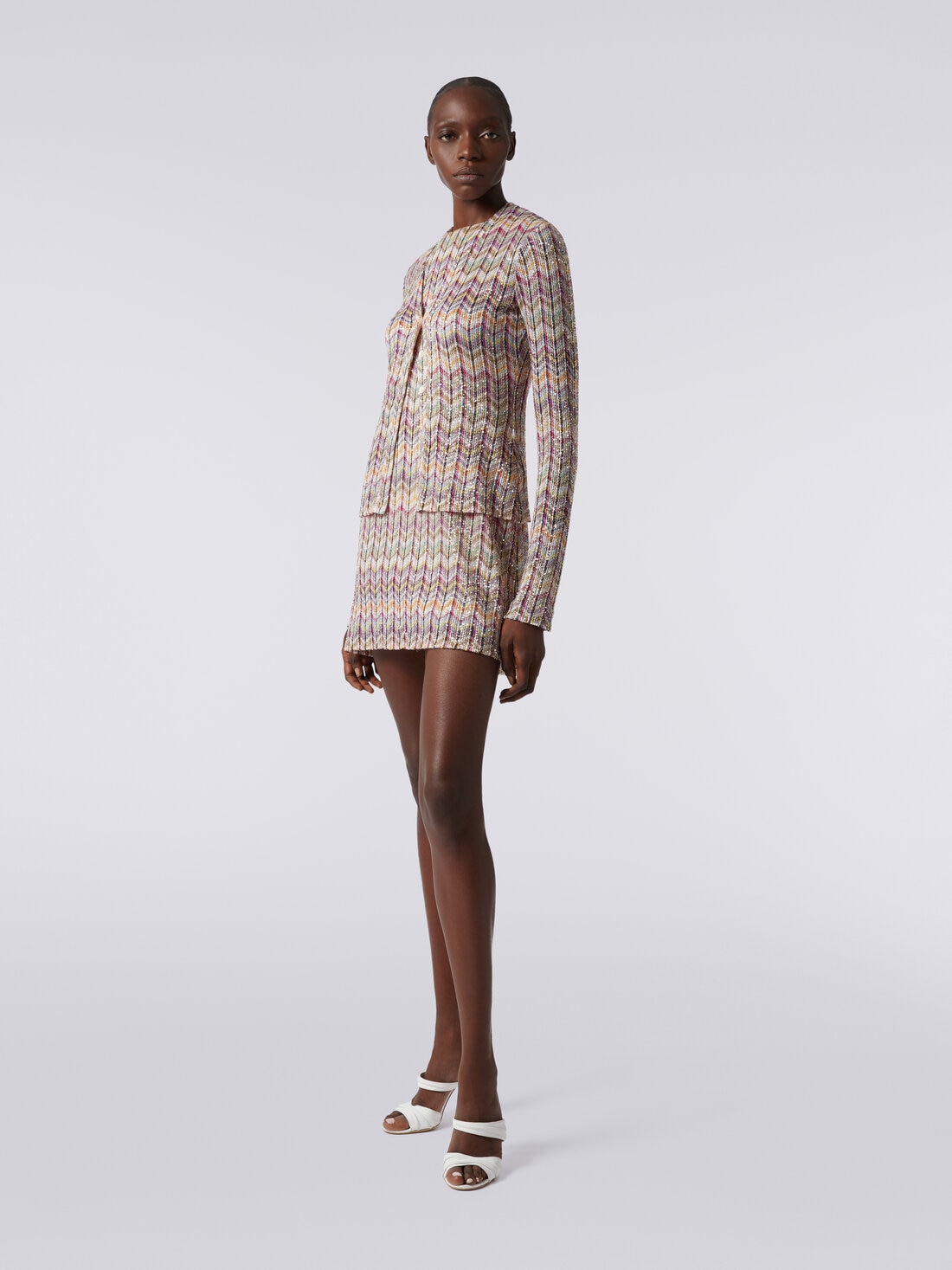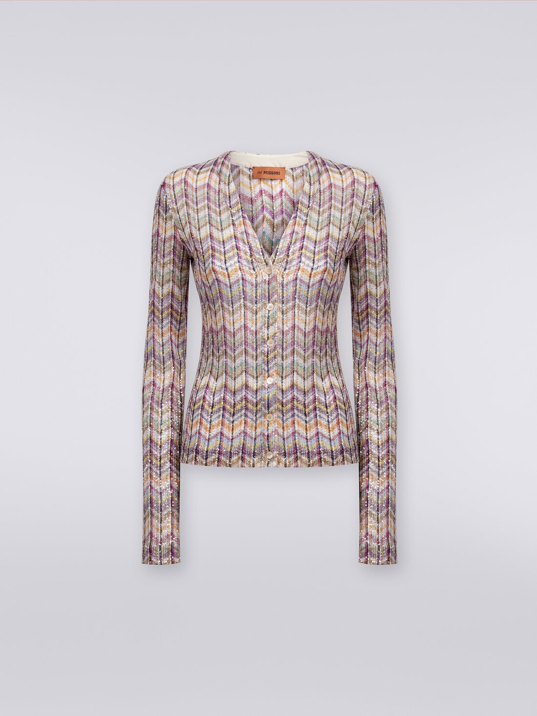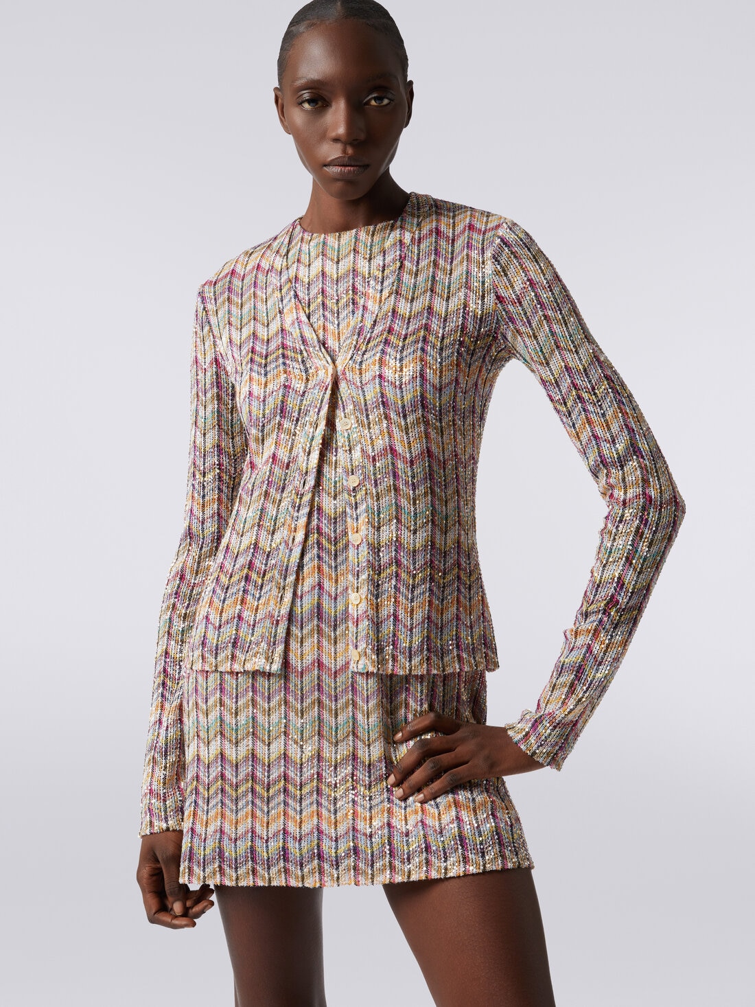 The Missoni women's short sequined chevron cotton blend cardigan is an elegant outerwear piece that captures the brand's distinctive essence. With its fine Caperdoni knit and its zigzags embellished with bright sequins, the cardigan adds a touch of glamour and sophistication to the everyday look. A versatile and classy addition to the wardrobe.