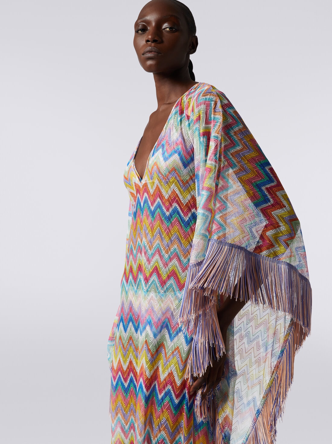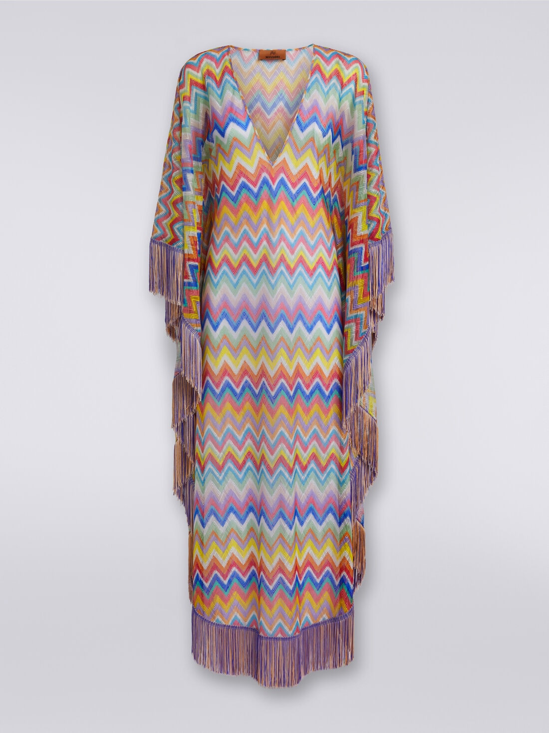 The long kaftan-style cover-up, one of the most popular items of the summer look, is revived with the Missoni touch. The model's design, featuring fabric adorned with a zigzag print, is customised by the addition of fringes that give it a sense of movement.