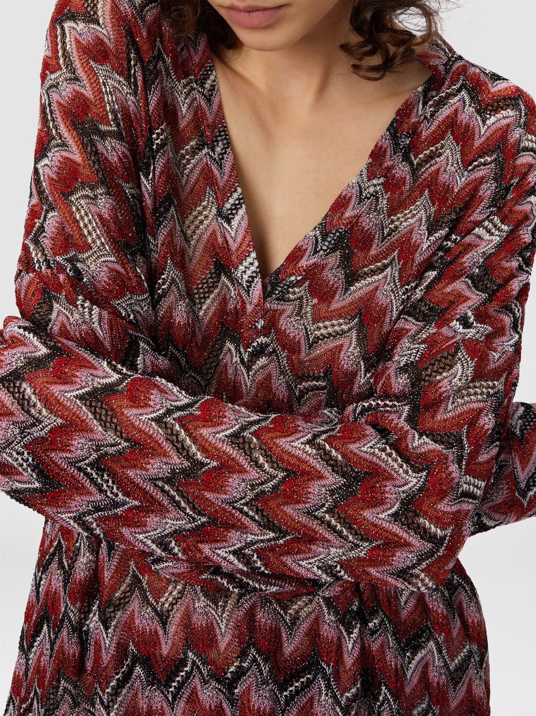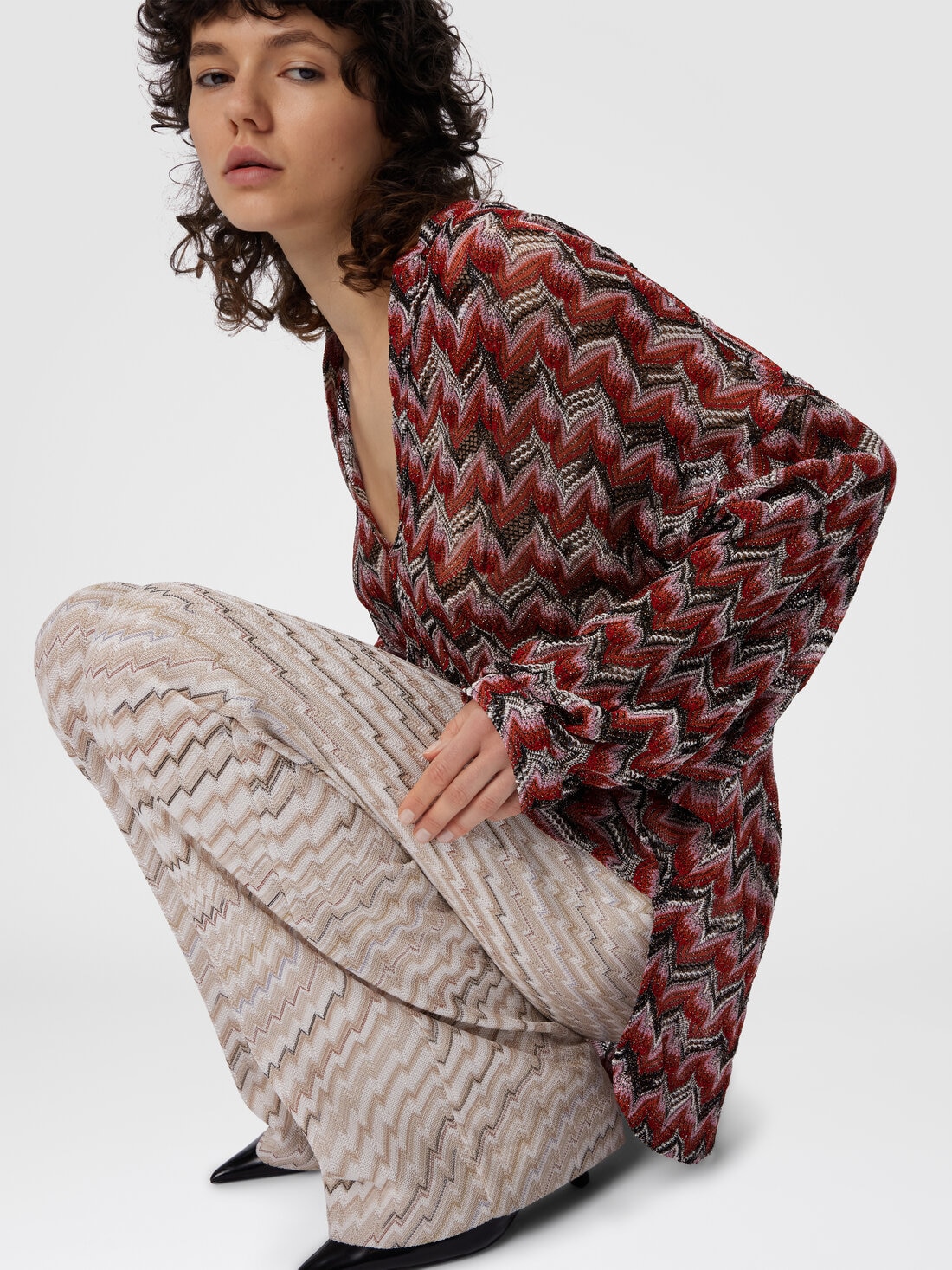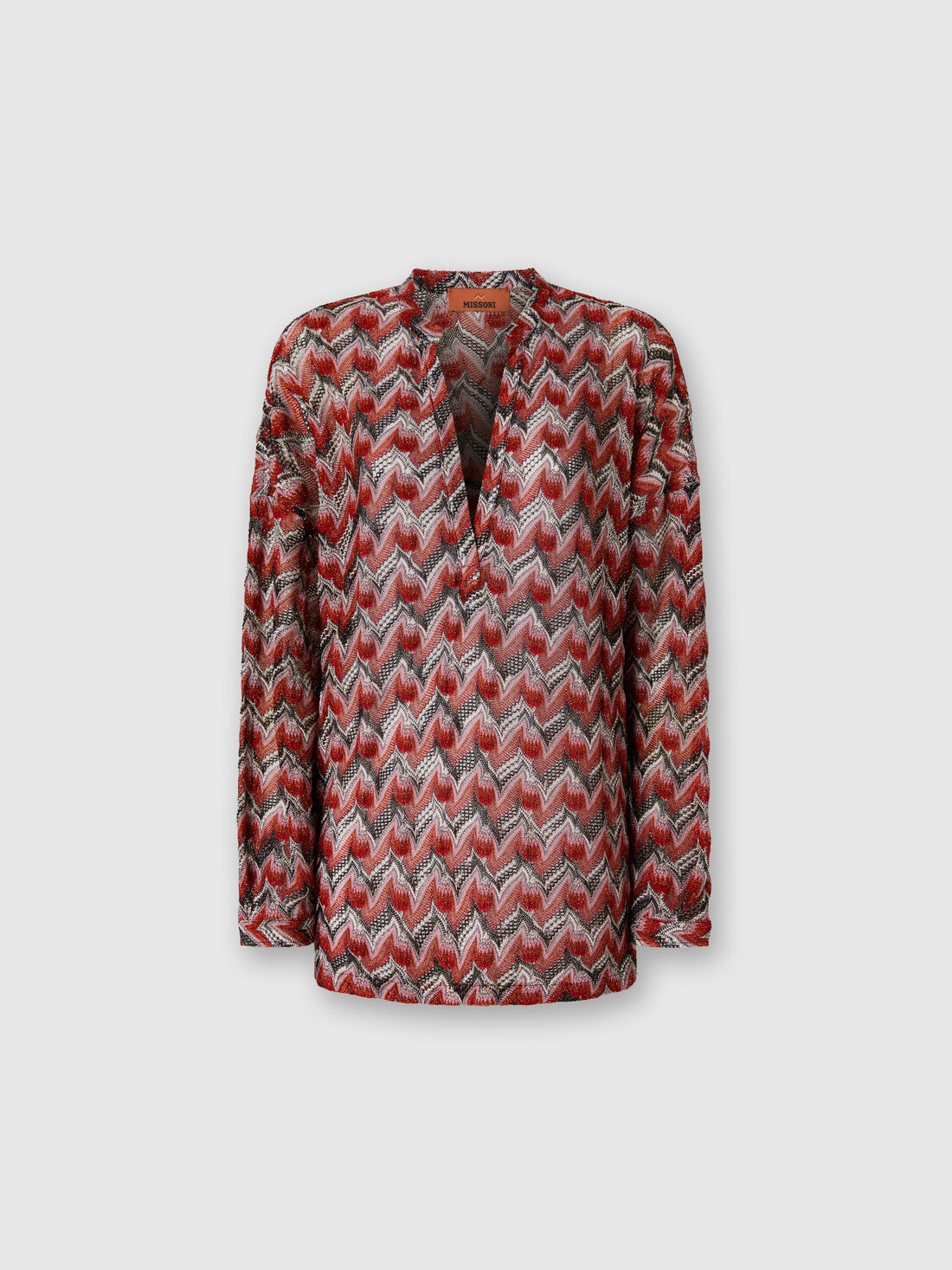 An oversized blouse with mandarin collar and feminine V-neck, featuring raschel lace that evokes the iconic Missoni zigzag. Made from viscose and lamé blend, the piece combines elegance and brightness, creating a sophisticated and high-impact look.