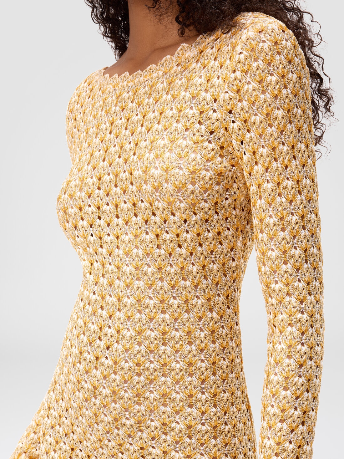 A modern elegance defines the short long-sleeve cover-up, enriched with Raschel lacework and luminous lamé details. A sophisticated choice for a classy summer look.