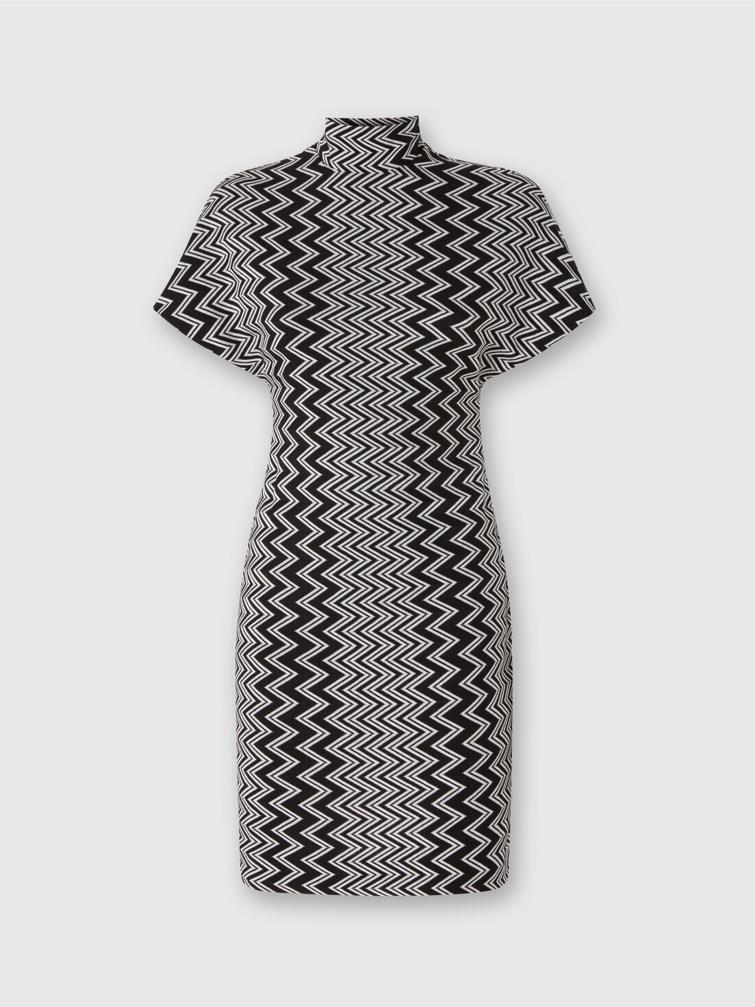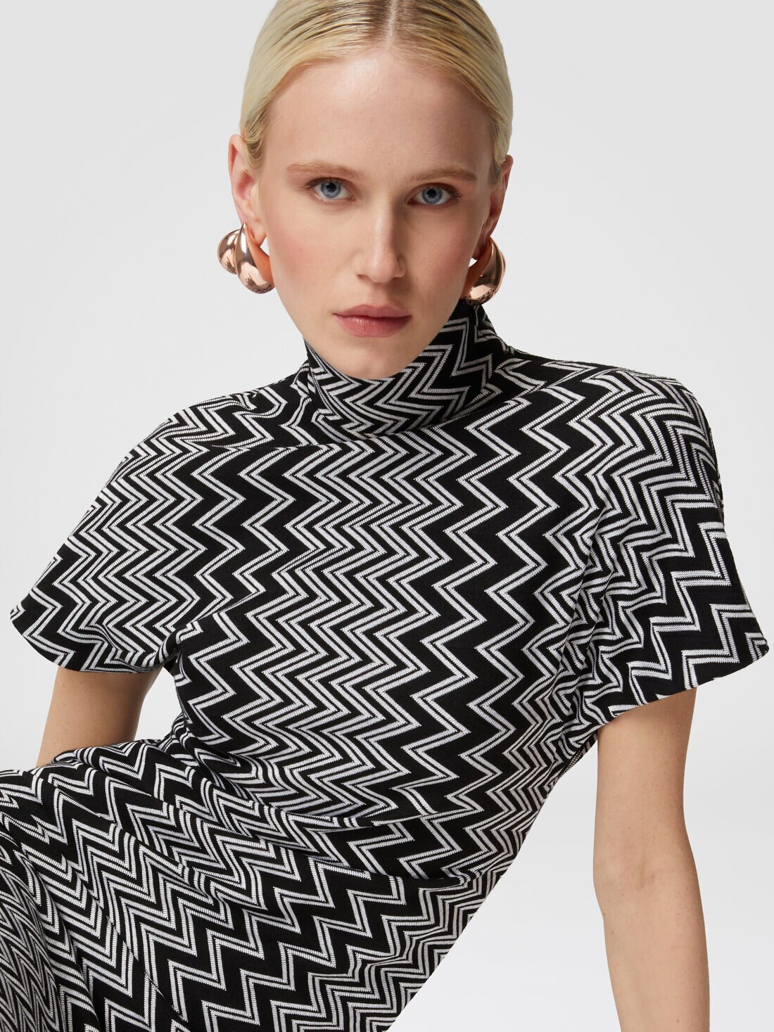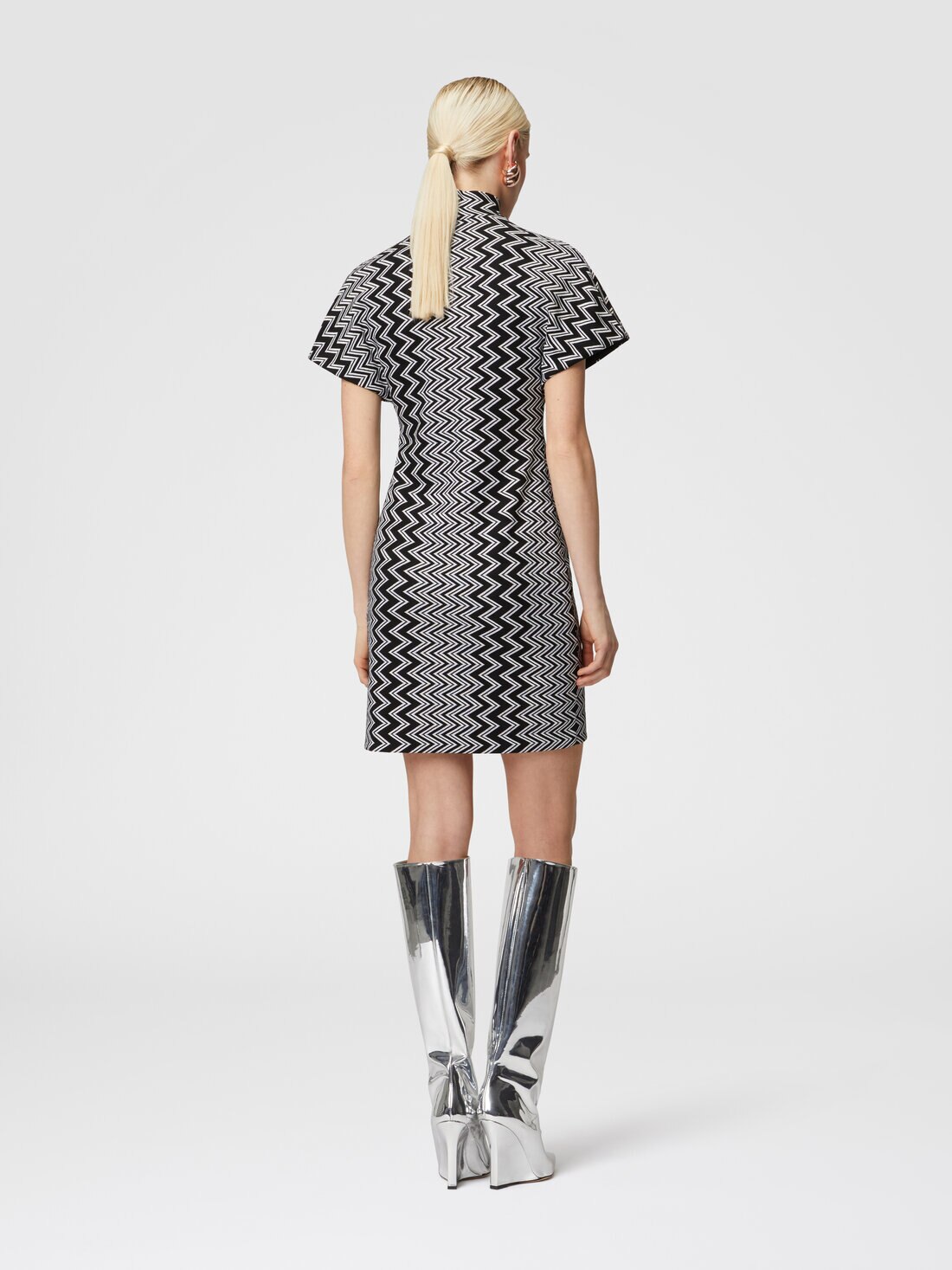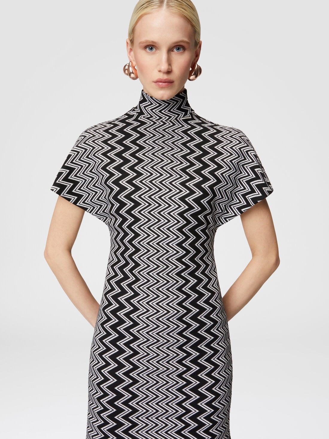 The juxtaposition of glossy and matte, guaranteed by the use of wool and viscose, offers the zigzag mini-dress with sculptural sleeves an unprecedented interpretation of one of Missoni's iconic motifs.