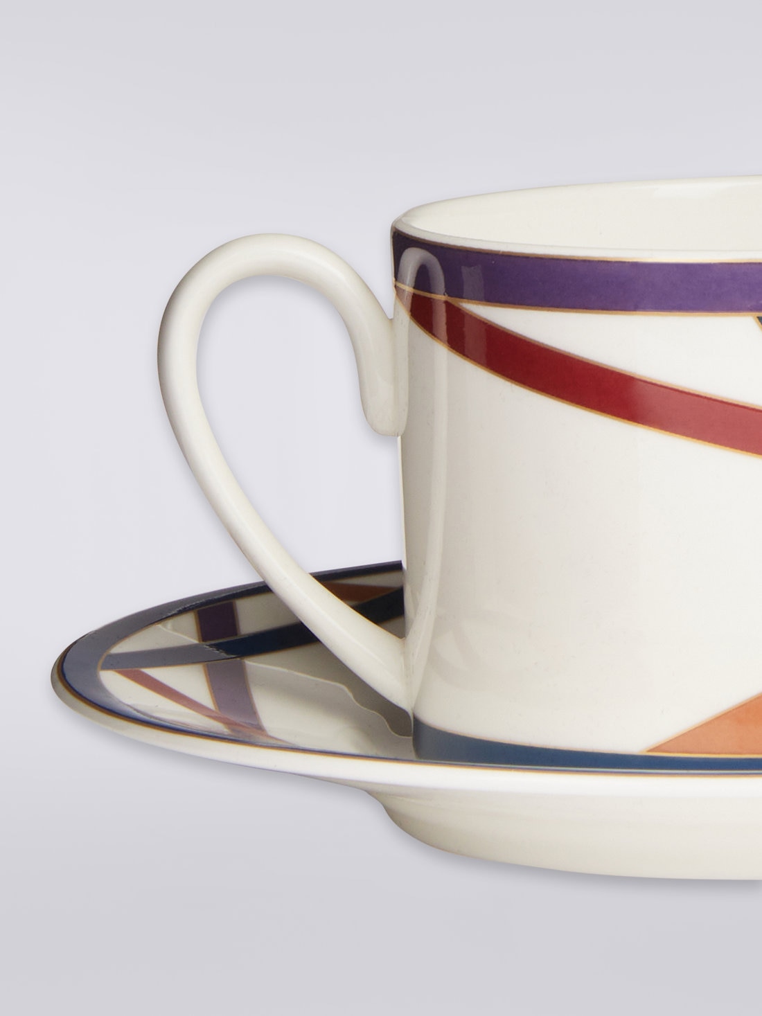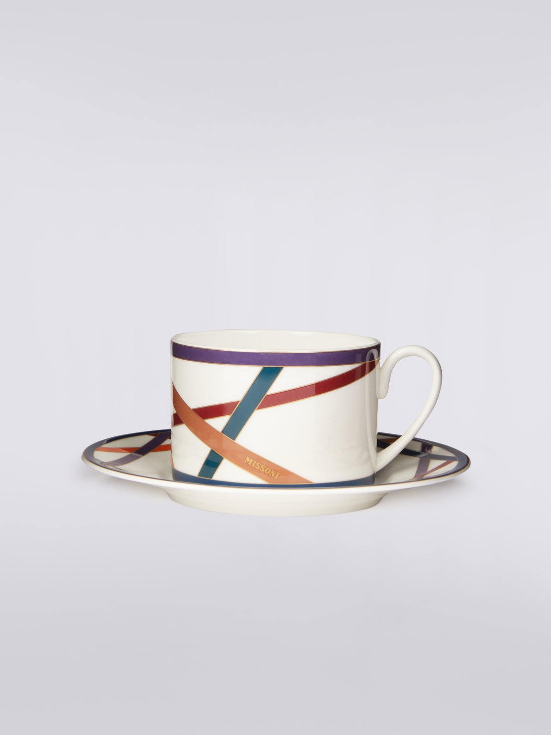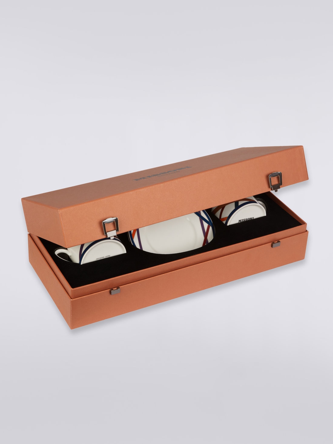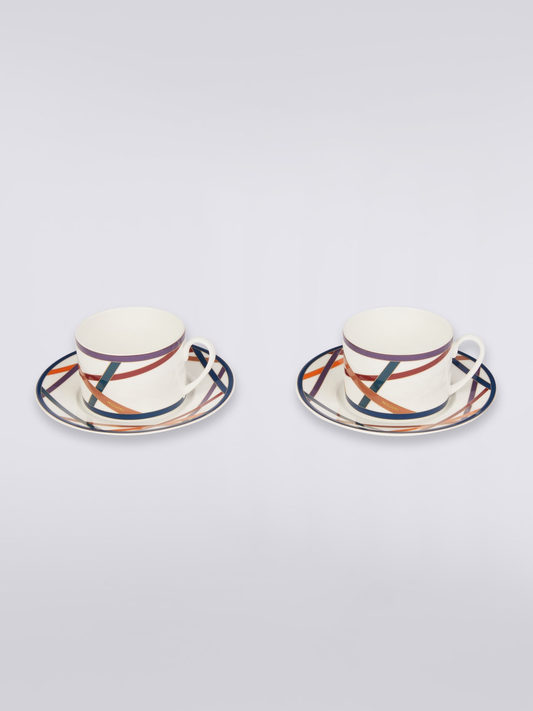 The MissoniHome set of two teacups and saucers embodies the perfect blend of refinement and personality, with the iconic Nastri pattern embellished with gold filigree and the logo print. Completing the table accessory is the elegant, branded gift box.
