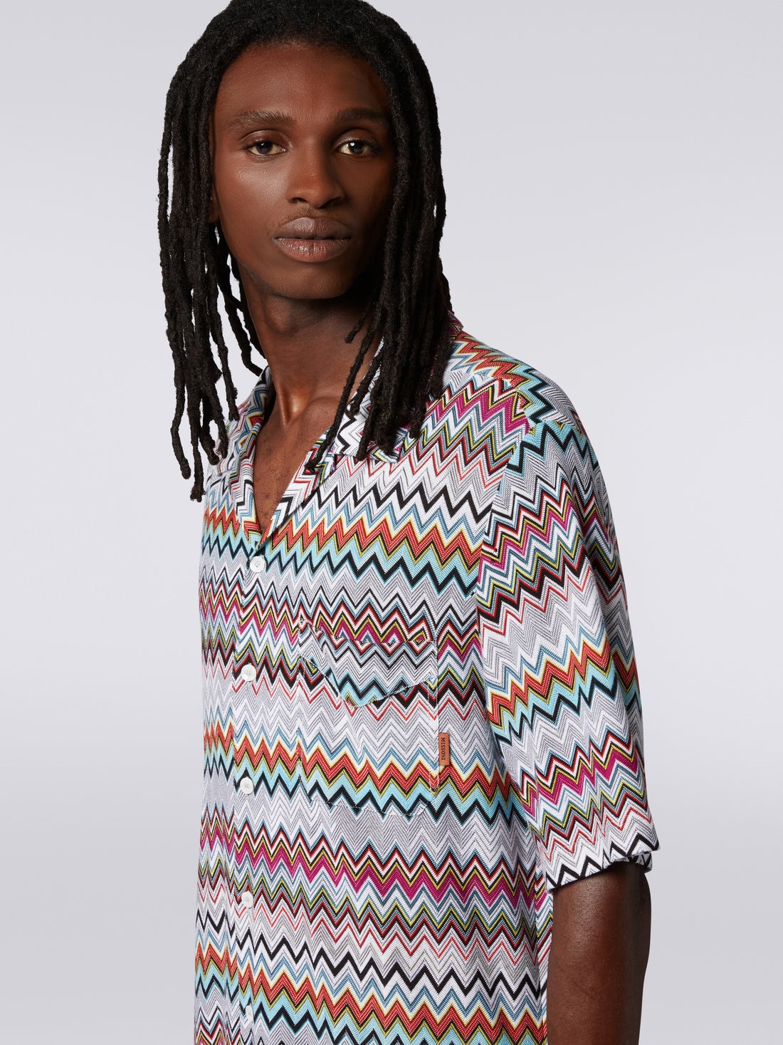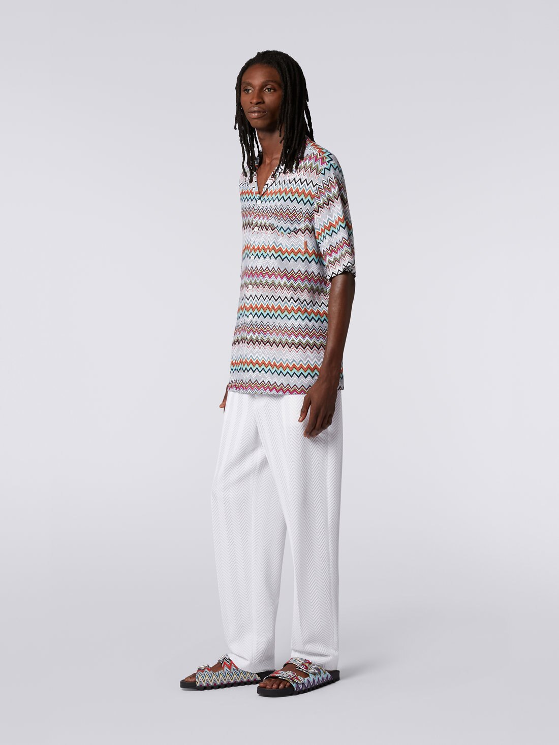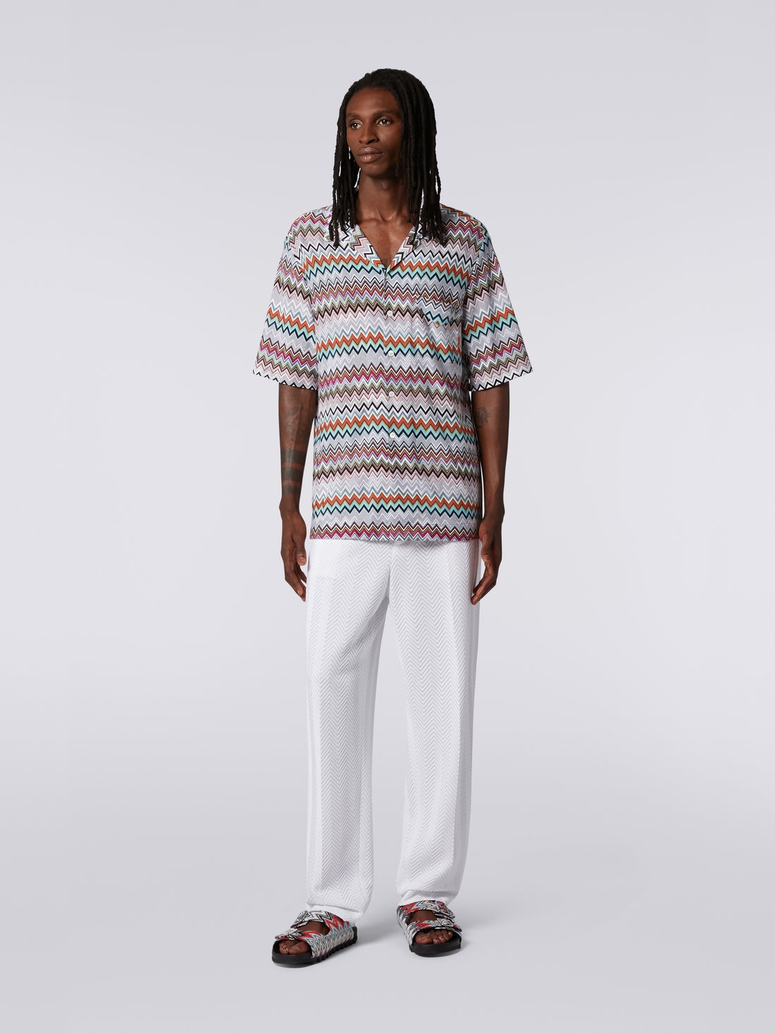 A quintessential piece of the casual leisure look, the short-sleeved men’s shirt finds its perfect expression in the bowling piece. Made of a refined cotton and viscose blend, the garment is entirely brought to life by the multicoloured chevron.