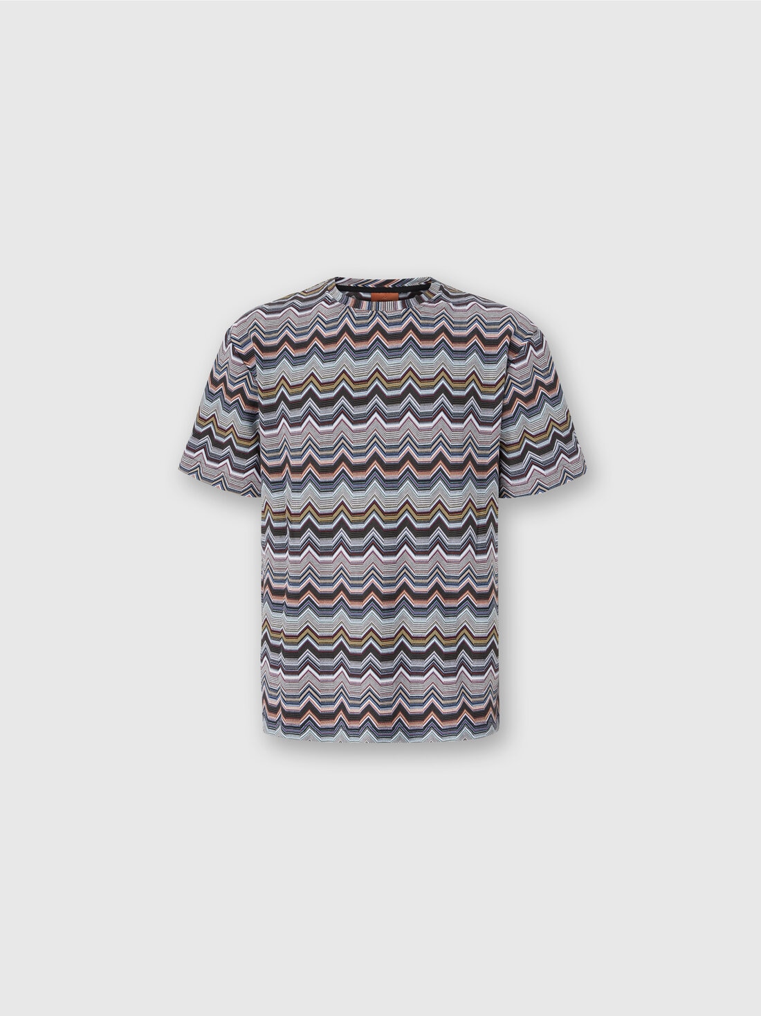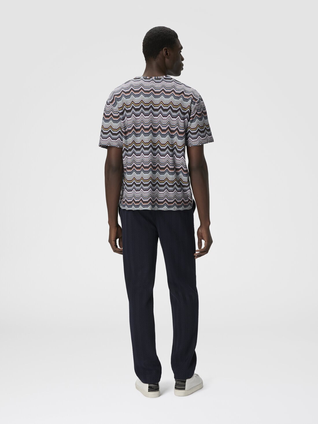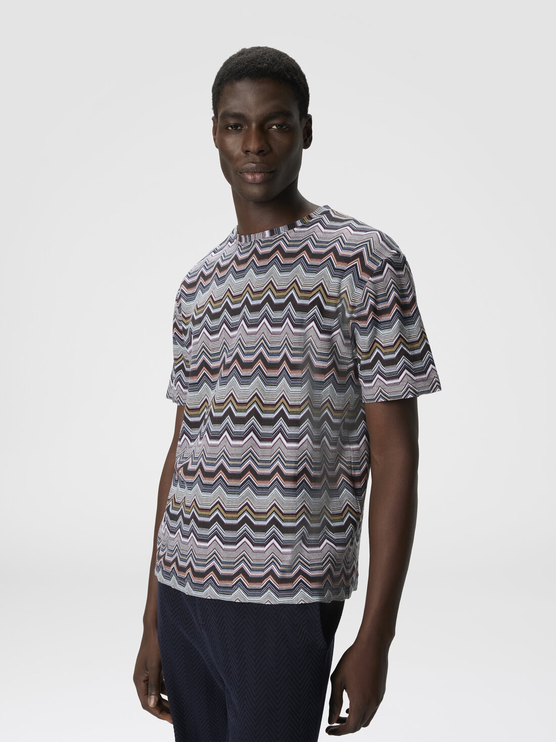 Men's short-sleeve T-shirt made of 100% cotton, with refined raschel workmanship and Missoni’s signature geometric zigzag motif. A piece that expresses the maison’s unmistakable graphic identity, combining refined texture and contemporary style.