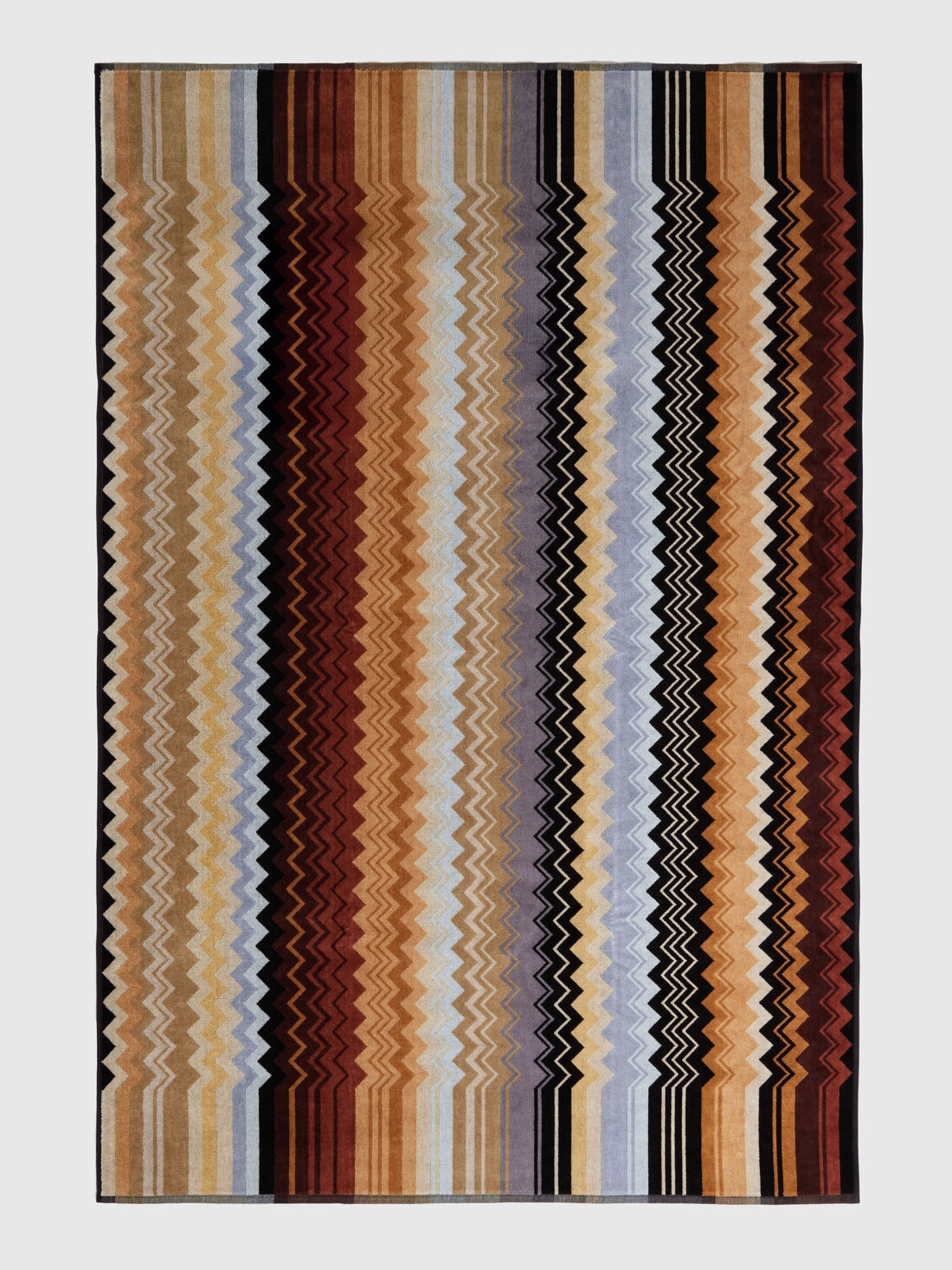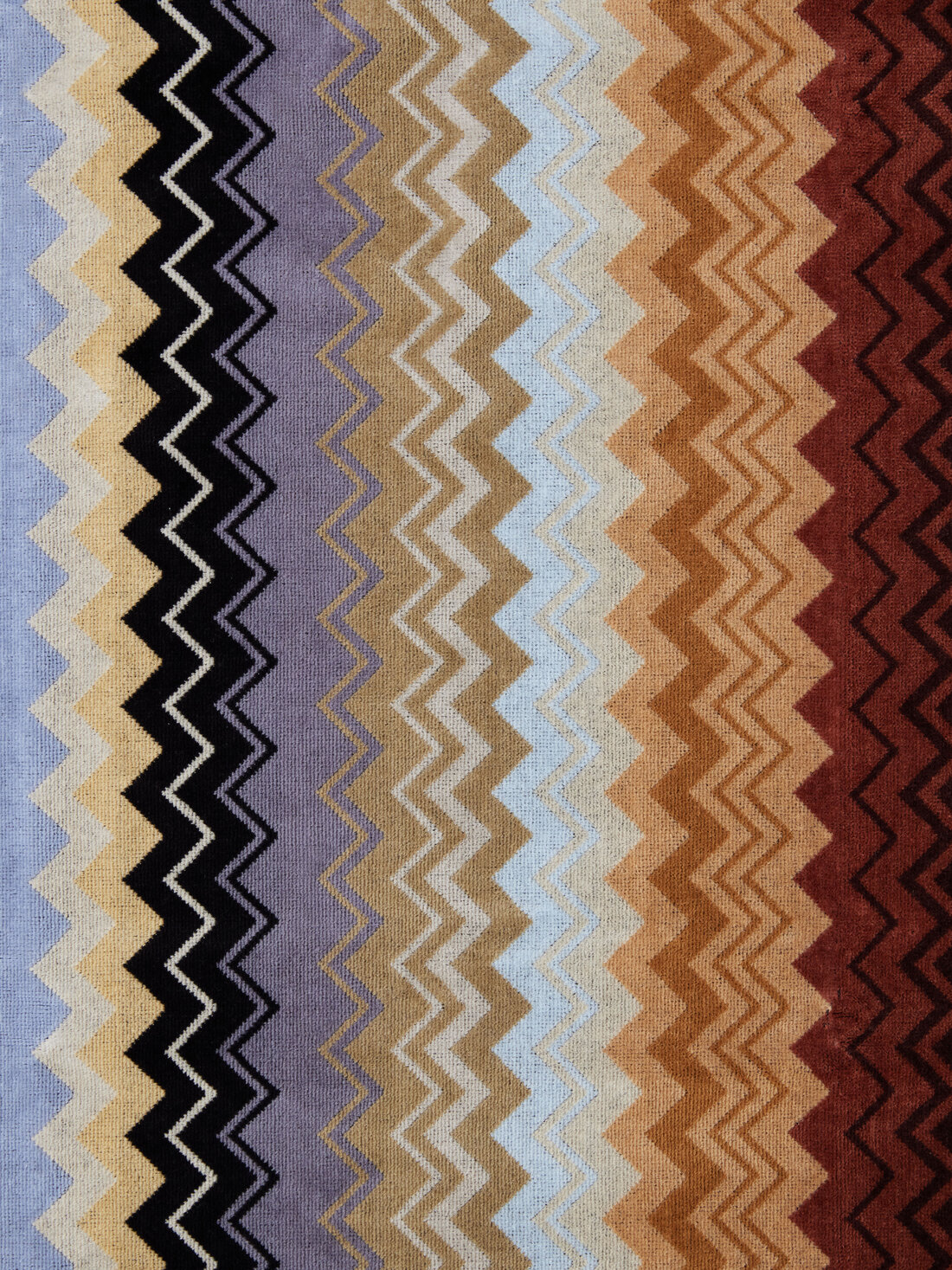 The 100x150 cm Giacomo bath towel is the quintessence of Missoni style: here the quality of the velour cotton terry meets the definition of the chevron print, which dips into the striped edges to enliven this beautiful and timeless linen accessory.