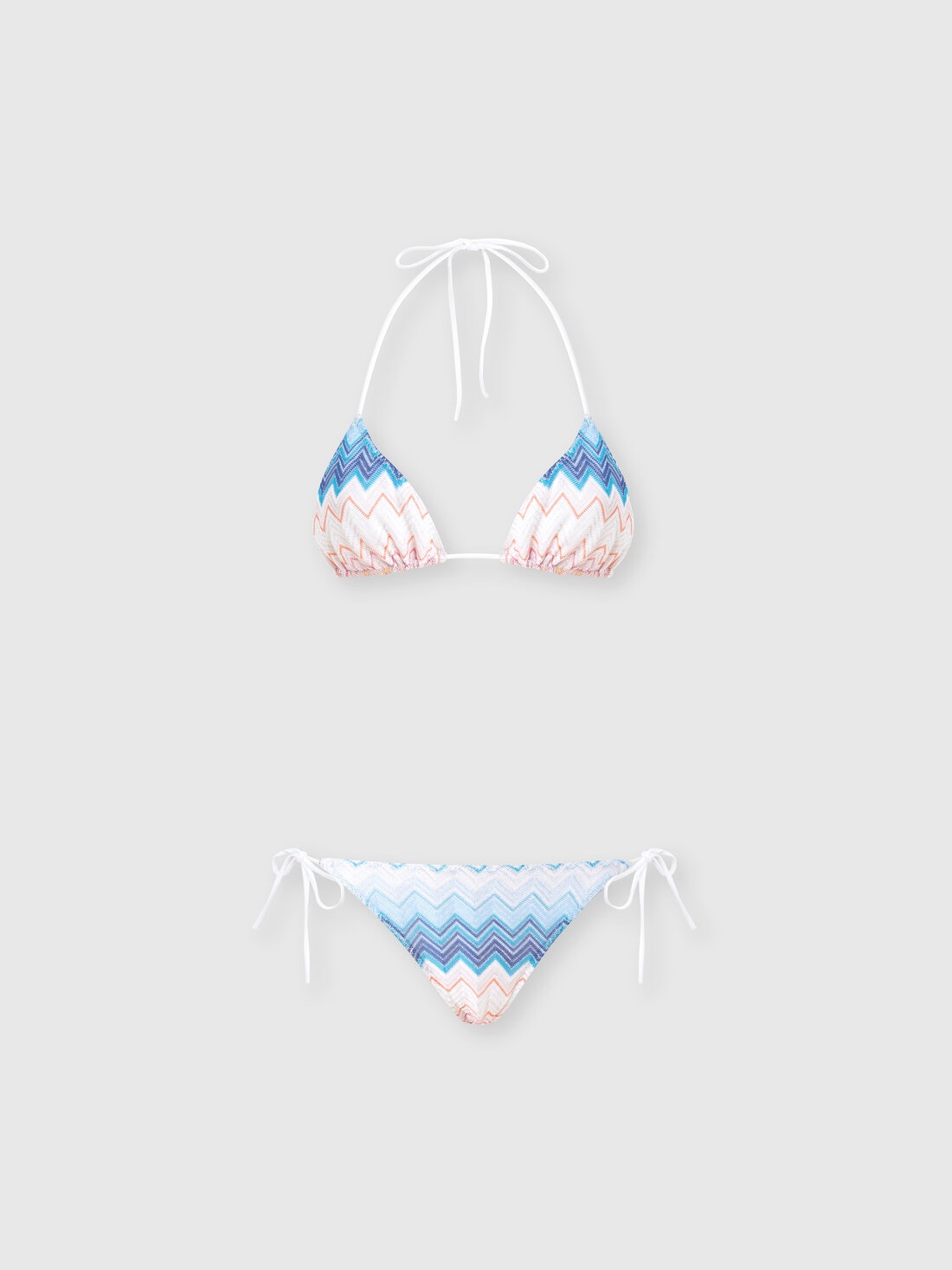 Crafted from a viscose blend, this triangle bikini features a gradient raschel knit enriched with lurex filaments. The zigzag pattern, enhanced by vibrant and iridescent shades, gives the garment a unique visual dynamism. The lamé fabric brings brightness and sophistication, for a bold look full of details that stand out with elegance.
