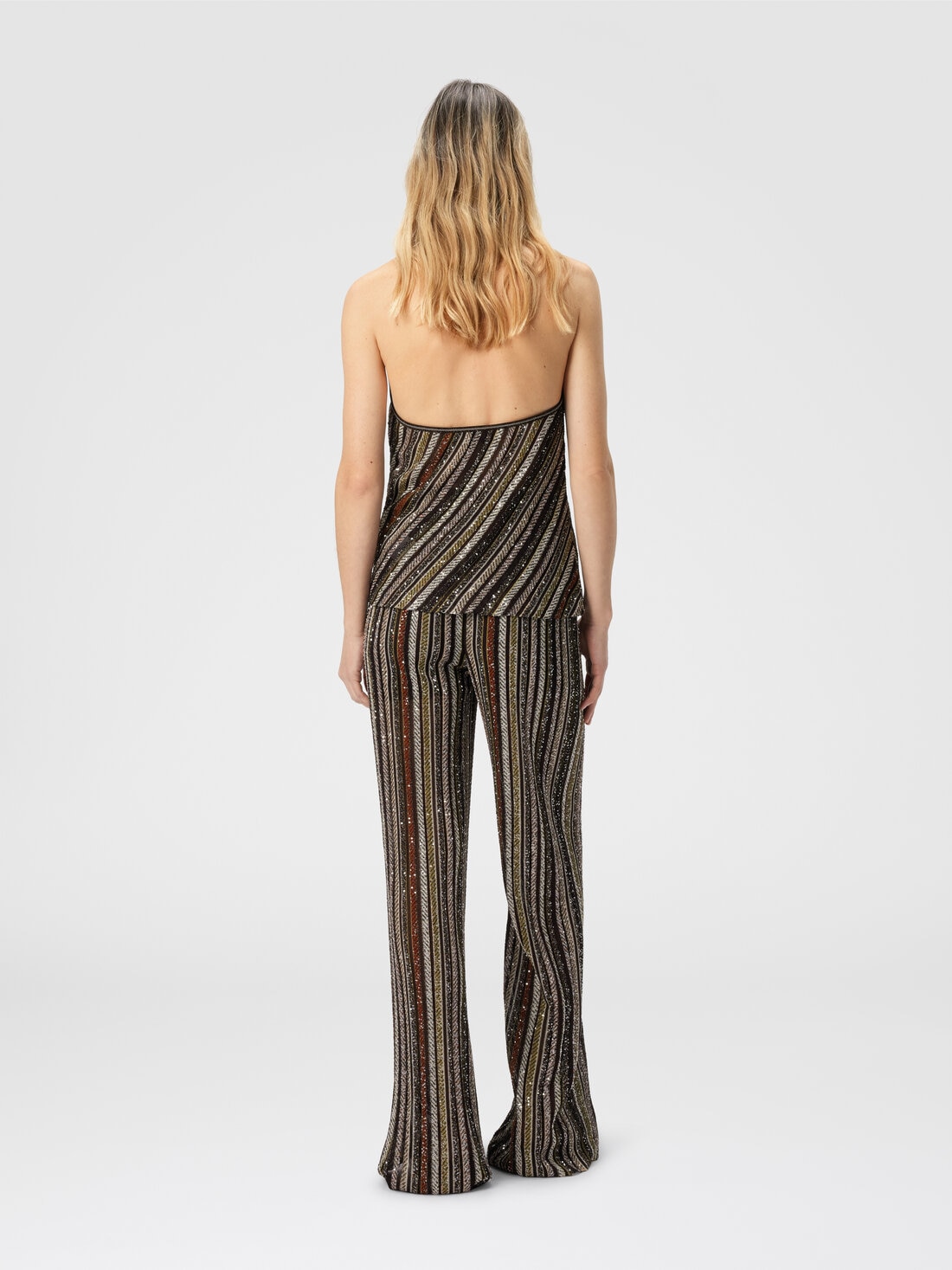 This women’s top represents Missoni’s artisan mastery, with halter neckline and refined herringbone striped knit. Adorned with sequins that add light, the piece embodies elegance and dynamism, creating a shimmering effect that draws attention with discretion and class.