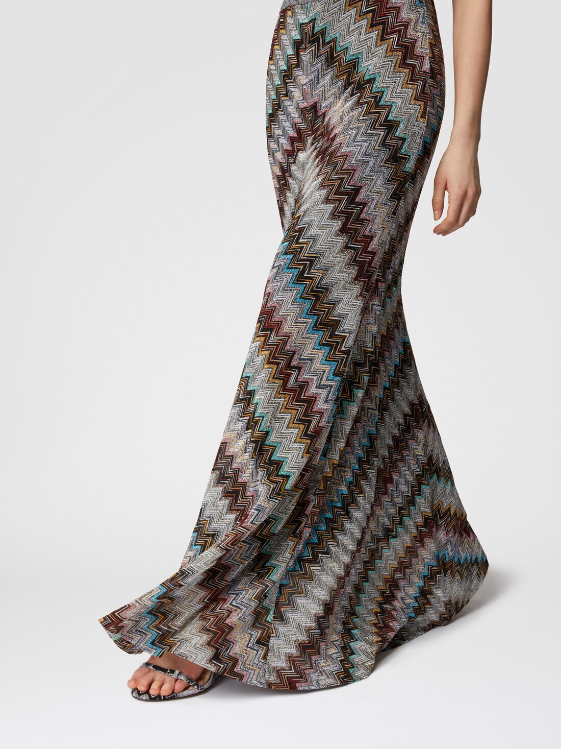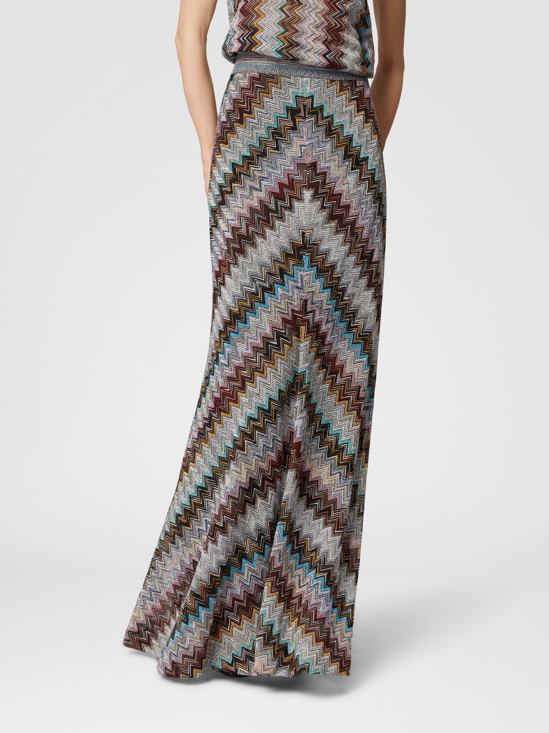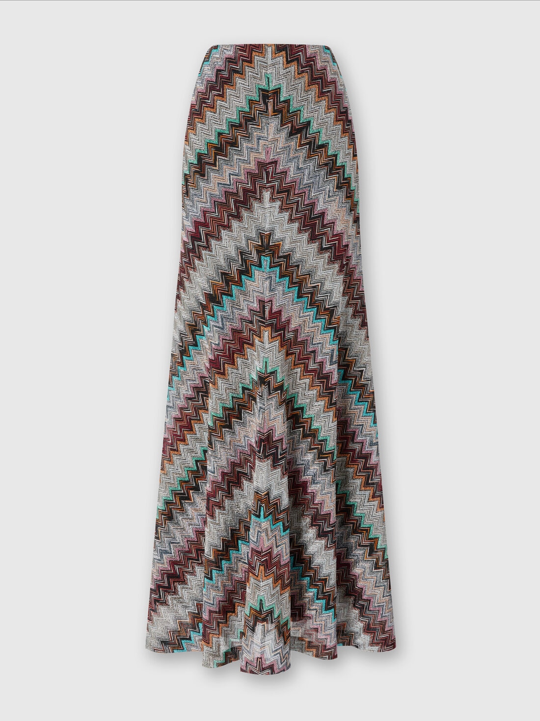 The iconic lamé zigzag creates a long skirt with a flared hem in a viscose blend with a raschel finish. It is impossible to find a more shimmering expression of Missoni's DNA.