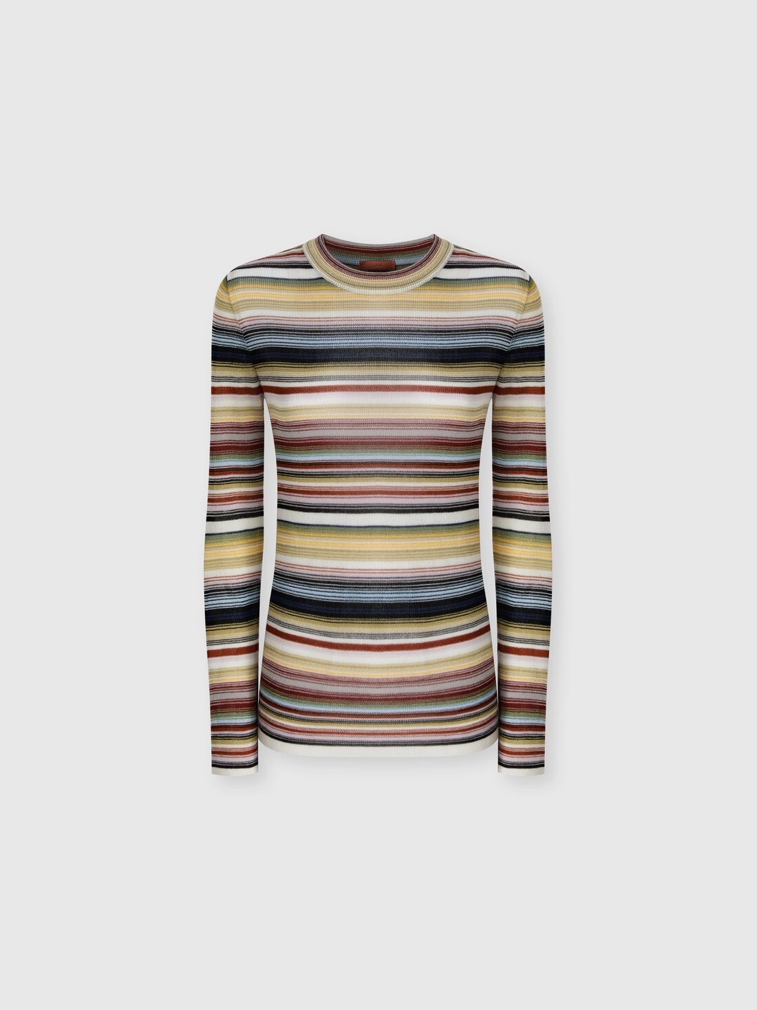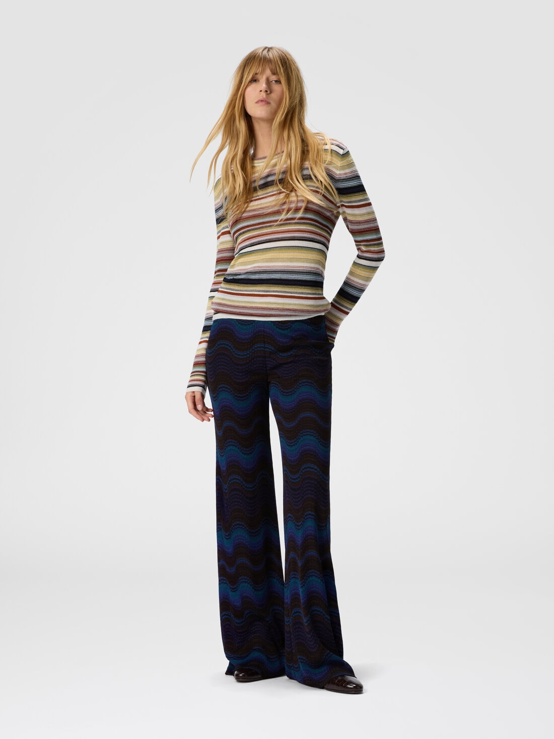 A contemporary reinterpretation of knitwear, designed for those who value both simplicity and personality. This women’s crewneck sweater is crafted in a wool-viscose blend. Its fluid construction reflects Missoni’s craftsmanship, resulting in a piece that fuses comfort, style, and identity into a clean, graphic statement.