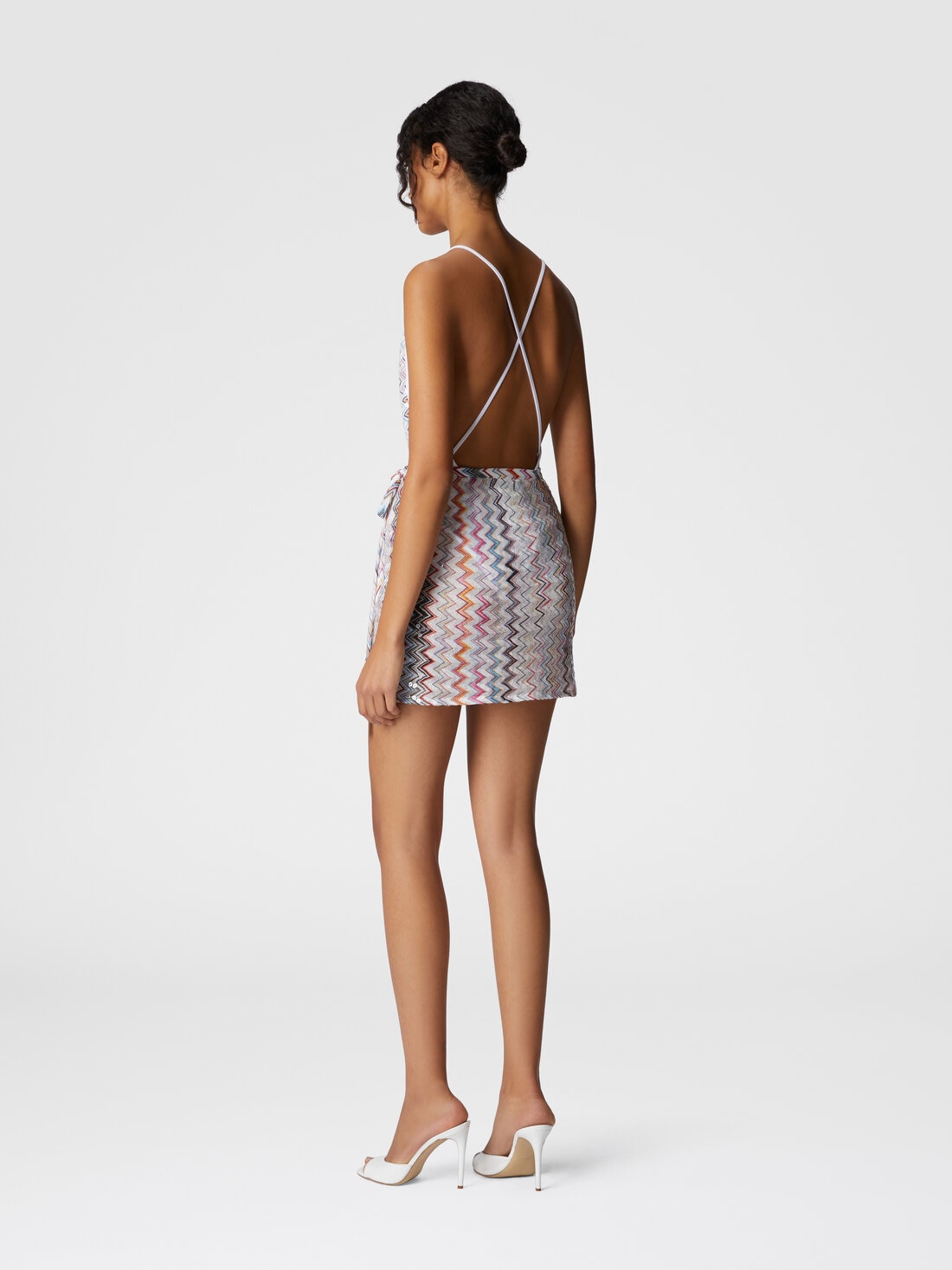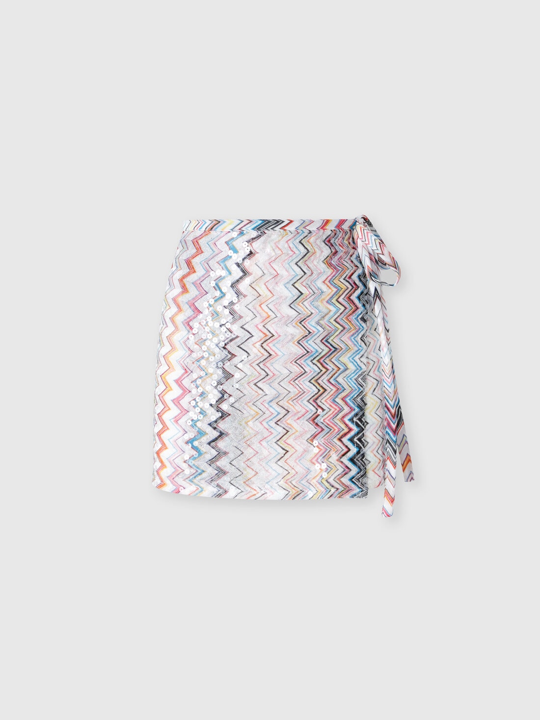 The wrap mini skirt with a side tie stands out with a ribbed Raschel design, enriched by the iconic zigzag pattern and sparkling sequin details. Ideal for adding a touch of glamour to summer outfits.