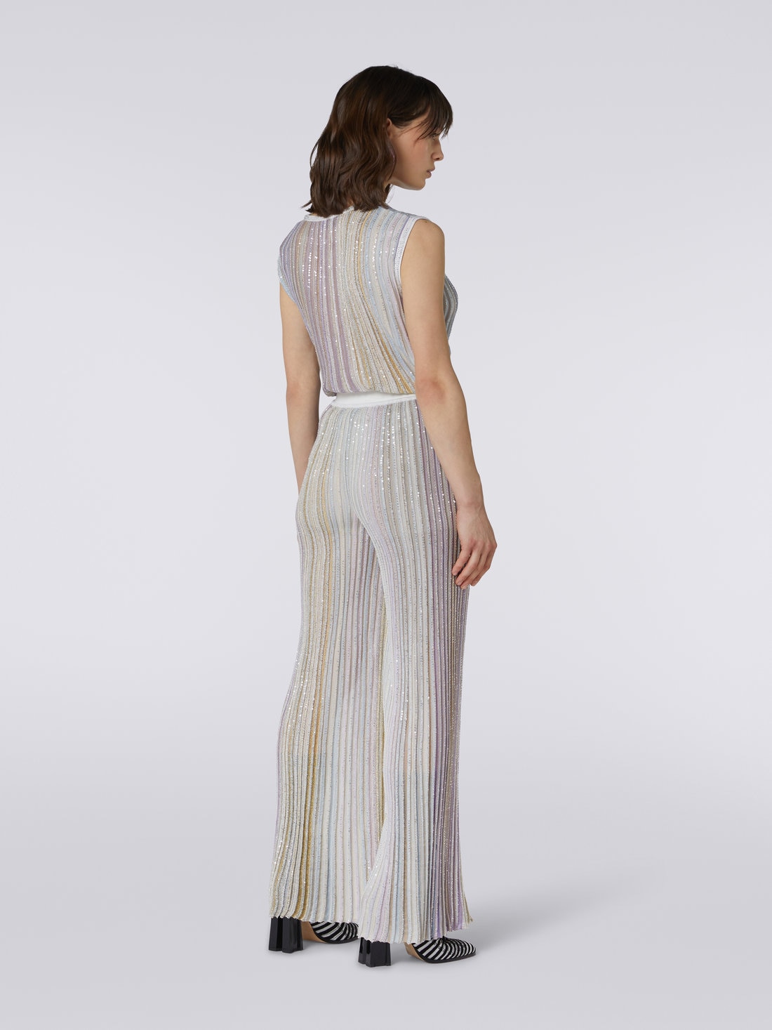 Entirely decorated with sequins, successive vertical stripes bring the women’s pleated trousers with a multicoloured palette to life. The flared piece, with a plain elasticated waistband, combines the Missoni DNA with a shimmering nightlife touch.