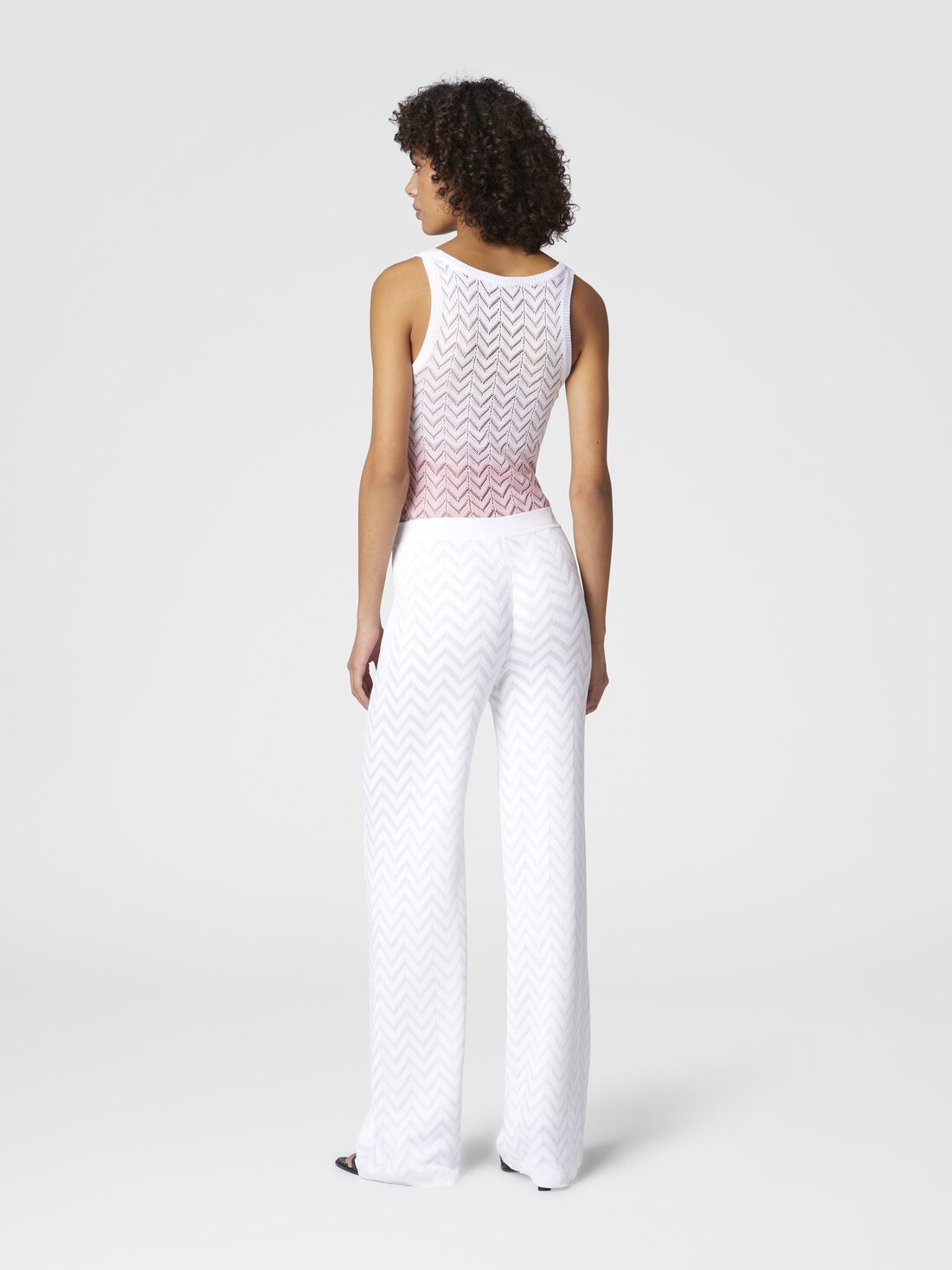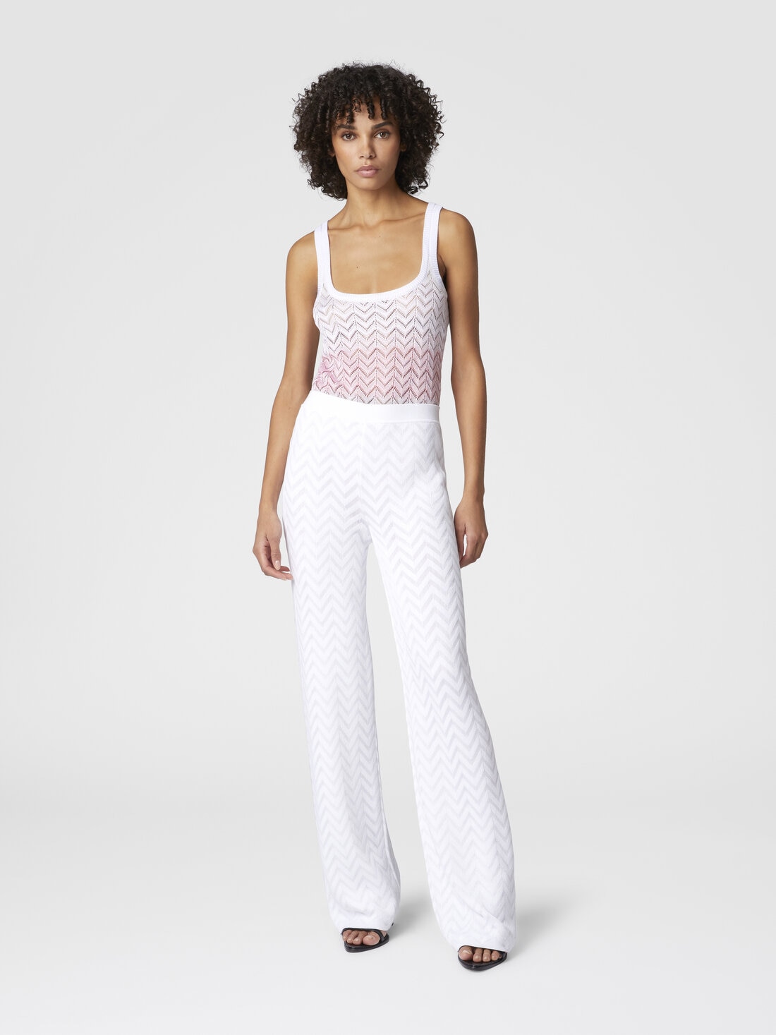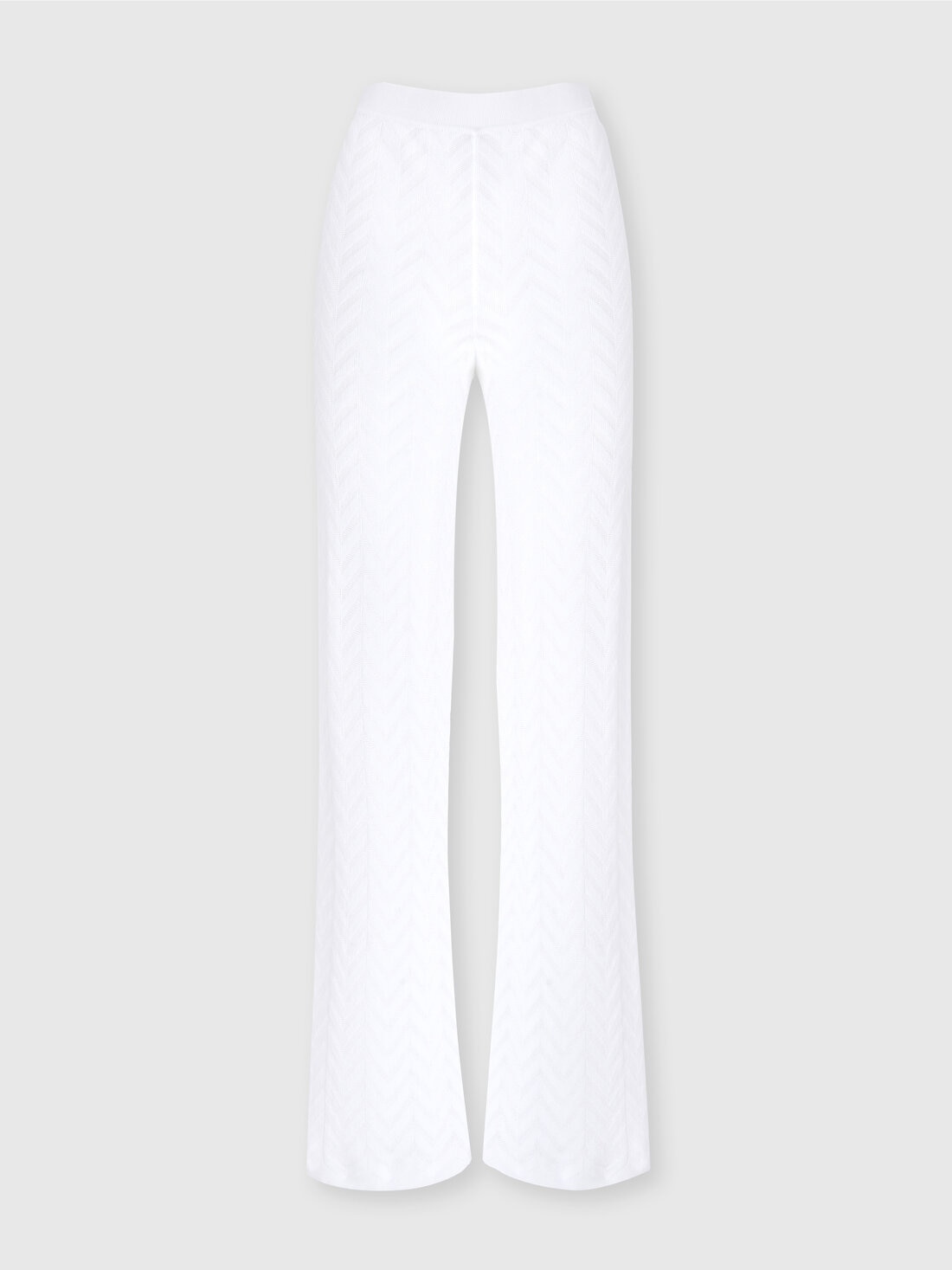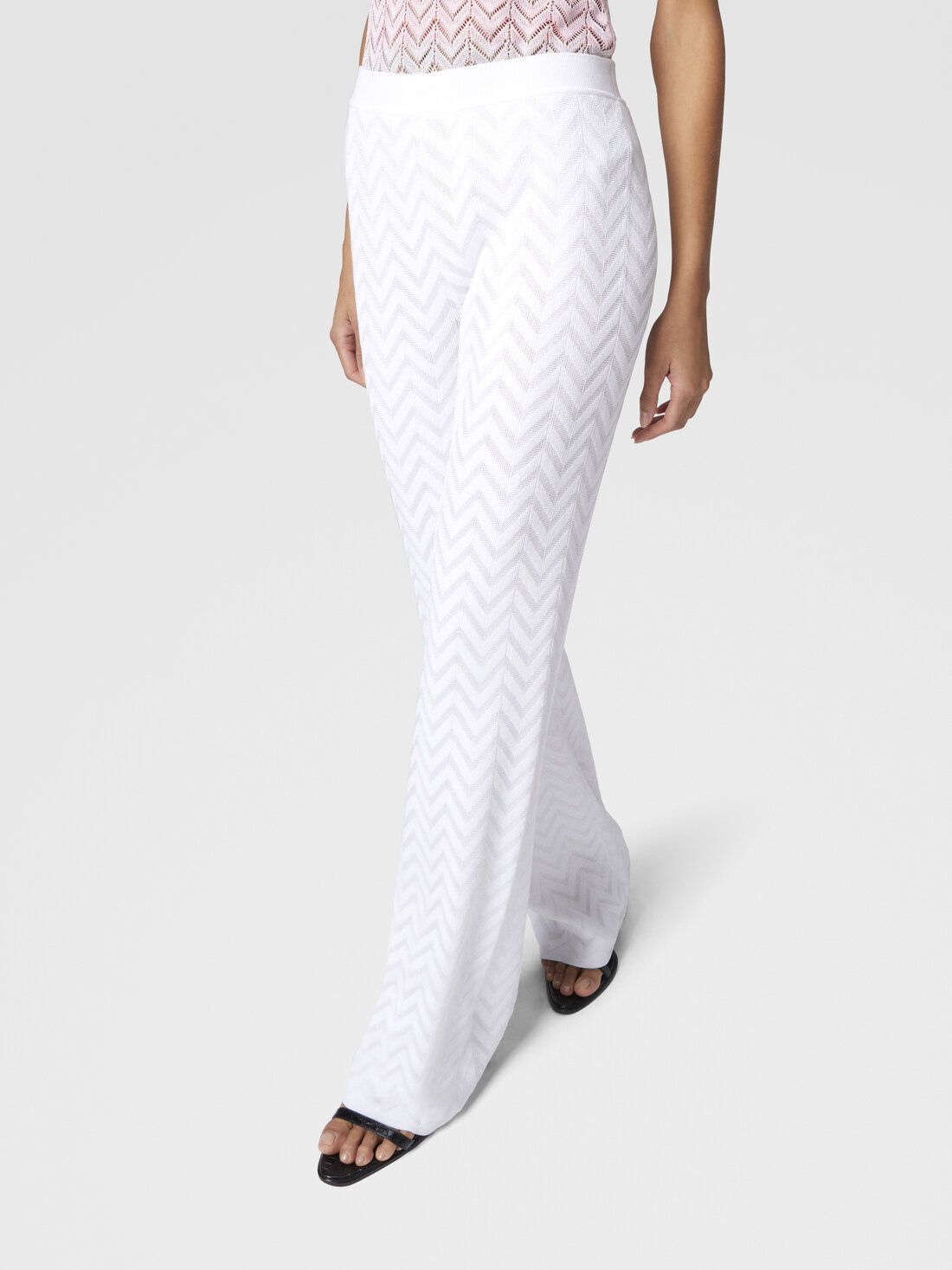 These straight jacquard trousers with a tonal chevron pattern embody the essence of Missoni's heritage. The minimalist design is combined with the practicality of the elastic waistband, ensuring comfort without compromising the intrinsic elegance of the worked fabric.