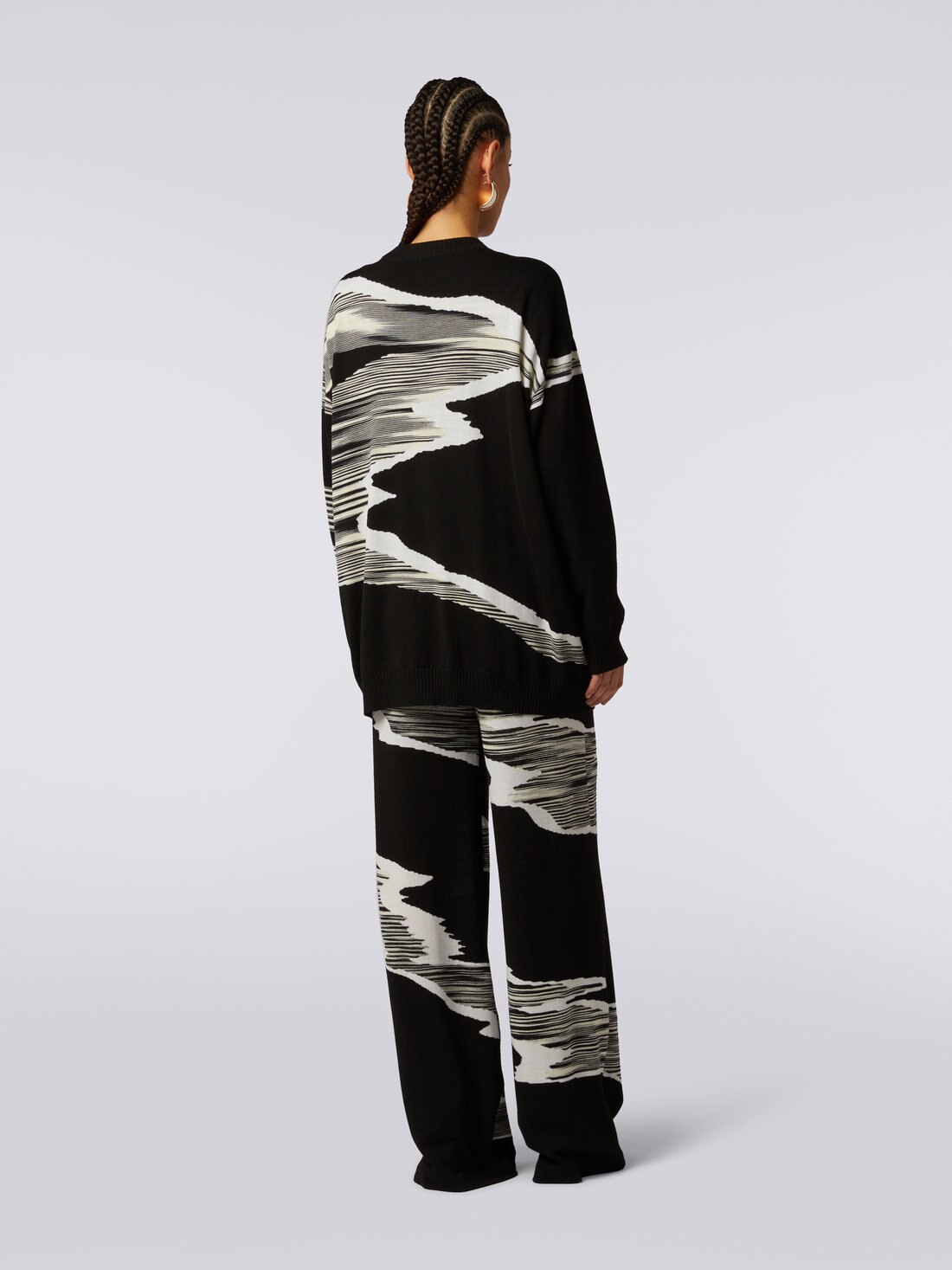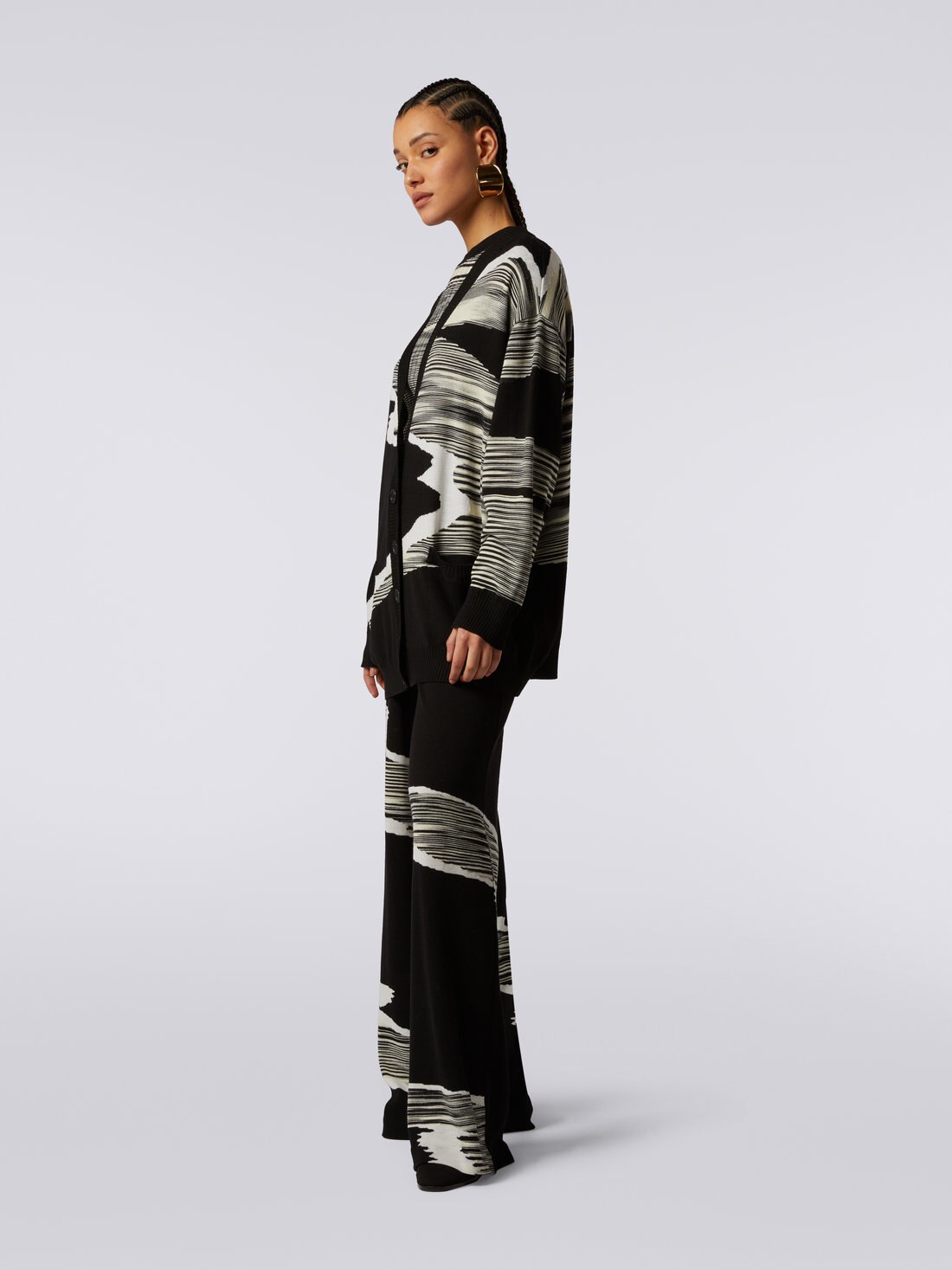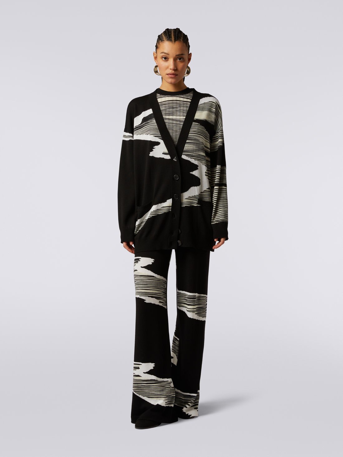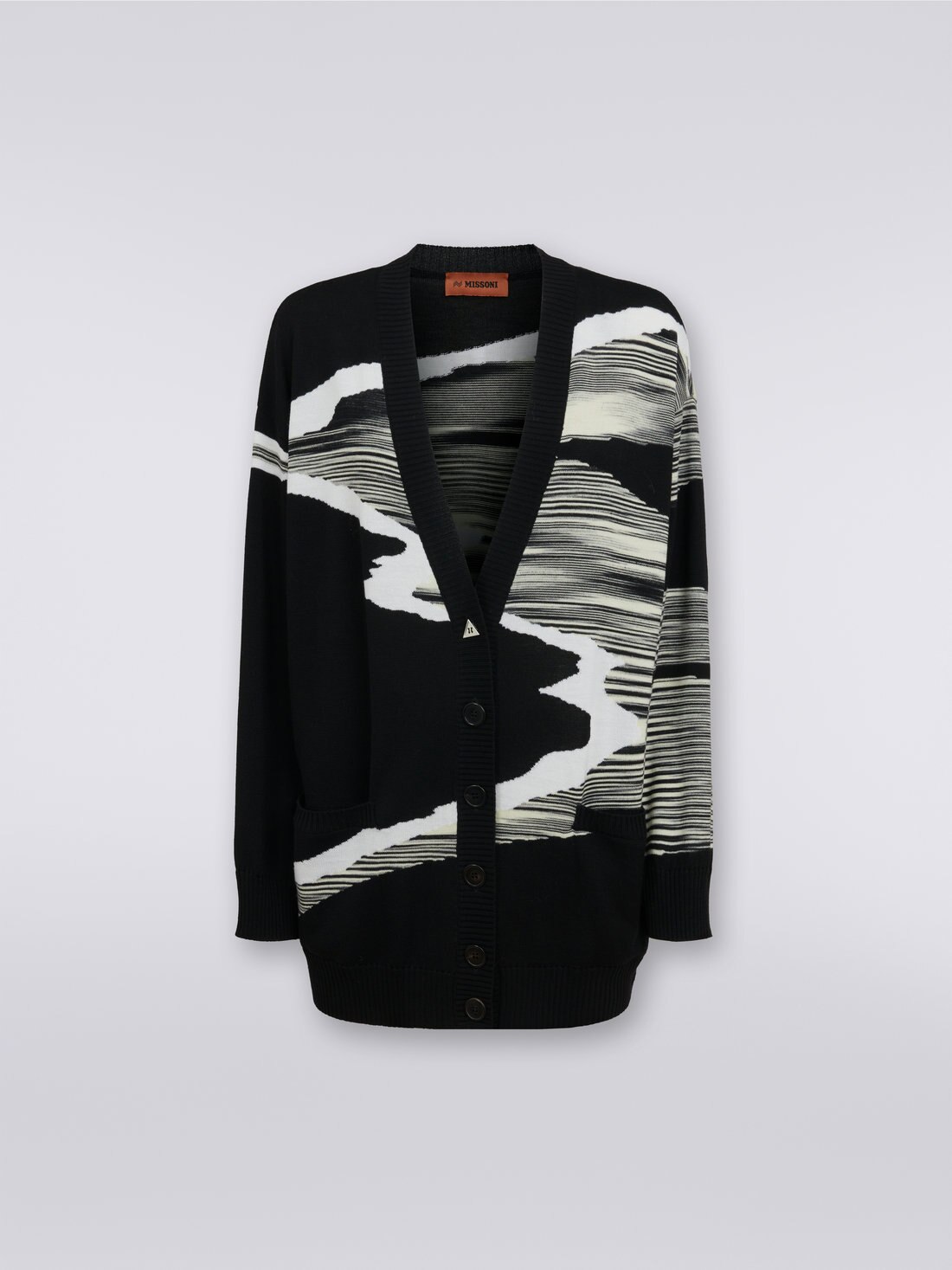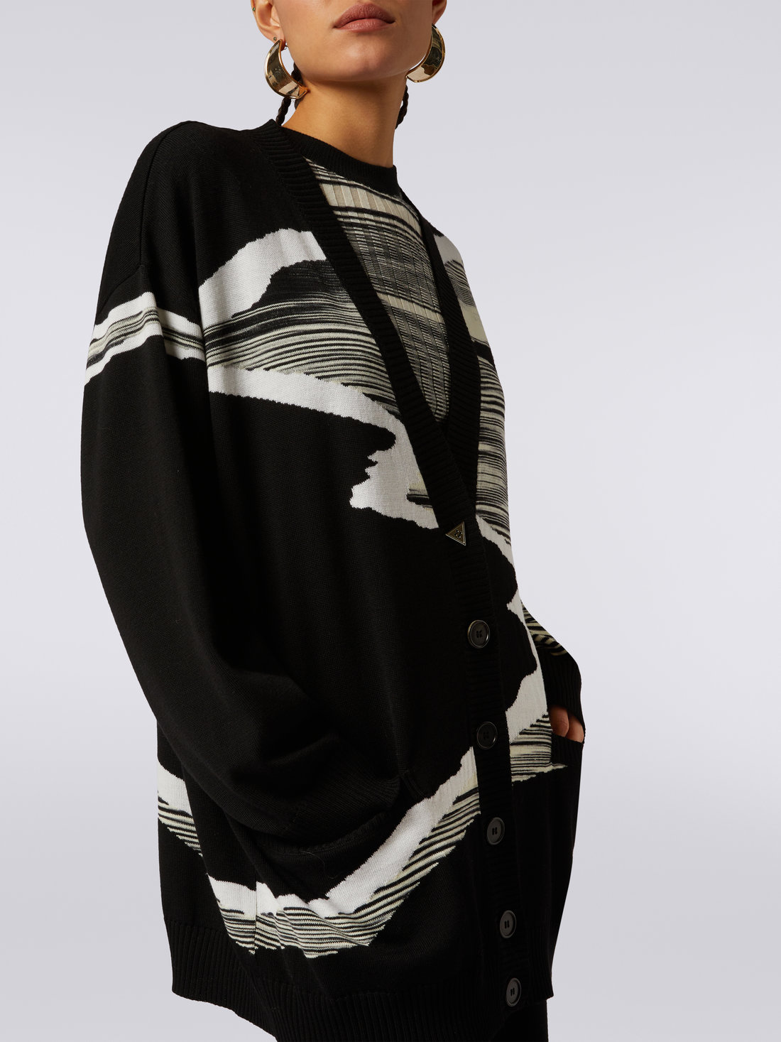 Impactful graphics thanks to the double colour treatment and inlay for the women’s 14-gauge wool cardigan. Enriched by a V neckline, the oversized piece will become the star of everyday casual looks.