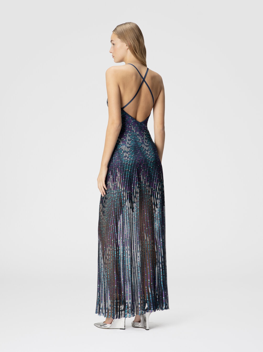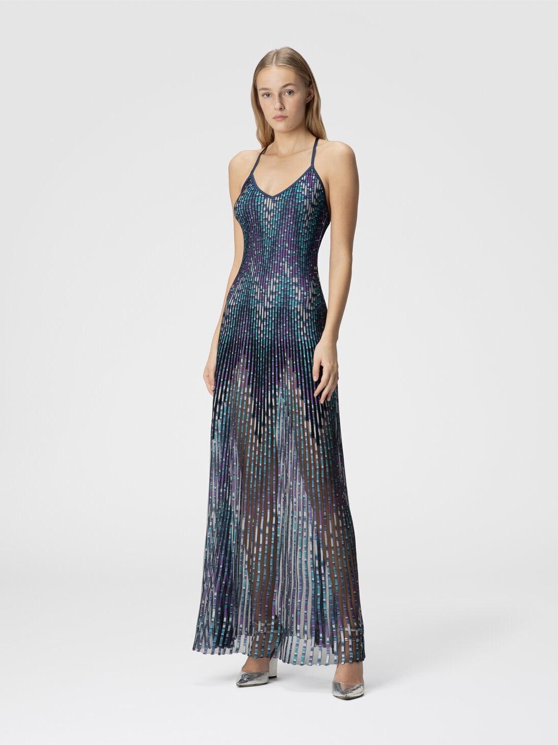The elegant criss-cross of the straps at the back adds a refined tone to the long dress. Made of viscose and wool blend knit, the garment is enriched by the particular partialized zigzag motif, which rewrites one of the Missoni must-haves in a contemporary way.