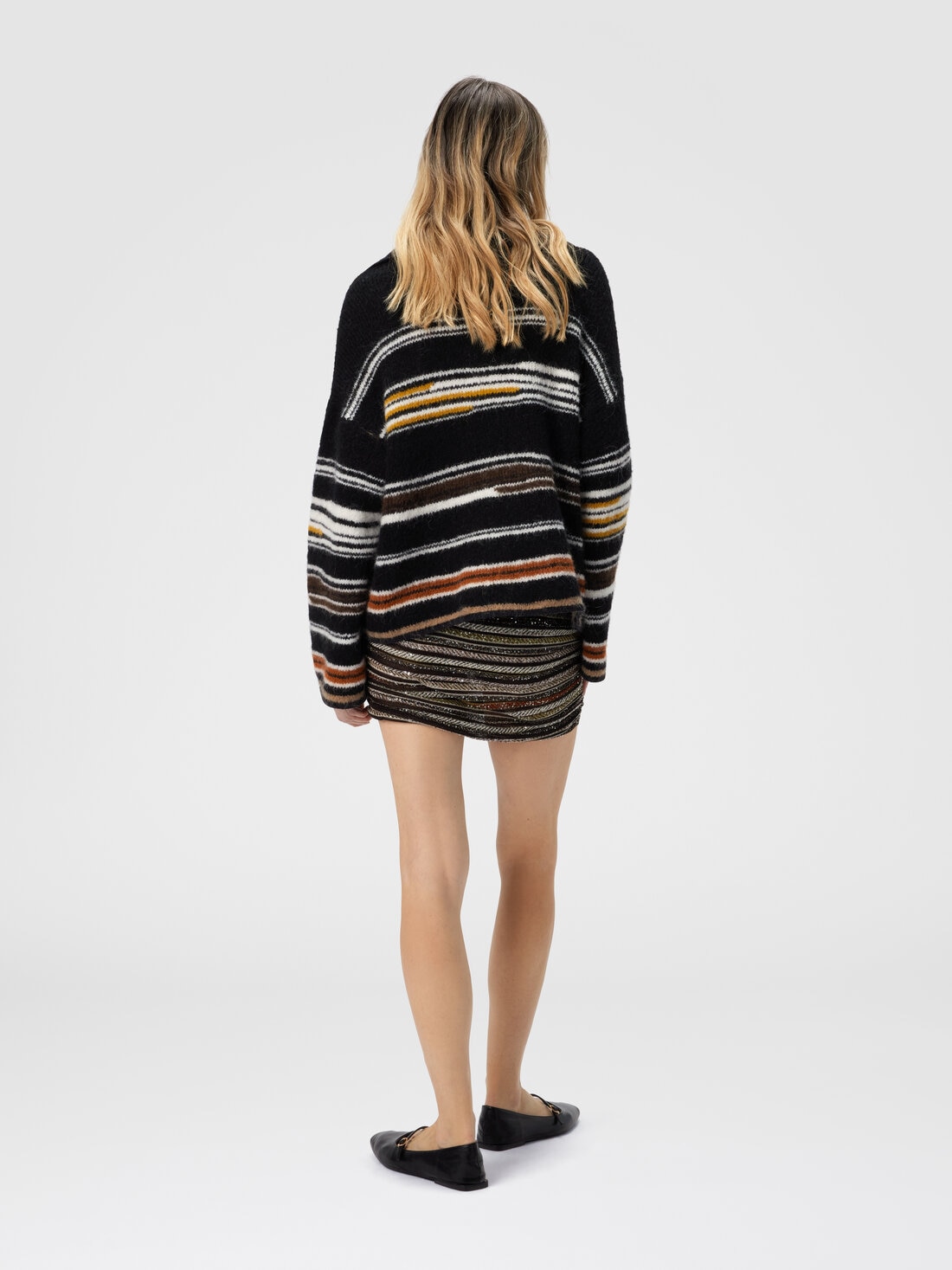 Oversized long-sleeve women’s polo sweater, made of striped intarsia knit in a precious blend of wool, mohair, and alpaca. The striped intarsia enhances the softness and lightness of the yarns, reflecting Missoni’s constant quest for quality and innovation in materials—typical of the brand’s craftsmanship.