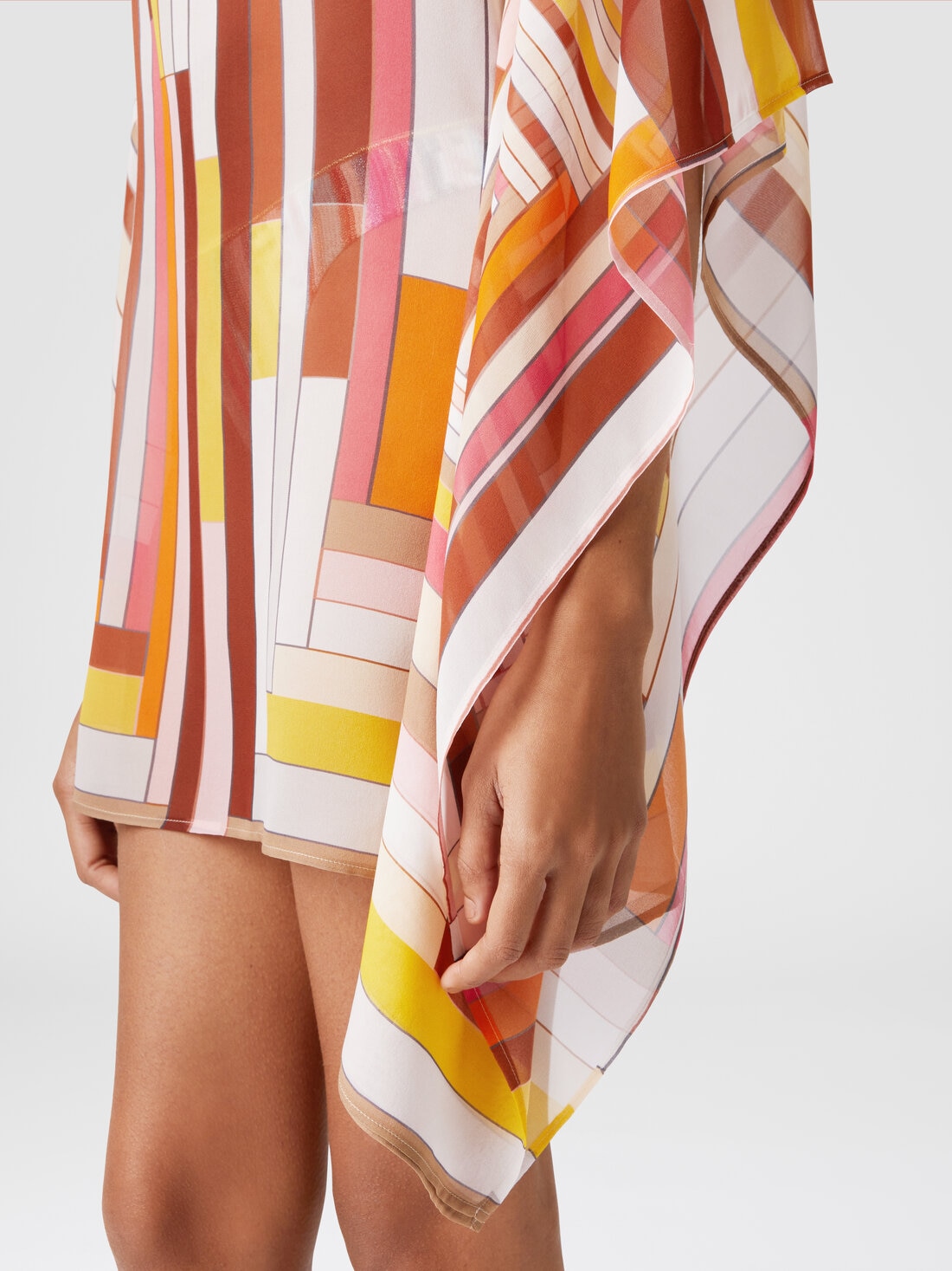 This short caftan, made of precious printed silk, stands out for its zigzag pattern, an unmistakable signature of Missoni. The wide sleeves and V-neck add a sense of lightness and sophistication, making it perfect for a chic summer look. The lightweight fabric and vibrant print make it a versatile garment, ideal for both the beach and for a refined summer look.