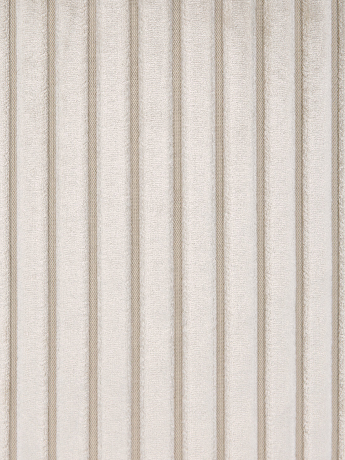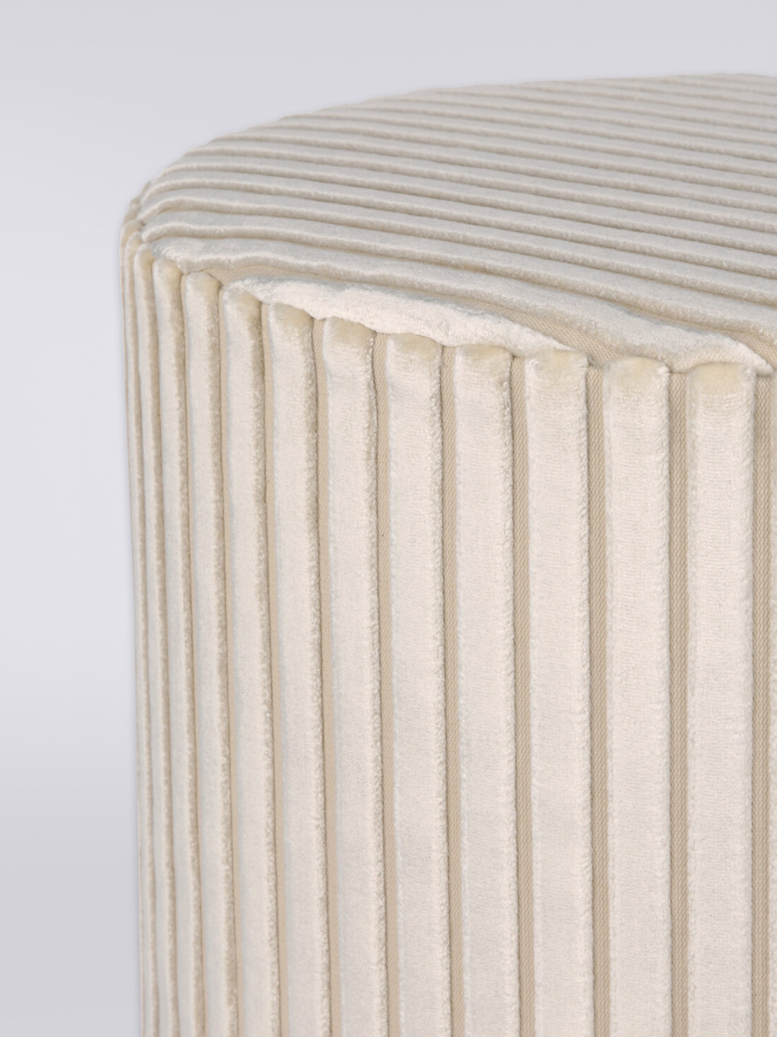 The 40x30 cm Coomba pouffe features a single colour block, interspersed with alternating vertical stripes of solid and opaque patterns, highlighting the materiality of chenille. This home accessory is made easier to move by the logo-imprinted leather handle.