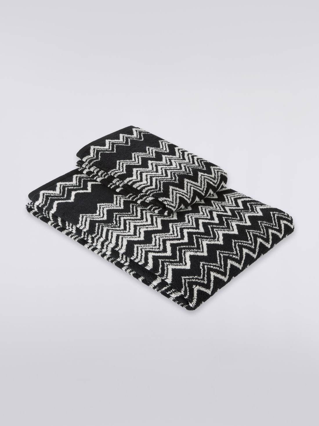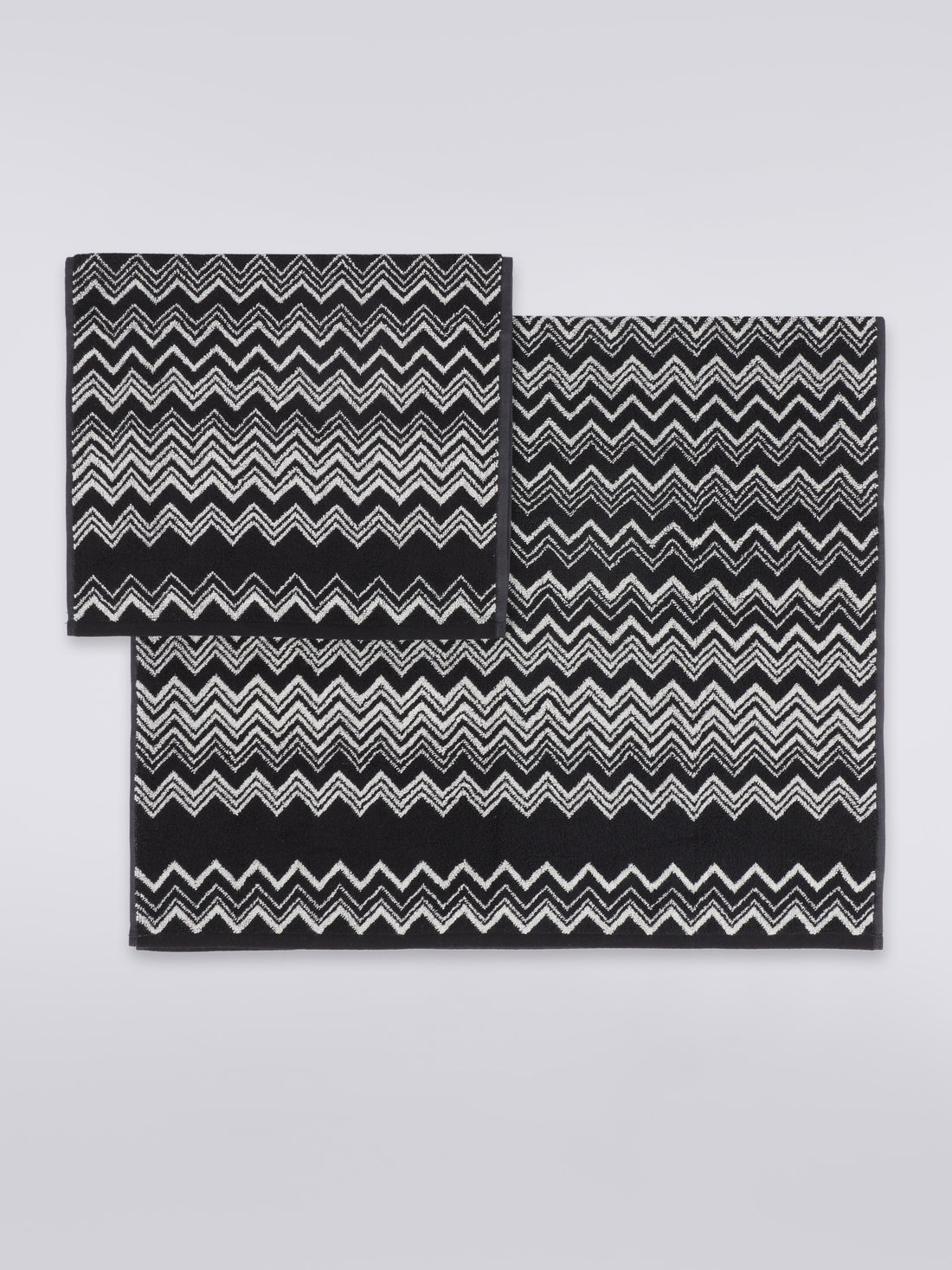 The hypnotic rhythm of Missoni's most iconic zigzag adds character to the soft 2-piece cotton terry Keith bath towel set. The perfect set of face and guest towels to brighten up the relaxation area of any home.