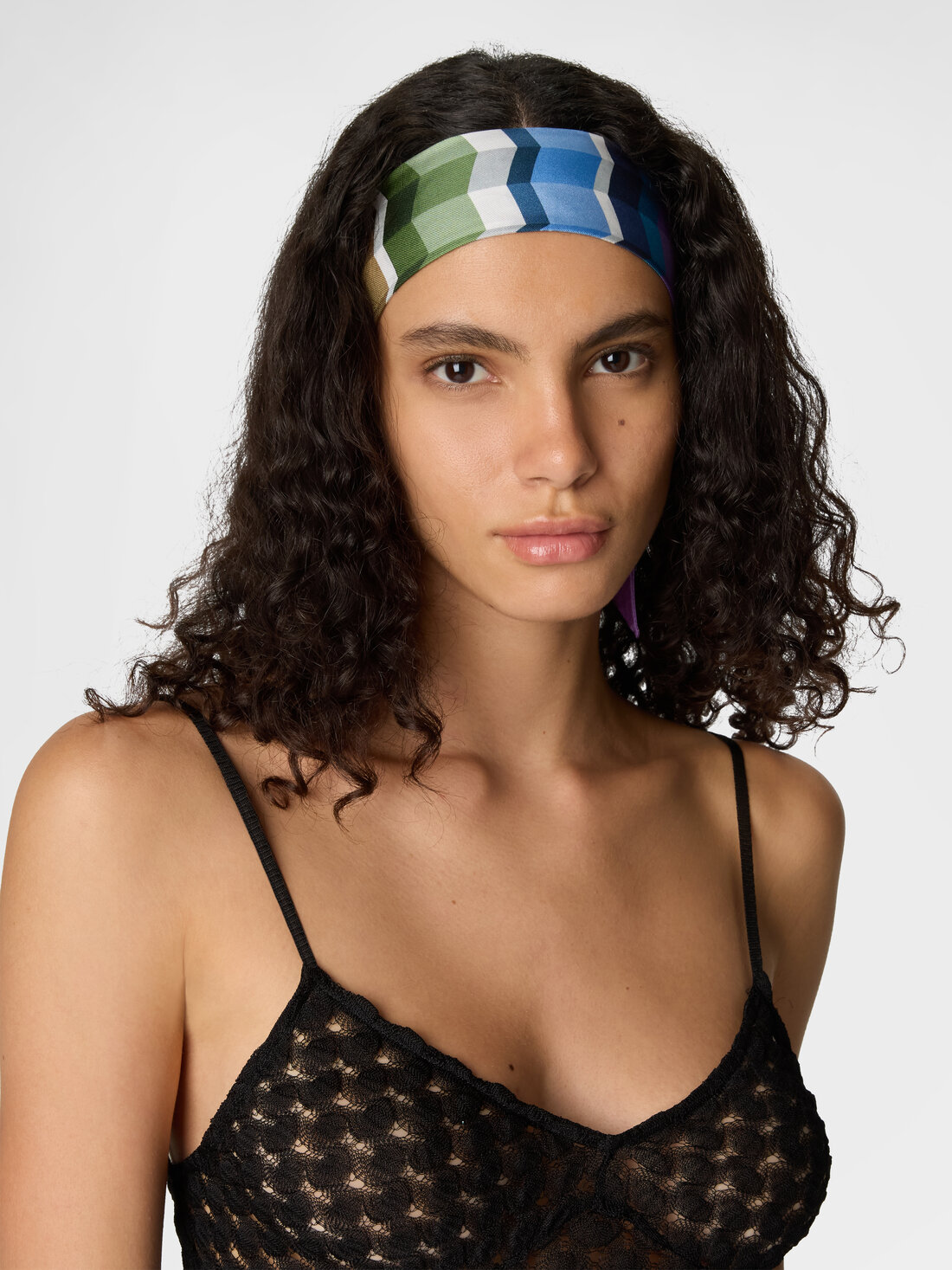 A women’s bandeau foulard in pure silk, embellished with a zigzag print and logo that completes the design. Soft and ultra-light, it can be worn as a hairband, neck bow, thin belt, or decorative bag accessory.