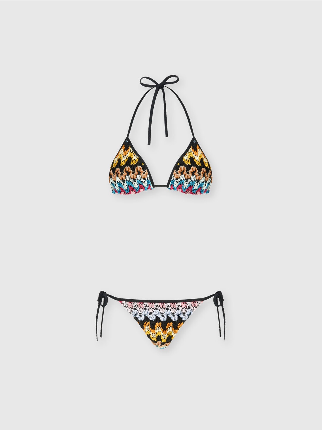Crafted from lamé viscose lace, this triangle bikini enhances the beauty and quality of the material with refined, luminous details. The delicate lace wraps the figure elegantly, while the zigzag pattern adds a touch of modern vibrancy. The triangle design enhances the natural shapes, offering a comfortable and feminine embrace.