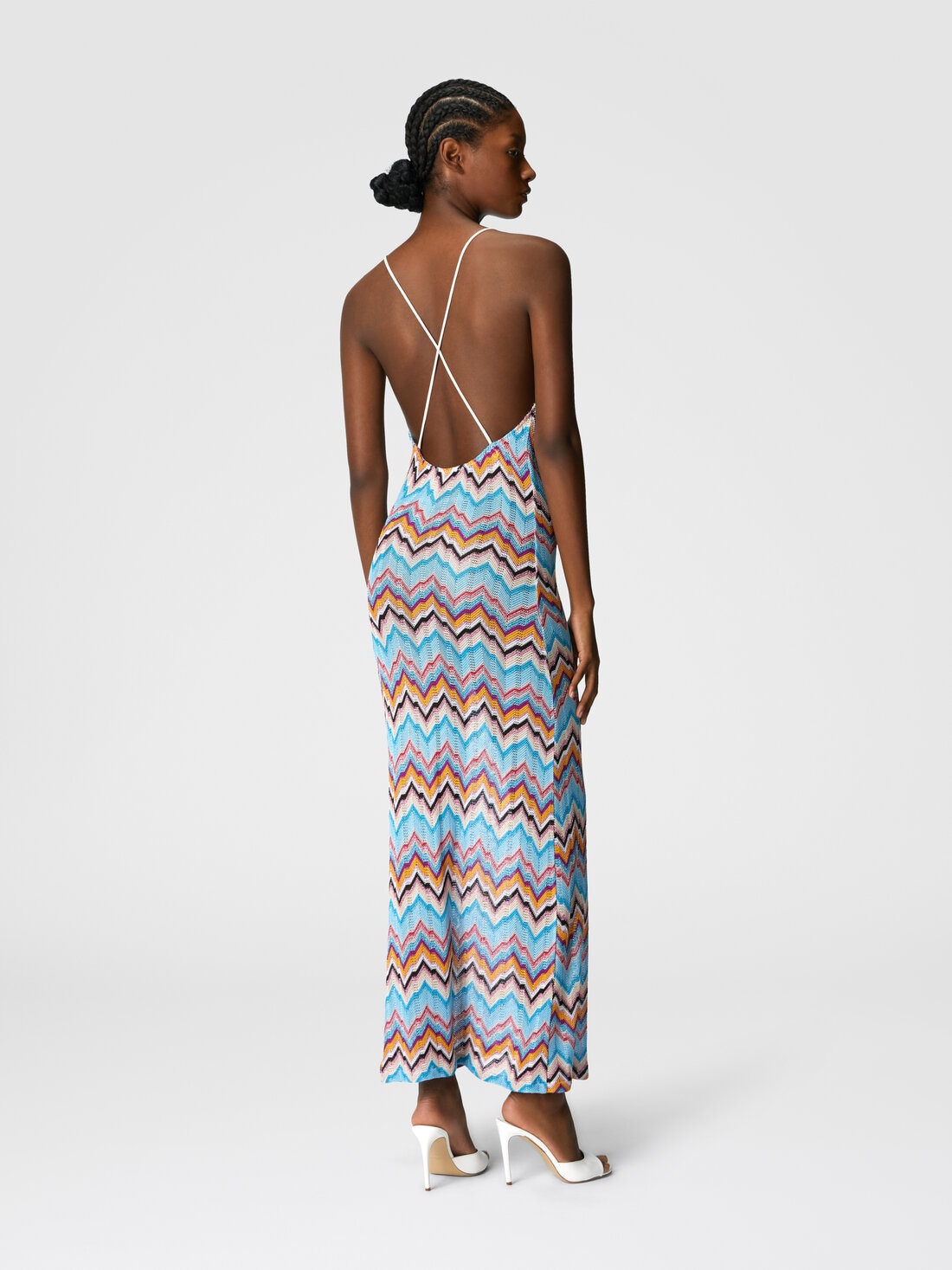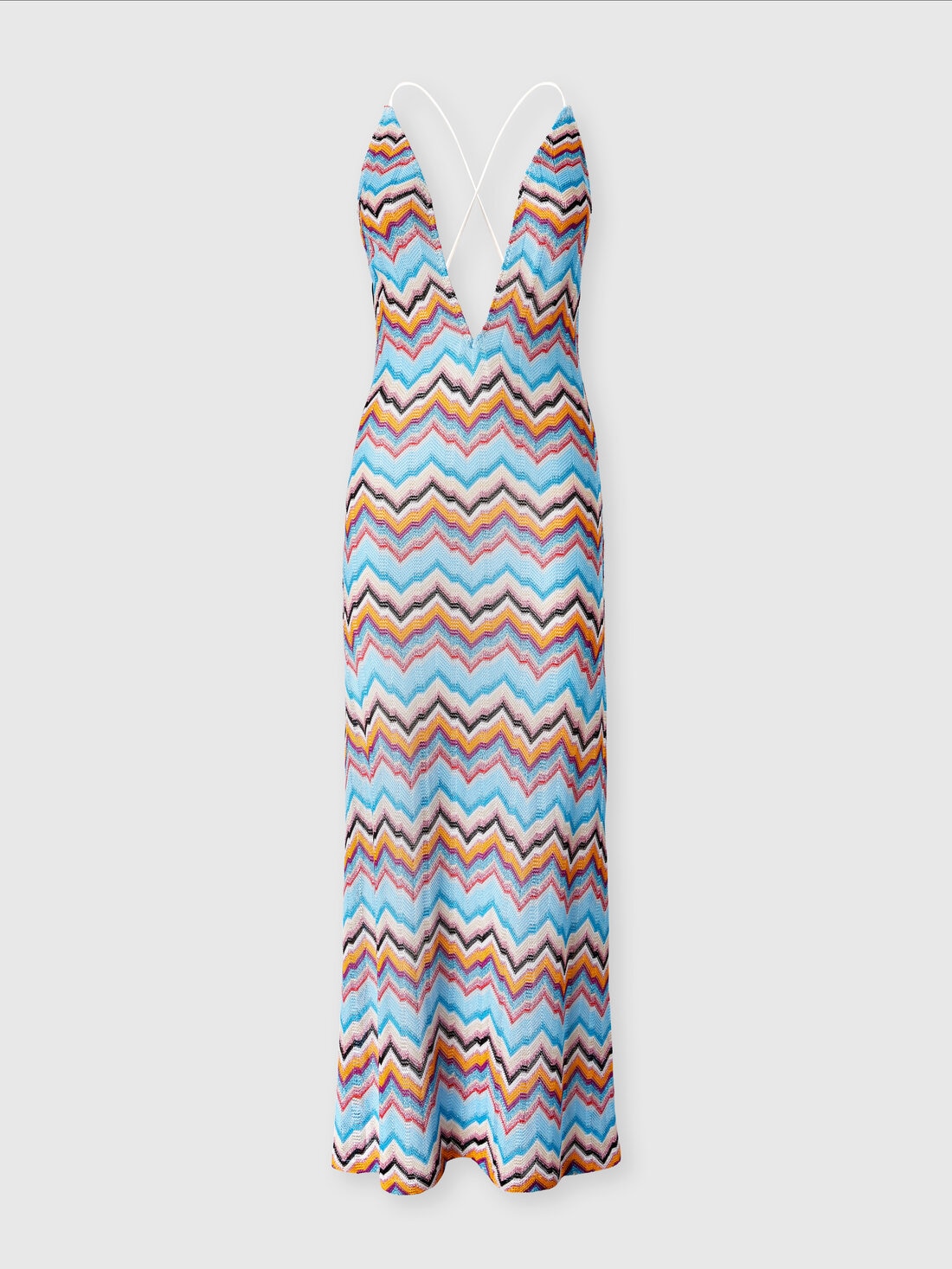 A long cover-up with a wide V-neckline and open back, standing out for the famous zigzag pattern of the maison. Made in viscose with lamé accents, it combines airy aesthetics and luxurious details for an unmistakable style.