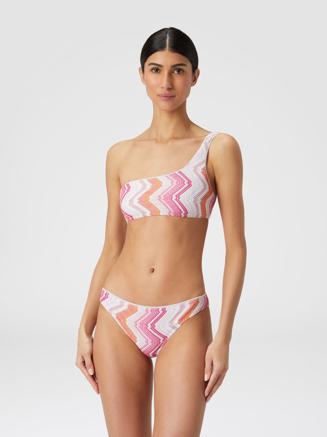 The chevron viscose blend bikini with lurex is an enchanting expression of style and sophistication. Composed of a one-shoulder bra and classic briefs, it is made of viscose-blend knit enriched with lurex threads that give a bright and seductive effect.
