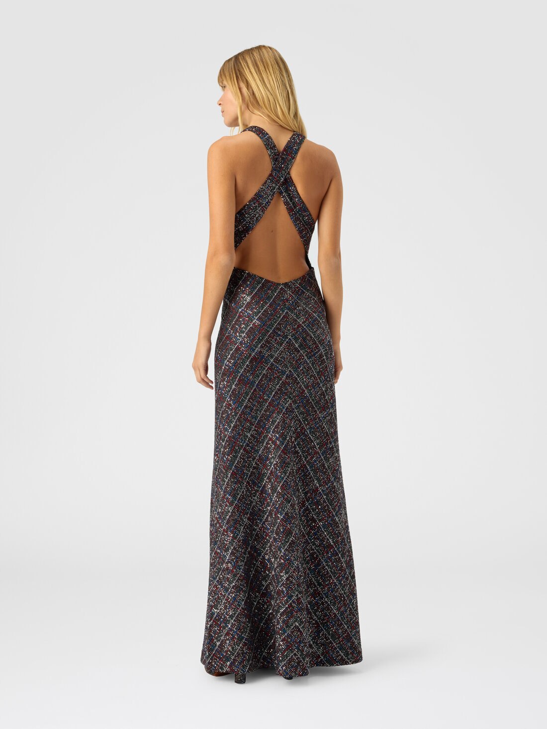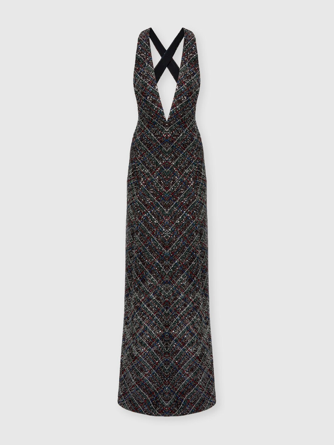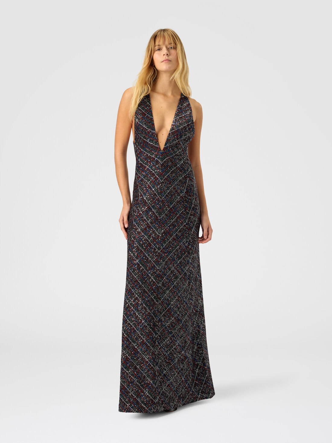 Covered in elegant sequins, this long V-neck dress with criss-cross back straps evokes bold, sophisticated femininity. Made on a Caperdoni loom, the fabric features an embroidered check pattern reminiscent of the iconic zigzag, enhanced with lamé threads for a discreet shine. The fluid silhouette and rear strap design create a play of lines that flatter the figure with elegance—perfect for a high-style evening.