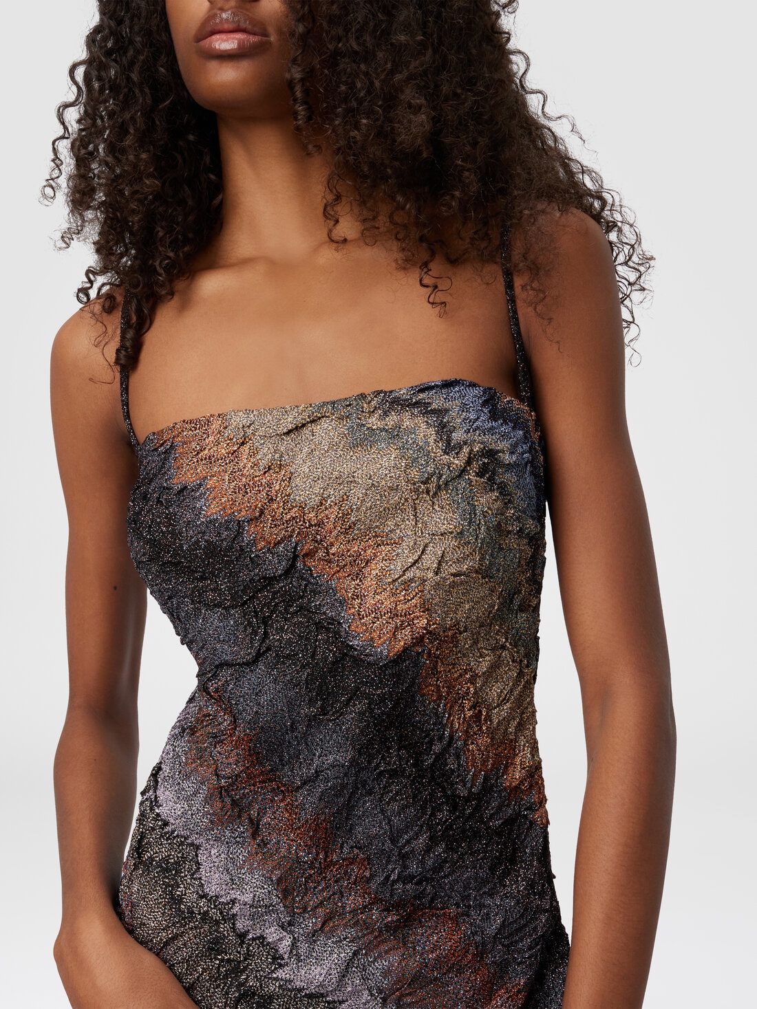 A women’s mini dress that catches the eye: this sleeveless Missoni piece combines boldness and elegance with a snake-pattern raschel knit, further energized by a pleated effect. Lamé threads enhance the fabric’s brilliance, creating vibrant reflections.