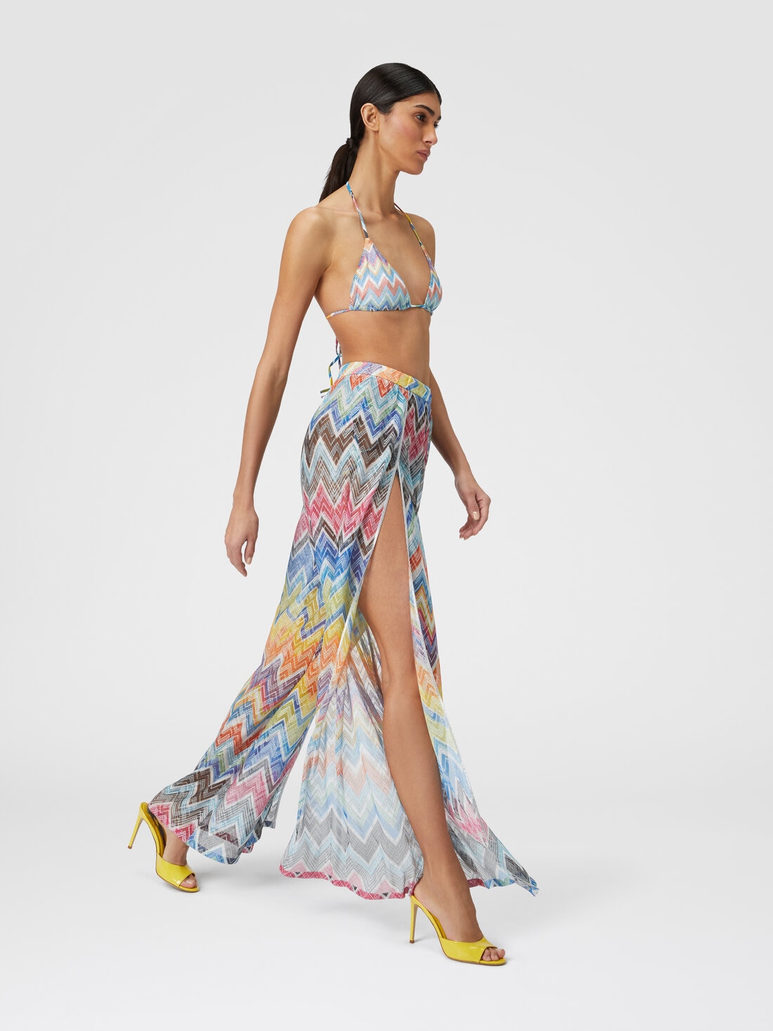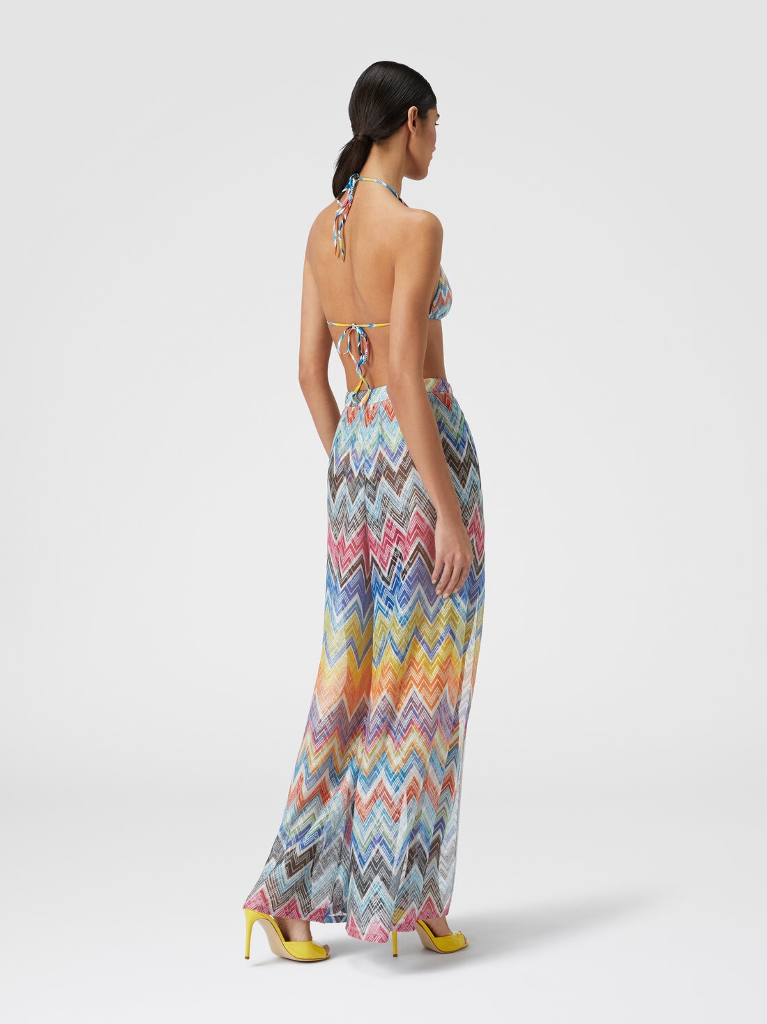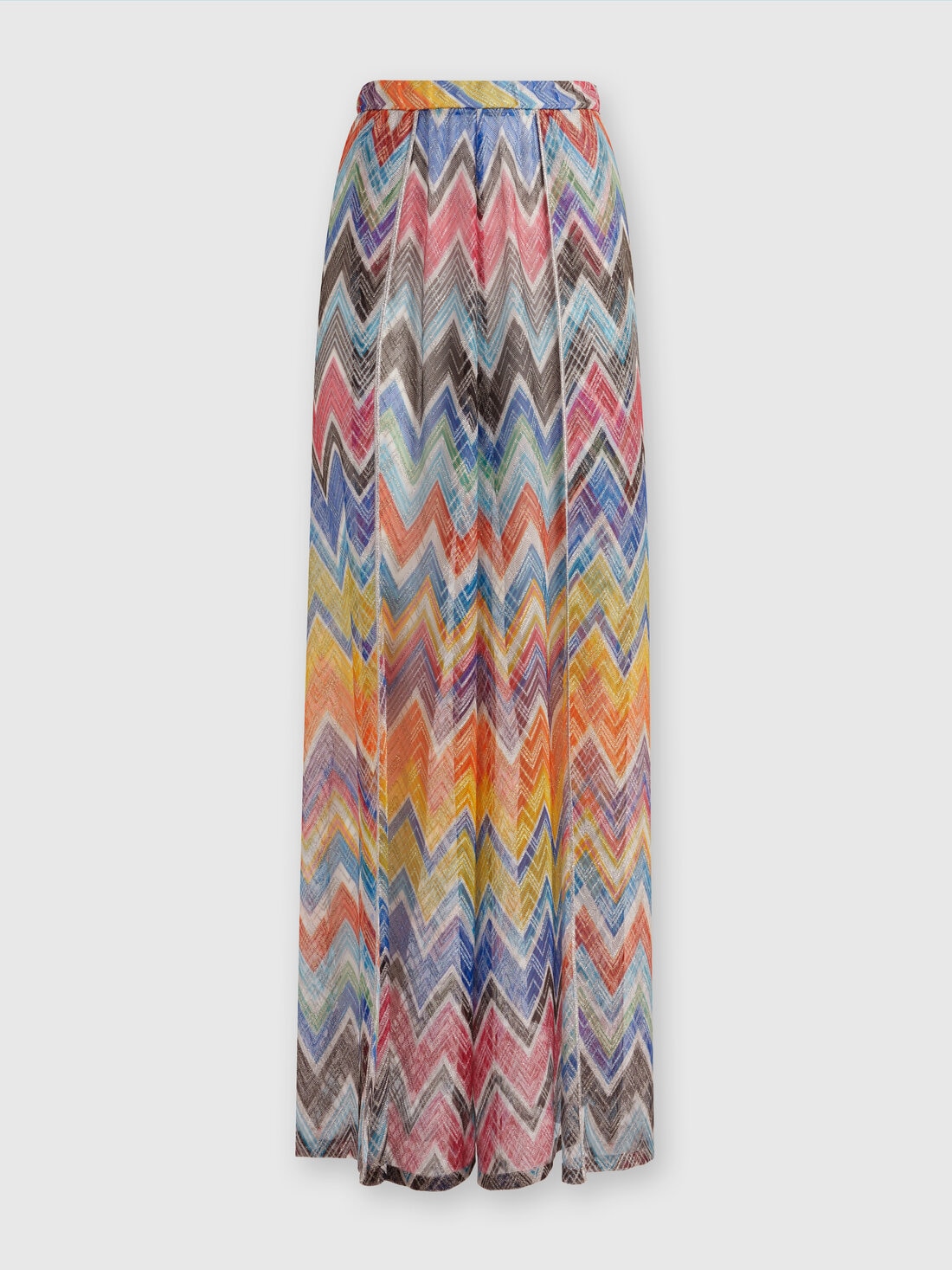 These women's palazzo trousers combine the comfort of trousers with the fluidity and femininity of a wide, sinuous skirt. Made from a lightweight viscose-blend zigzag knit, the Missoni trousers are embellished with fine lurex threads and feature two elegant front slits, adding a touch of sophistication to the look.