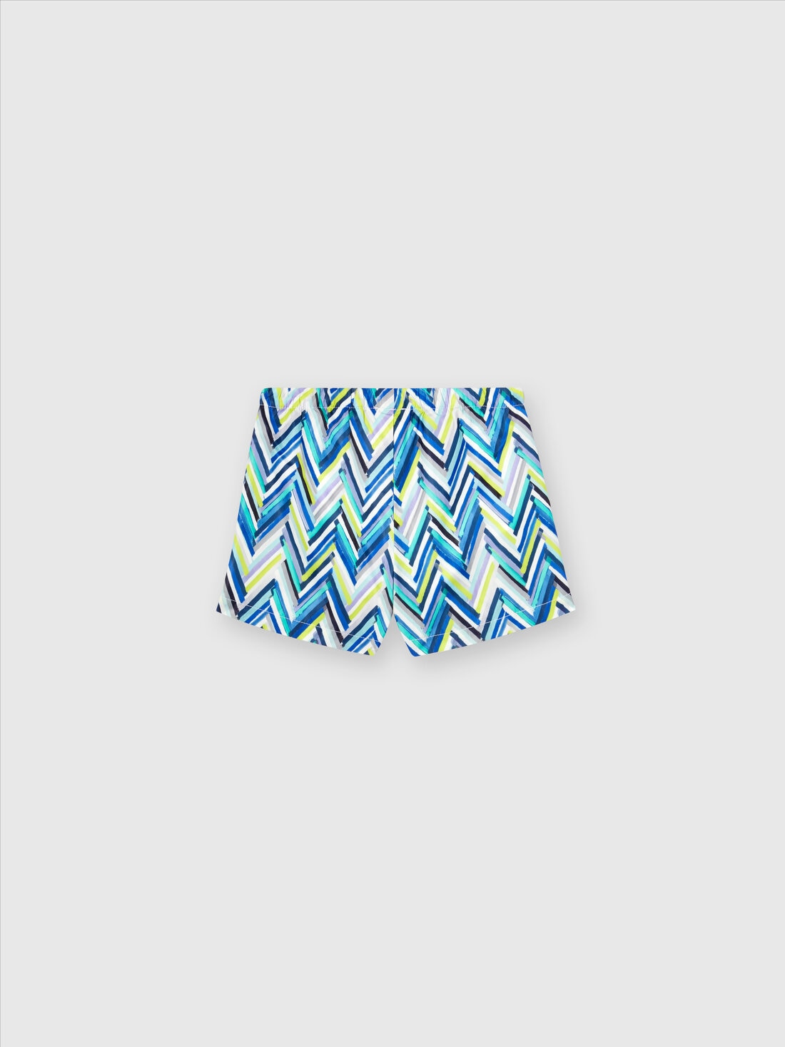 Combining comfort with style: introducing Missoni’s children's short swimming trunks. Completely covered by the chevron pattern, the model features an elasticated waistband and contrasting logo lettering.