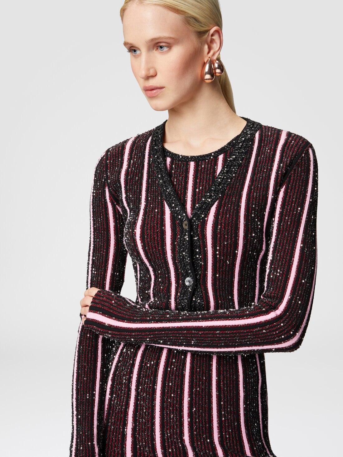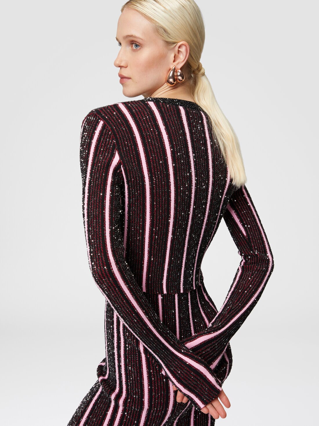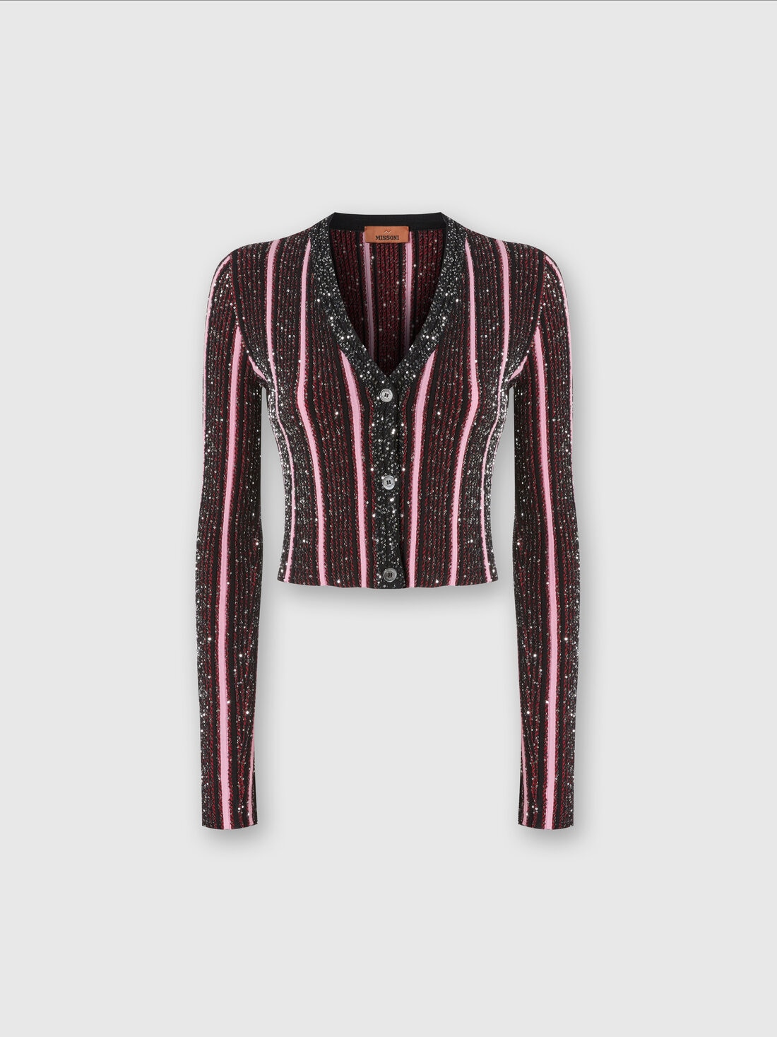 Ribbed knitting, vertical stripes and sequin appliqués: this is how the micro-cardigan, with buttons and V-neckline, conquers a place as the absolute protagonist of the evening look.
