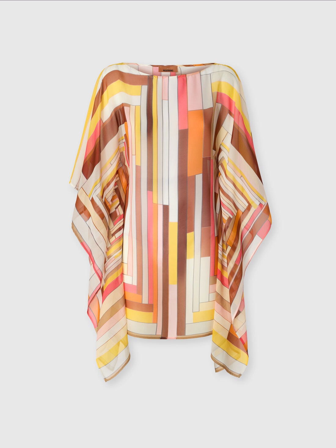 This short caftan, made of precious printed silk, stands out for its zigzag pattern, an unmistakable signature of Missoni. The wide sleeves and V-neck add a sense of lightness and sophistication, making it perfect for a chic summer look. The lightweight fabric and vibrant print make it a versatile garment, ideal for both the beach and for a refined summer look.