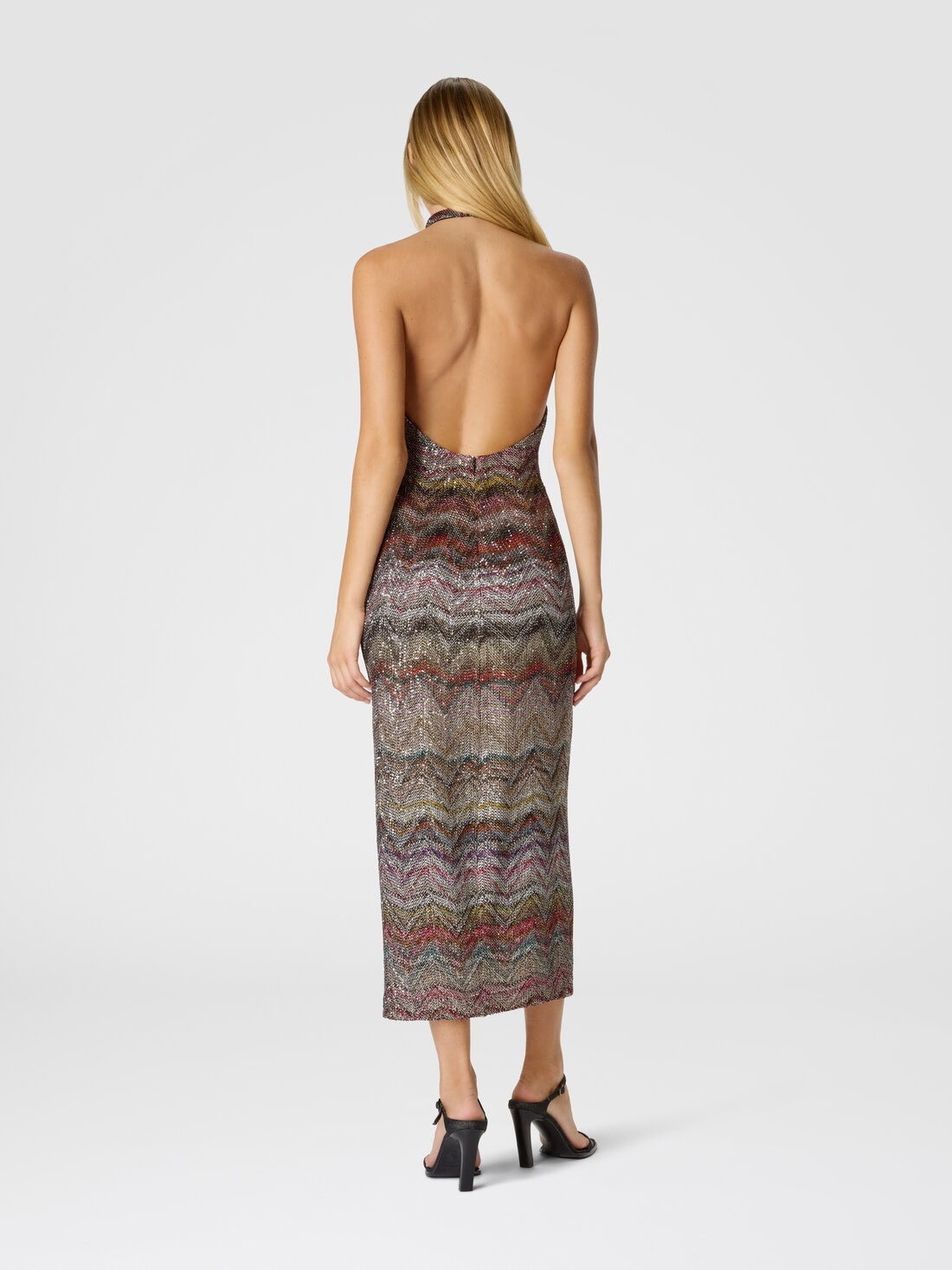 This sophisticated women’s midi dress features a halter neckline and high collar, designed to enhance the figure with elegance. Made using the exclusive Caperdoni loom, it’s enriched with a zigzag pattern woven with lamé threads and sequins, creating an iridescent, refined fabric. Its clean lines and subtle brilliance make it ideal for evening events or special occasions.