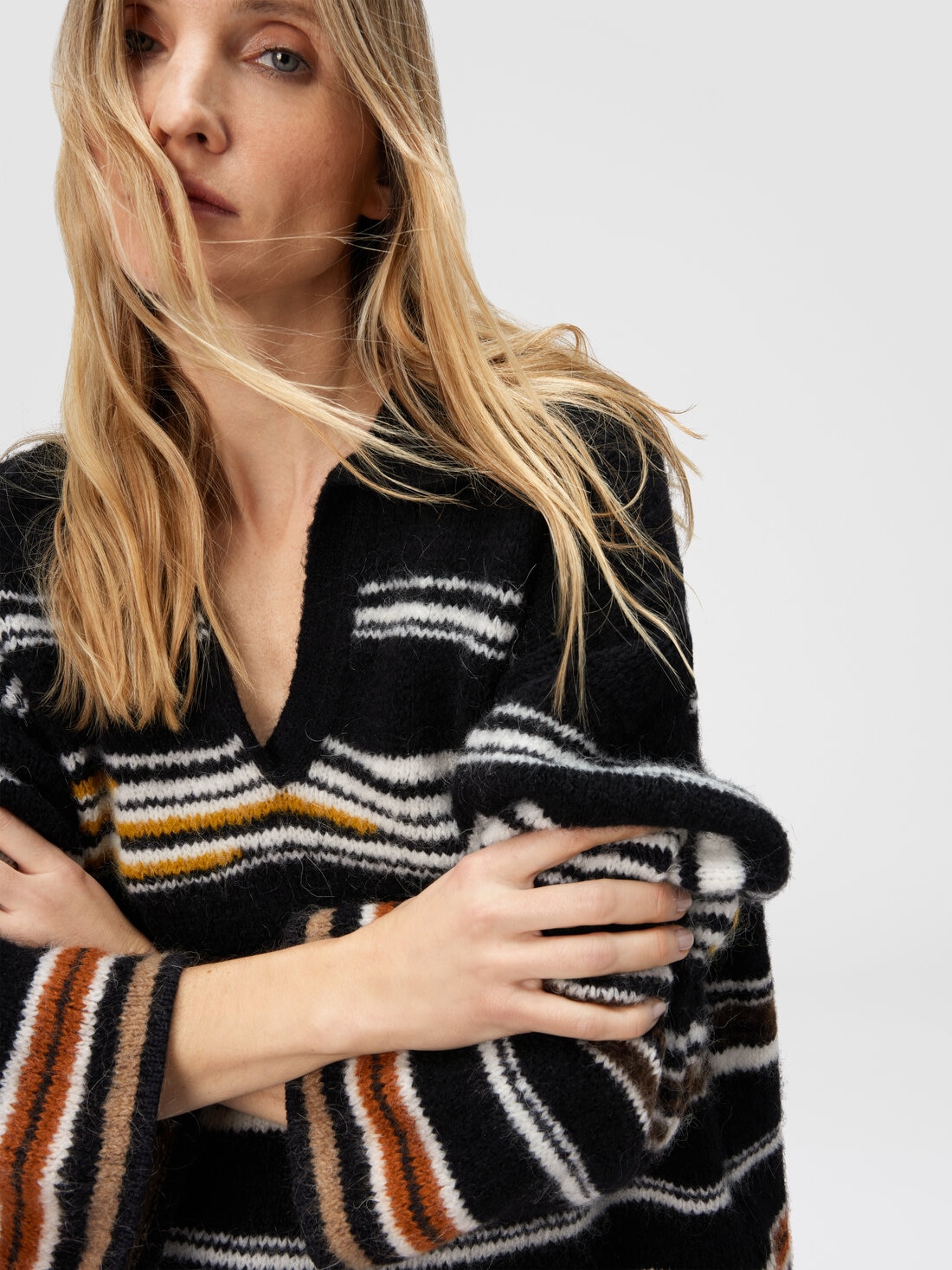 Oversized long-sleeve women’s polo sweater, made of striped intarsia knit in a precious blend of wool, mohair, and alpaca. The striped intarsia enhances the softness and lightness of the yarns, reflecting Missoni’s constant quest for quality and innovation in materials—typical of the brand’s craftsmanship.